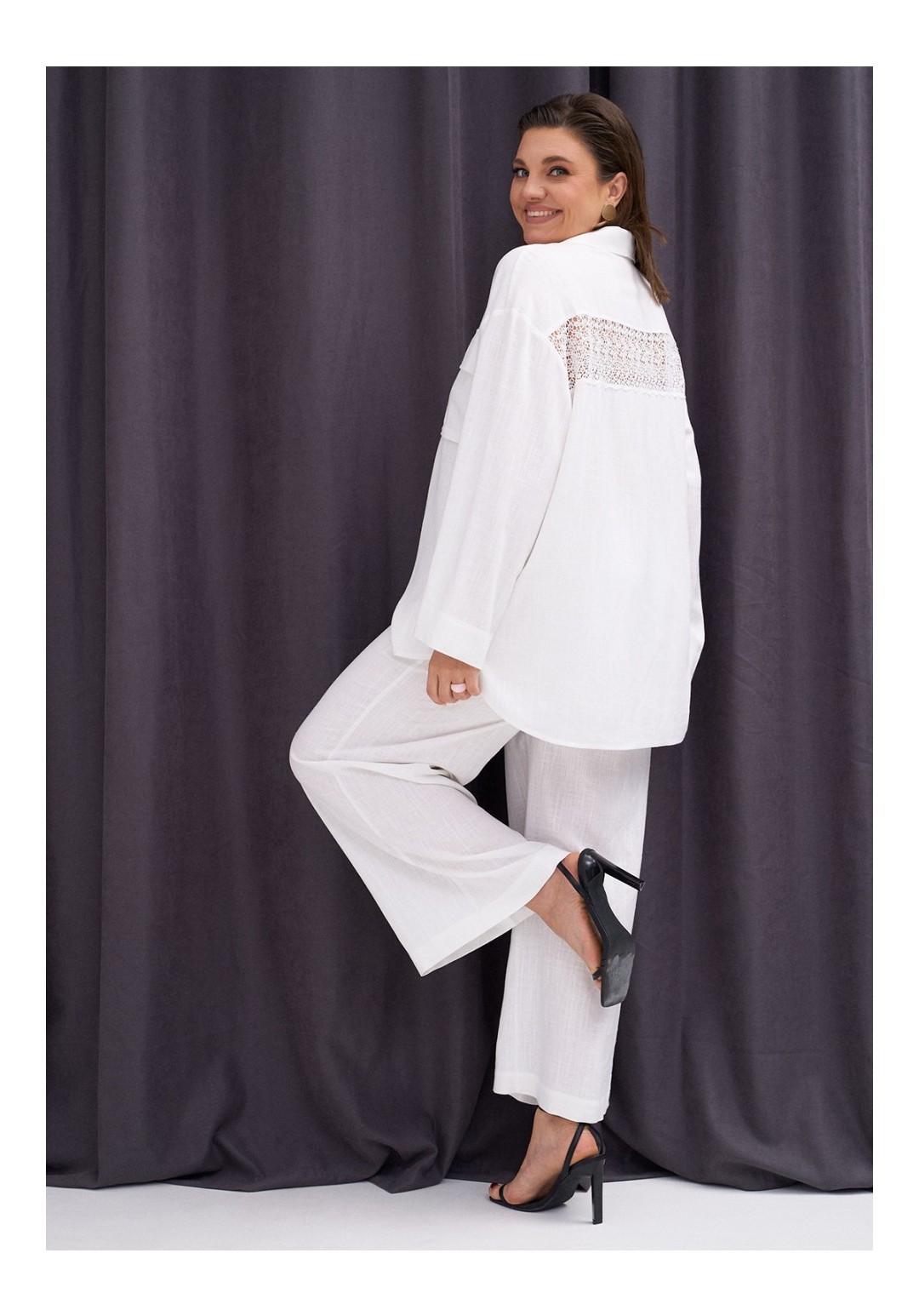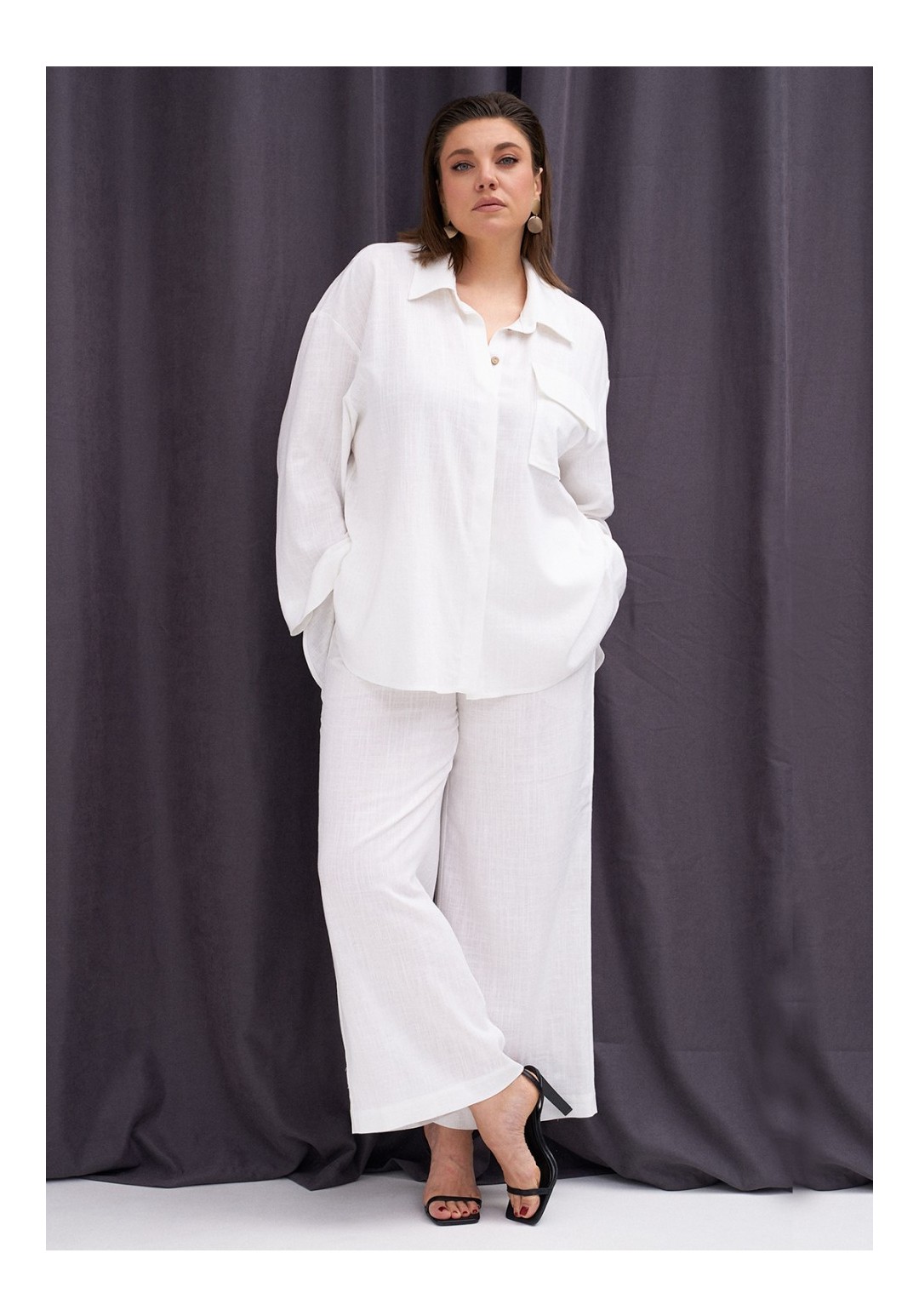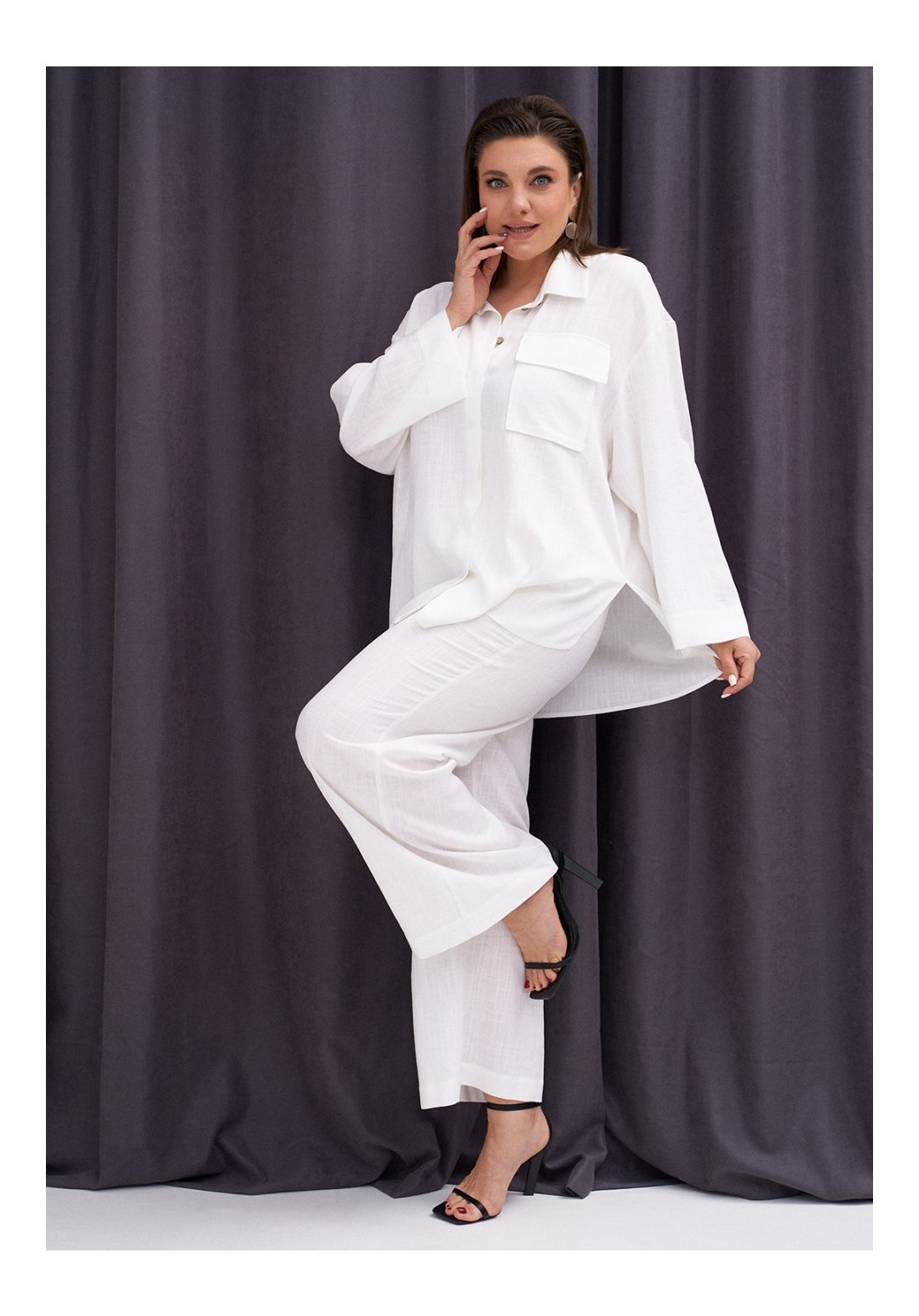 Льняной комплект, состоящий из объёмной рубашки и прямых брюк. Рубашка со спущенной линией плеча. Рукав длиной 7/8 с широкой подгибкой. По переду накладной карман с клапаном. По спинке вставка из полупрозрачного кружева. По бокам разрезы. Брюки на резинке по поясу спинки. Застёжка на гульфик с молнией и пуговицу. По бокам карманы. Длина брюк - 102,5 см.