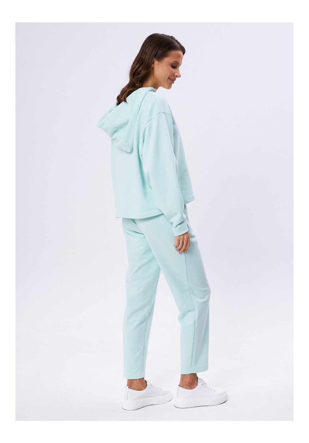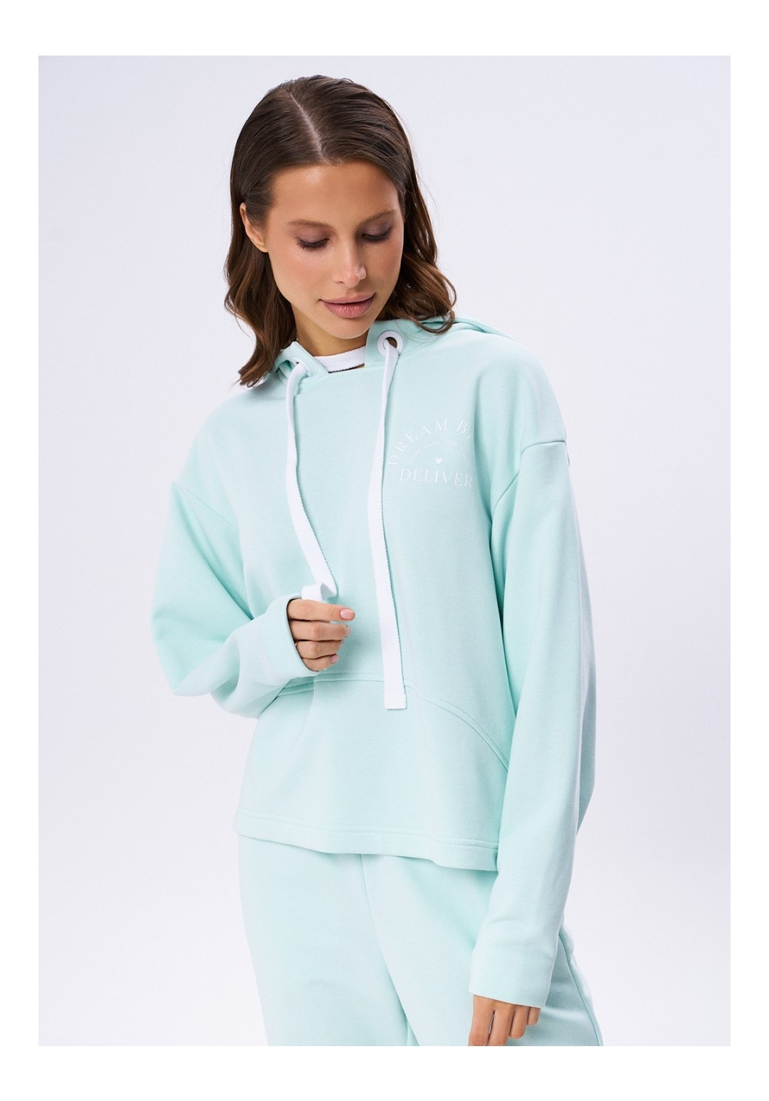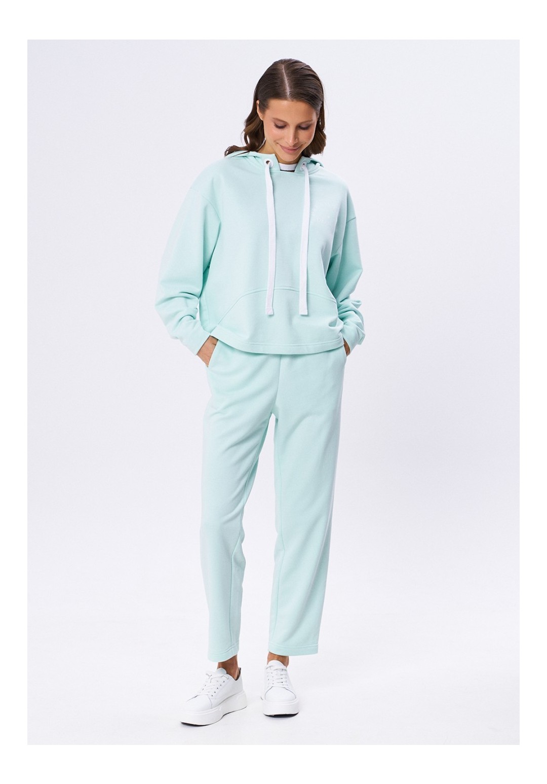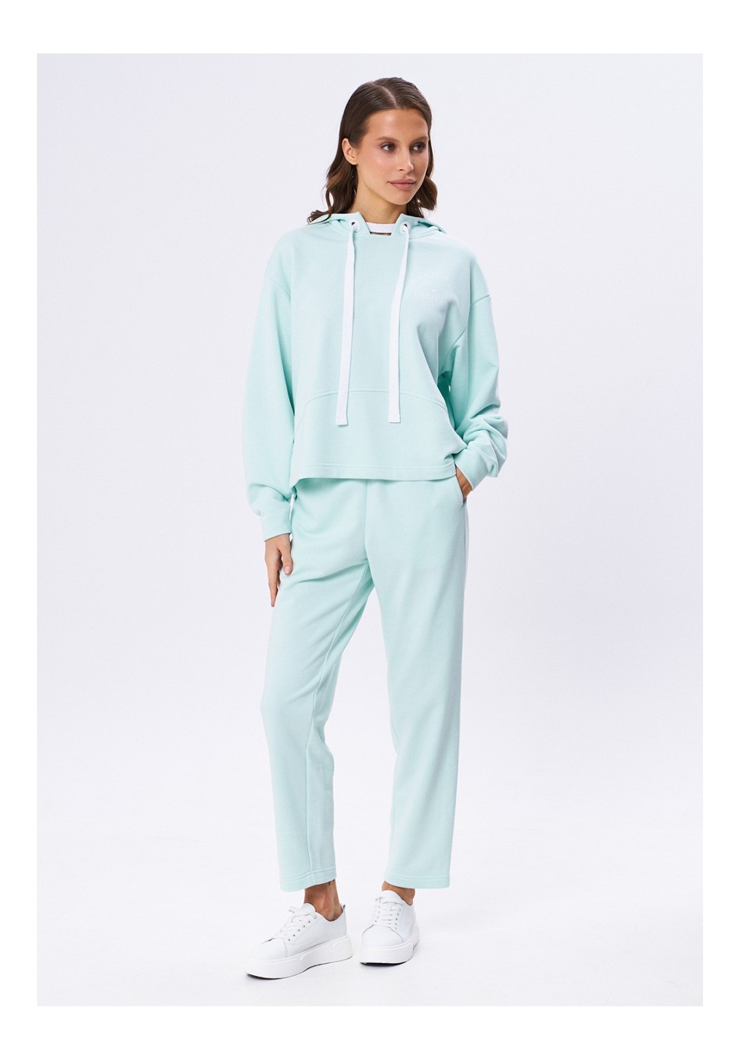 Комплект из футера 3-х нитки, состоящий из джемпера и брюк. Объёмный джемпер с капюшоном с декоративными, крупными люверсами и шнуром. Линия плеча спущена. Рукав плавно заужается к запястью. На груди по переду контрастный принт. Брюки на резинке по поясу, слегка зауженные к низу. Карманы в боковых швах, которые слегка перенесены на перед.