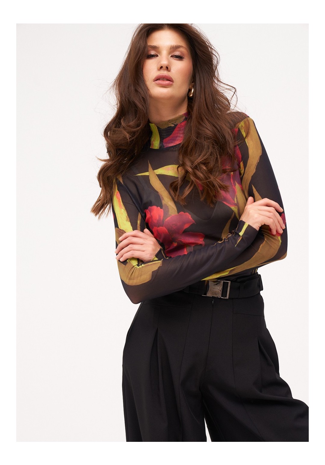 Комплект из двух предметов: джемпер и брюки. Джемпер облегающий из эластичной, прозрачной сетки в яркий принт. Брюки-палаццо с высокой посадкой по талии. Верх брюк фигурный. По переду вертикальные рельефы по центру и складки. В боковых швах карманы. Застёжка на потайную молнию спереди. Комплектуется текстильным ремнём с металлической пряжкой.