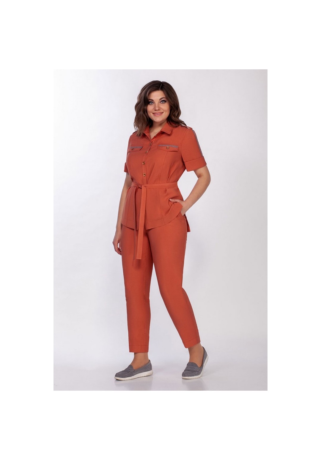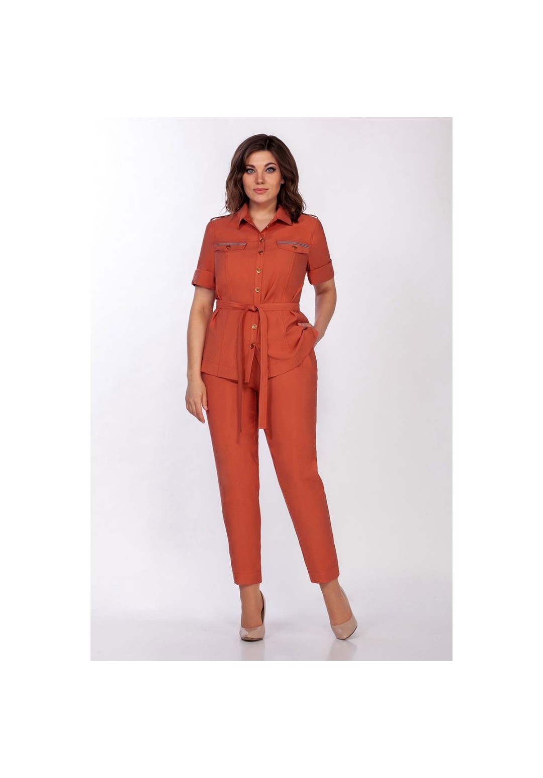 Костюм двухпредметный: рубашка, брюки. Брючный костюм в стиле сафари выполнен из облегченной струящейся ткани. Рубашка с воротником на стойке, застежка по планке на пуговицы. У кокеток клапаны с отделочной тесьмой и пуговицами. На плечевом шве паты с пуговицами. Спинка ниже переда. По спинке кокетка и вертикальные рельефы. Короткий рукав с отделочной тесьмой и манжетой с отворотом. Съемный пояс завязывается на узел. Брюки слегка укорочены и немного заужены к низу. Пояс на резинке, по бокам карманы. Длина рубашки сзади по спинке 70 см. Длина рукава 30 см. Длина брюк 99 см.