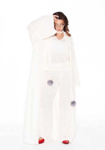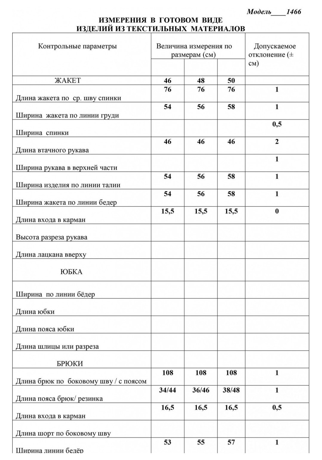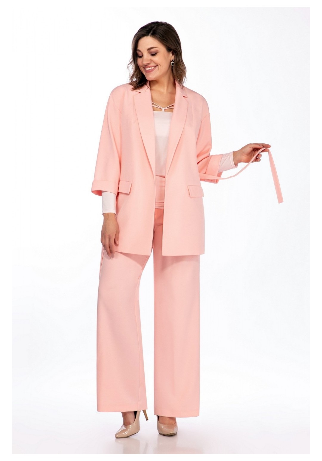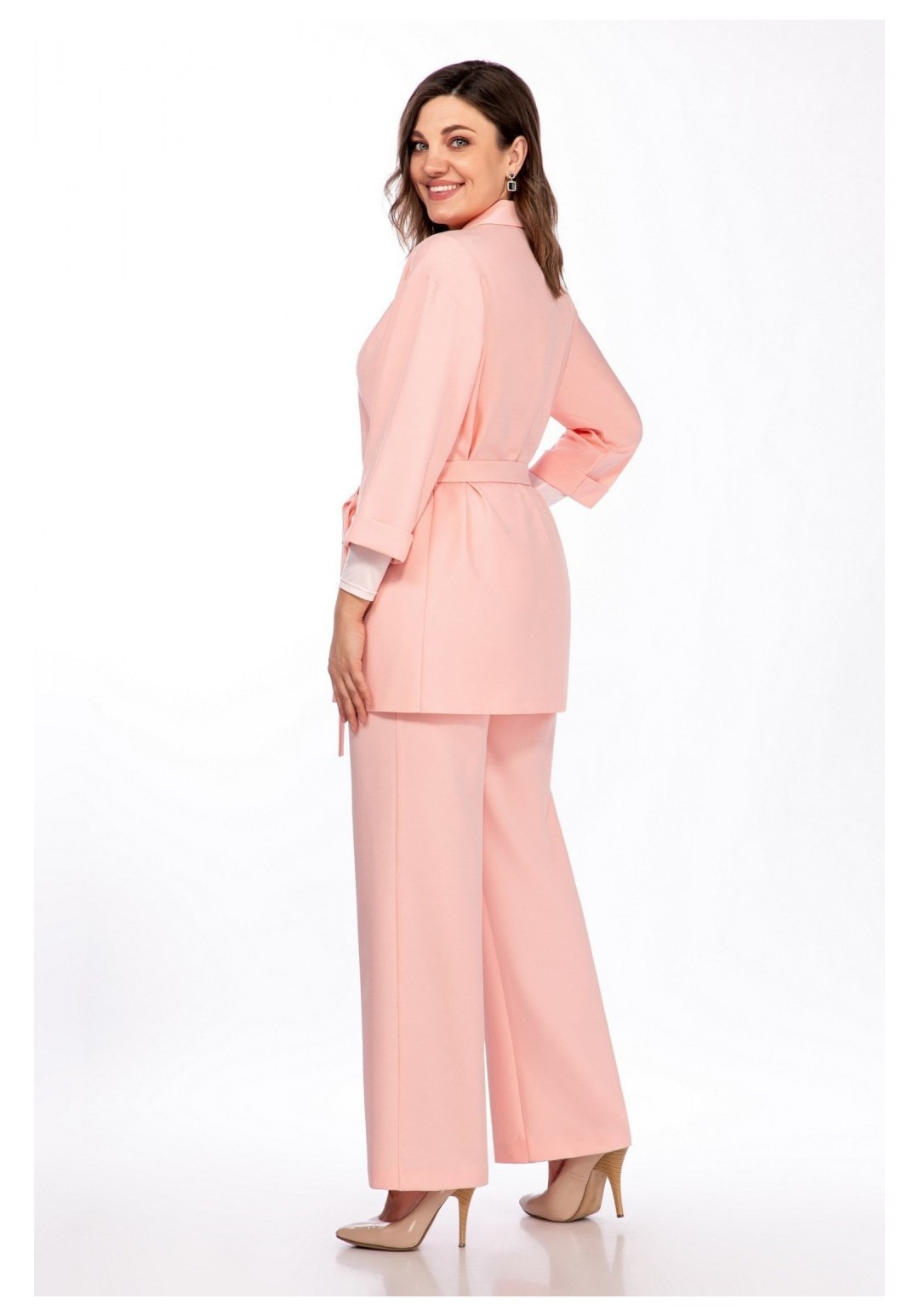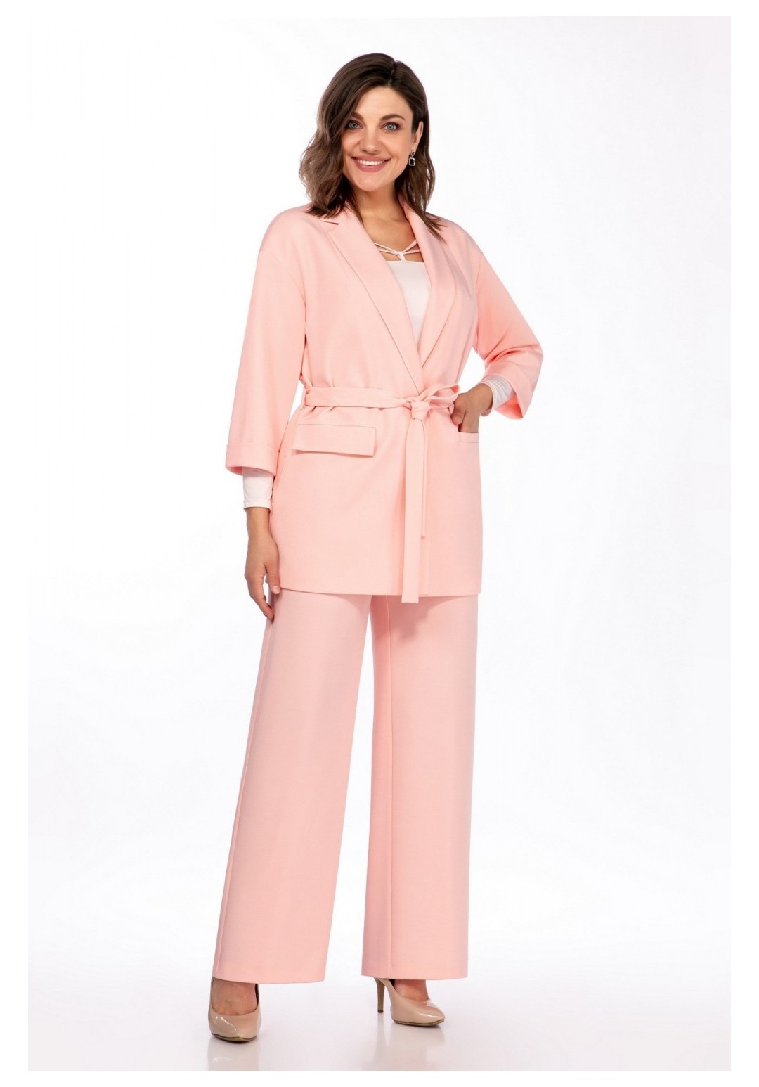 Комплект двухпредметный: жакет, брюки. Жакет свободного силуэта, без застежки, фиксируется съемным поясом на талии. С отложным воротником и лацканами, внутренние карманы с клапанами, которые при желании можно спрятать. Впереди вытачки от плечевого шва, по спинке центральный шов. Линия плеча приспущена, рукав ¾, манжета с отворотом. Полочки переда - на подкладке. Длинные, свободные от бедра, струящиеся брюки сверху со складками и внутренними карманами, оформлены притачным поясом (сзади на резинке), застежка молния + пуговица. Длина жакета сзади по спинке 77 см, длина рукава 49 см. Длина брюк по боковому шву 108 см.