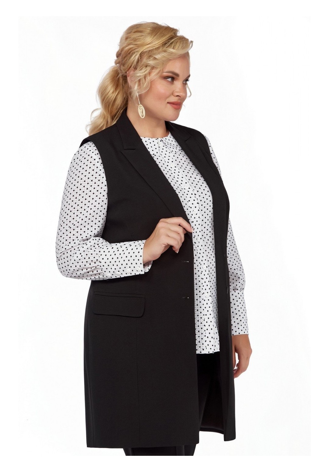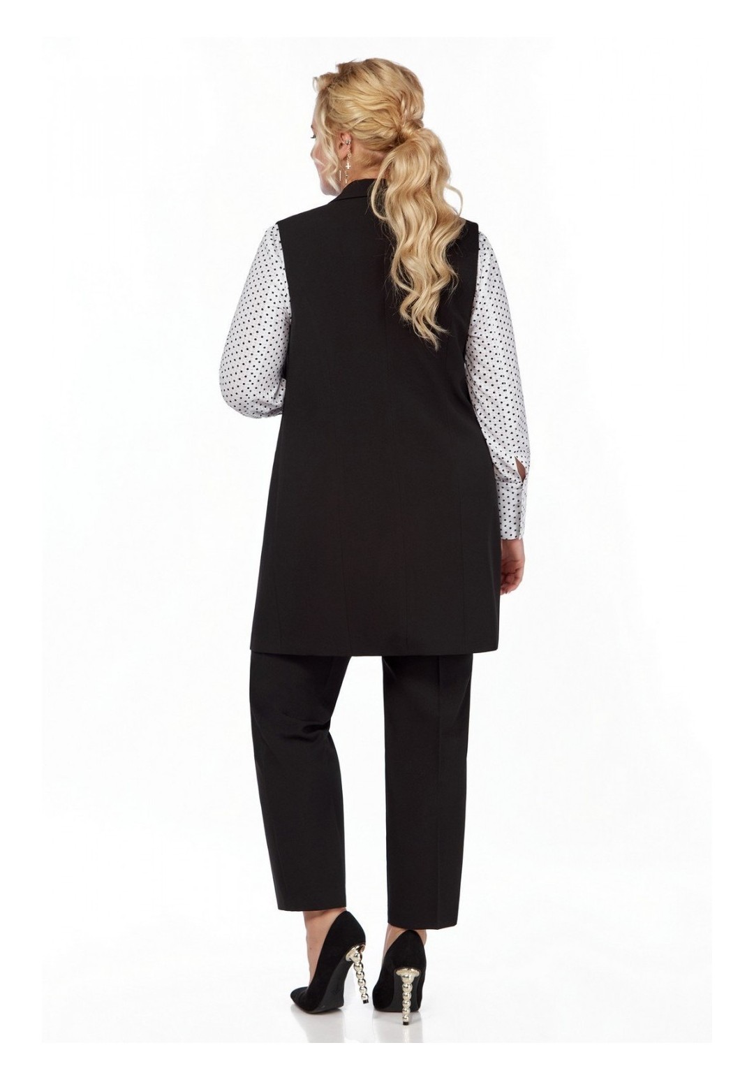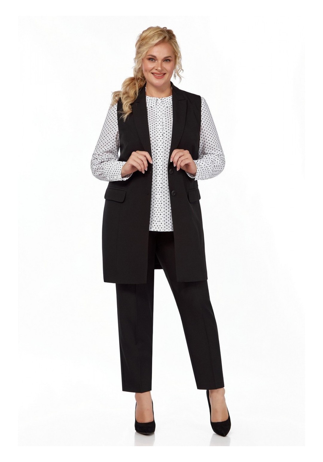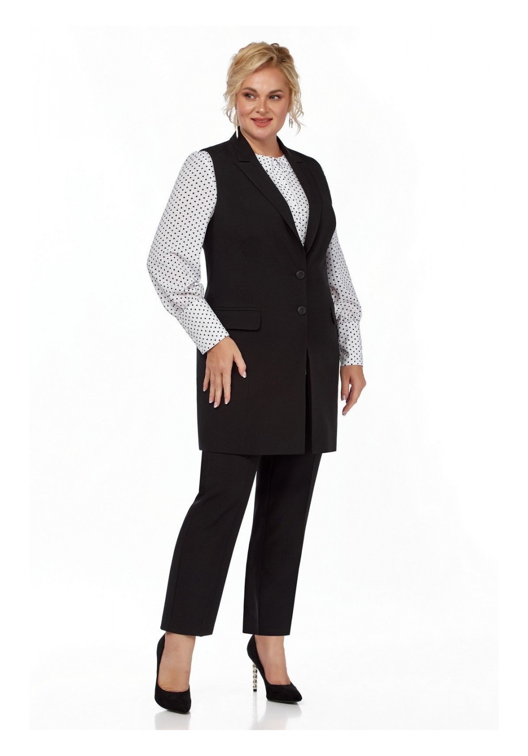 Комплект двухпредметный: жилет, брюки. Удлиненный жилет полуприлегающего силуэта, с отложным воротником и лацканами, застежка на две пуговицы. Впереди рельефы от пройм, внутренние карманы в рамочку +клапаны, которые можно спрятать. По спинке шов и рельефы. Жилет на подкладке Гранд. Брюки заужены к низу, оформлены притачным поясом (по бокам резинки), застежка молния + пуговица