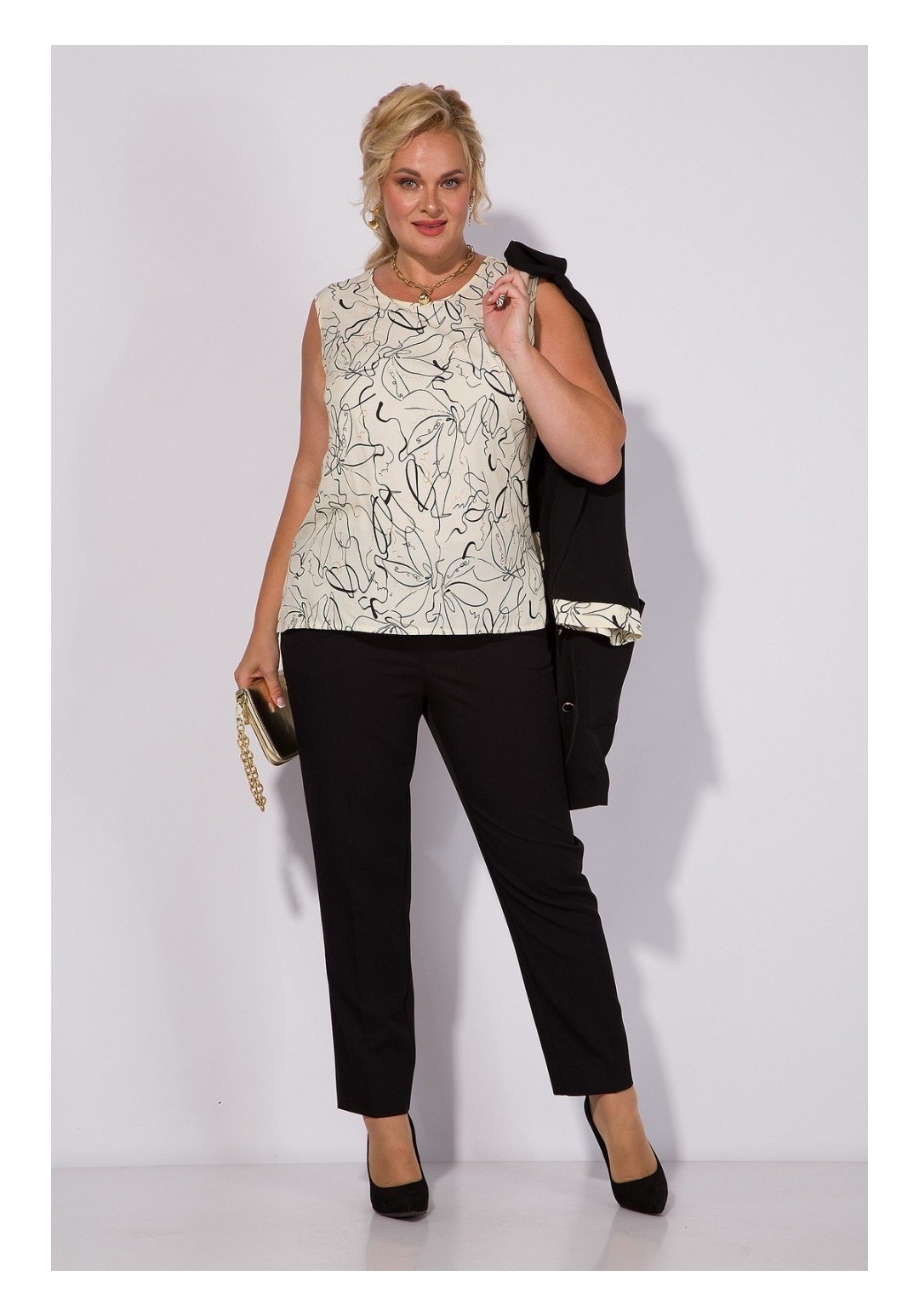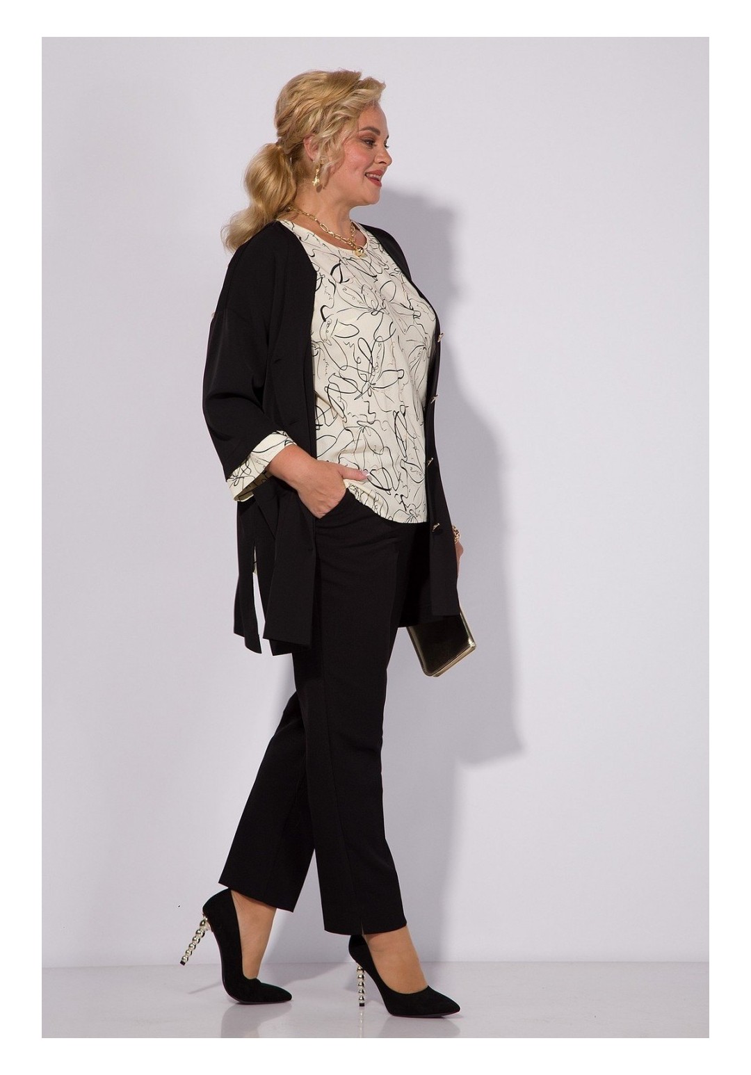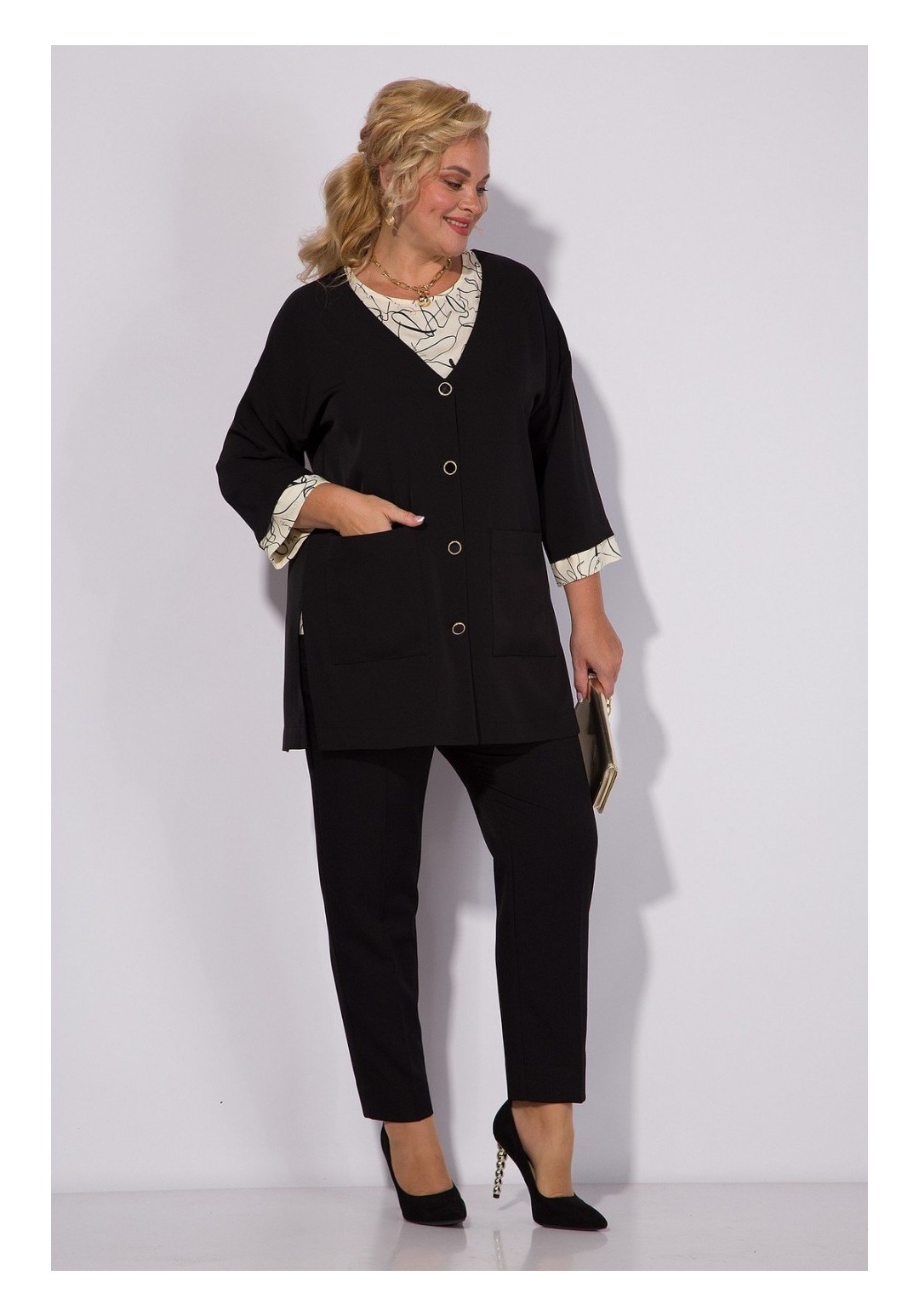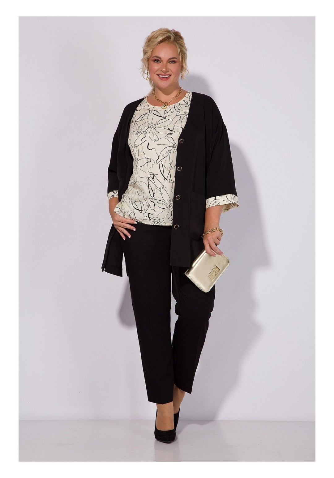 Стильный женский комплект 2-ка, состоит из облегченного кардигана и топа. Кардиган с v-образным вырезом горловины, с центральной бортовой застёжкой на пуговицы. Рукав на спущенном плече, длиной 4/4-ти с манжетами из отделочной ткани. По полочке расположены накладные карманы. По бокам предусмотрены разрезы для свободы движения. Изюминкой данной модели служит оригинальная спинка с подрезом и декоративным элементом в виде цепи. В комплект входит топ из вискозной ткани. Топ без рукавов, с округлым вырезом горловины, спинка длиннее чем перед. Классические женские брюки в комплекте, со средней посадкой, прямого покроя от бедра. Застежка – брючная тесьма-молния с обработанным гульфиком. Карманы боковые. Пояс притачной, в боковых участках вставлена резинка на свободу. По переду заутюжены канты. Спинка с Талиевыми выточками. Подгибка брюк –– 4 см. Длина кардигана – по спинке – 85 см, рукав – 75 см. Топ по спинке – 75 см, по переду 65 см. Брюки – 100 см+пояс.