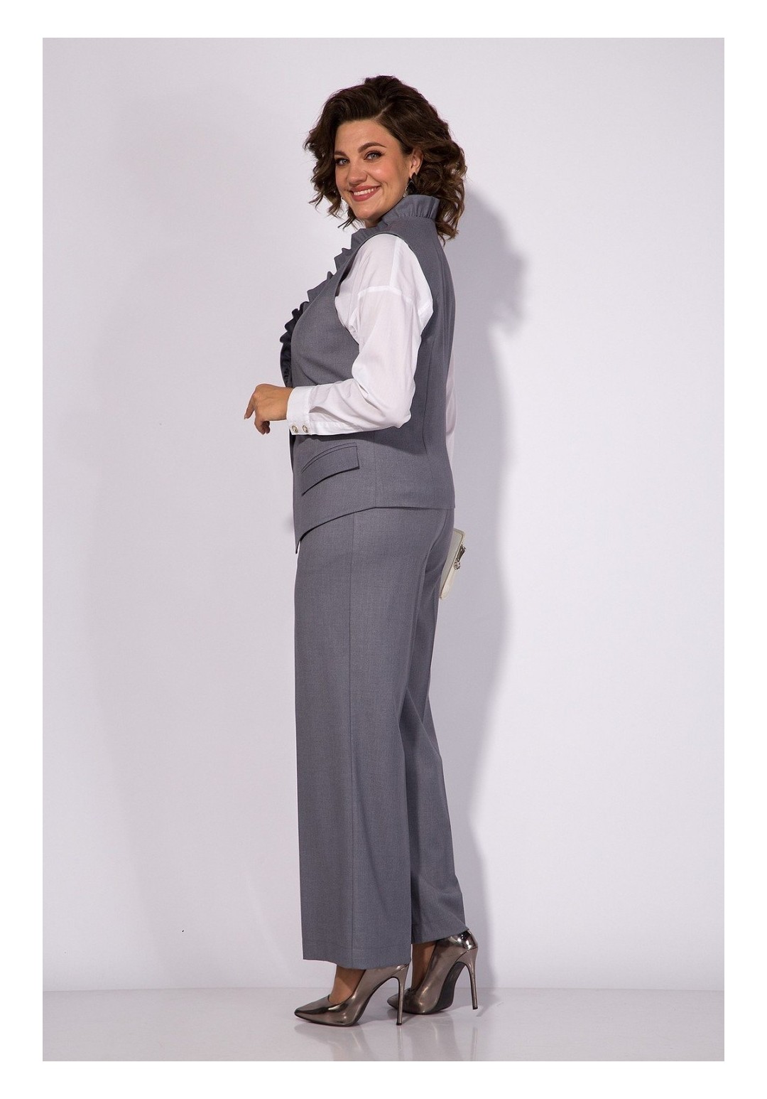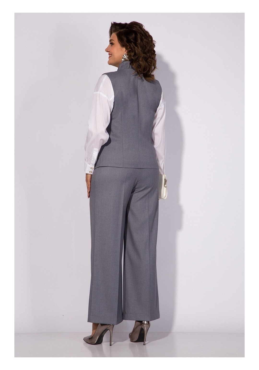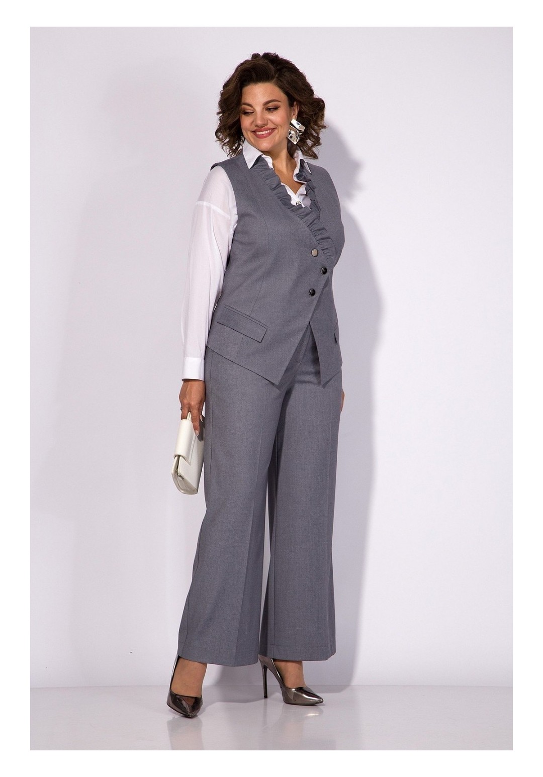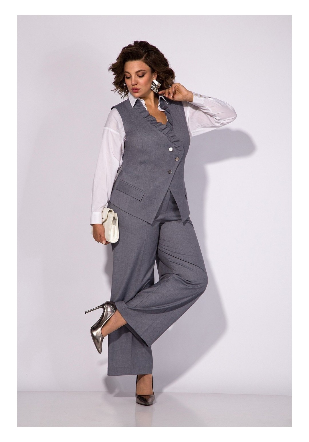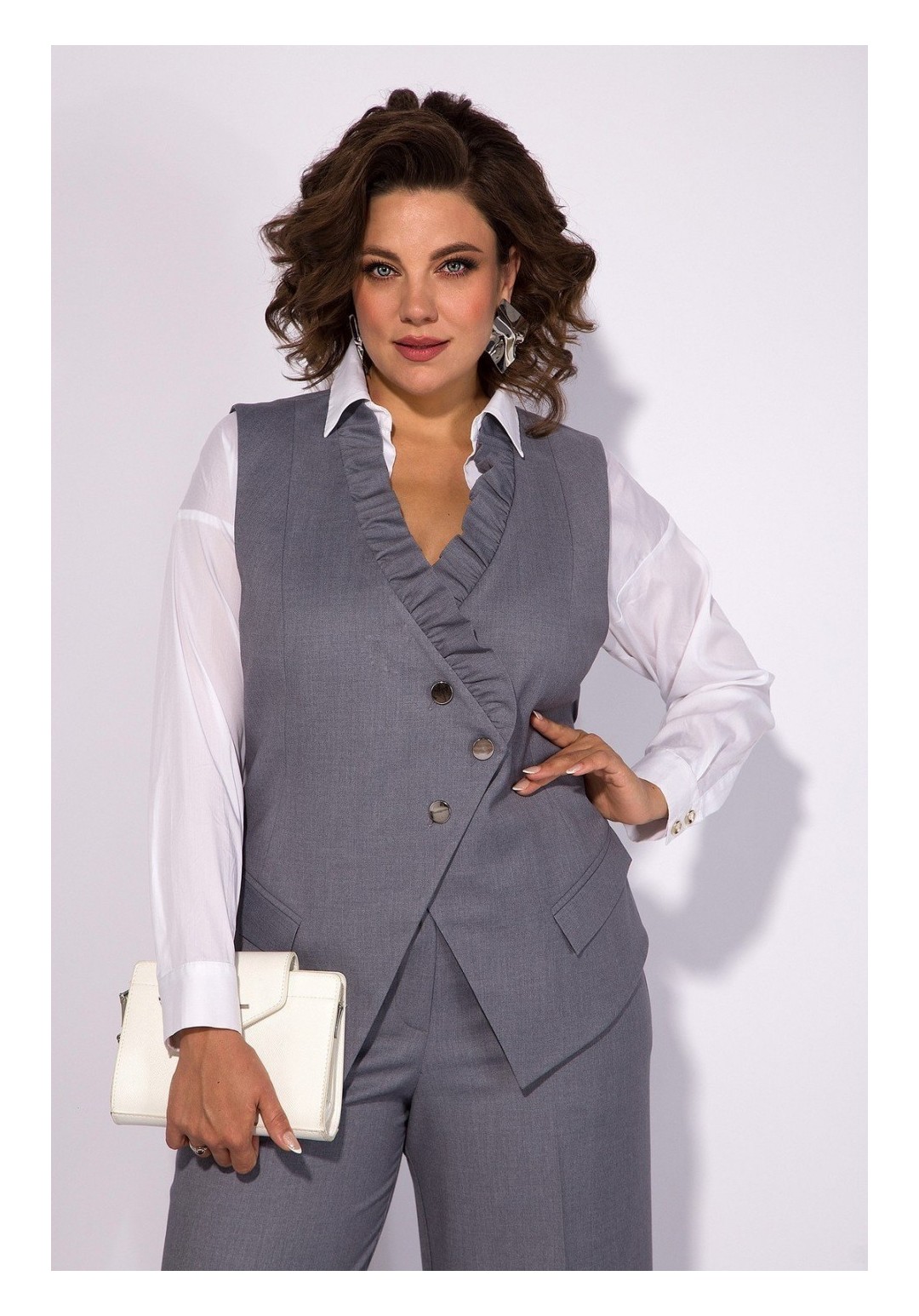Эффектный офисный костюм, состоящий из брюк и жилетки. Оригинальная жилетка на шелковой подкладке, с ассиметричной застежкой на пуговицы. Вырез горловины v-образной формы с рюшей из основной ткани. Жилетка с прорезными карманами с клапаном. Спинка приталенная. Брюки прямого кроя, на притачном поясе. Застежка - брючная тесьма-молния с обработанным гульфиком. В боковых участках пояса вставлена резинка для более комфортного прилегания. В брюках заутюжены канты. Такой костюм можно носить в комплекте или раздельно, дополнить блузкой для деловой встречи или футболкой для модной вечеринки. В таком костюме вы всегда будете чувствовать себя превосходно! Длина жилетки – 60 см. Брюк – 104 см.
