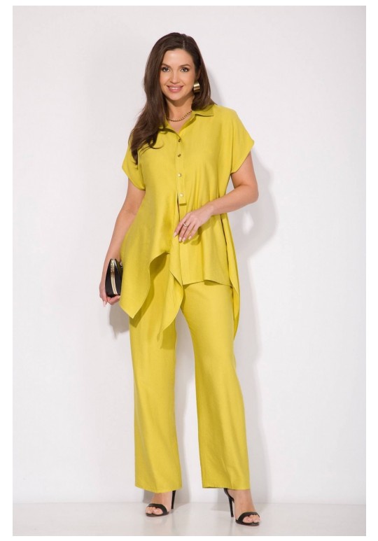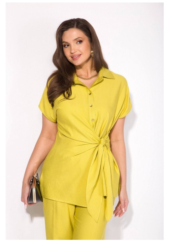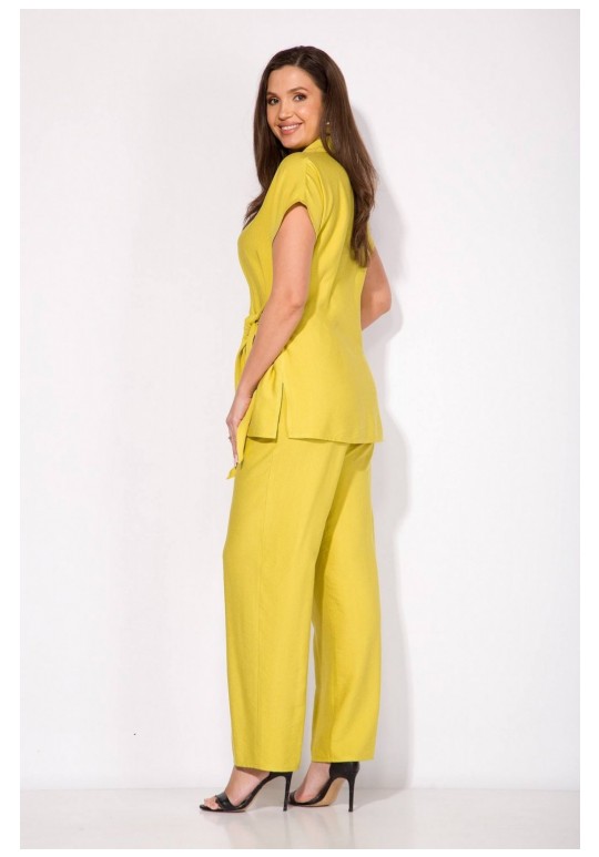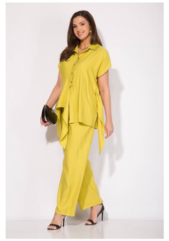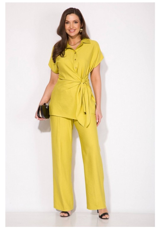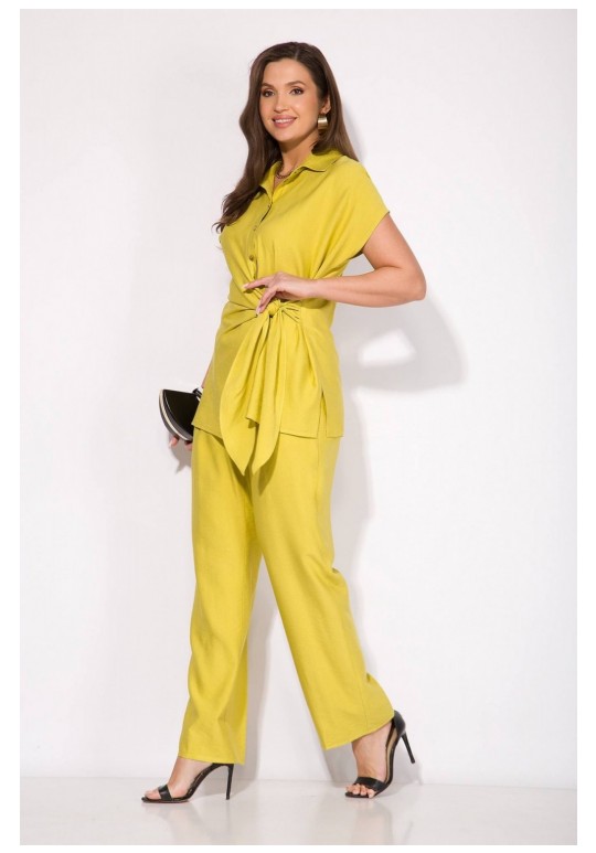 Эффектный летний костюм, выполнен из текстильной ткани на основе вискозы. Модель состоит из блузки и прямых свободных брюк. Блузка полуприталенного силуэта с цельнокроеным спущенным рукавом. Воротник отложной, рубашечного типа. Застежка – центральная, на планке, на петли и пуговицы. По бокакам предусмотрены разрезы. Спинка с Талиевыми выточками. Изюминка данной модели – эффектная мягкая ассиметричная завязка на бант. Брюки в комплекте с завышенной посадкой, на примтачном поясе с резинкой. В брюках имеются боковые карманы. Длина блузки – 70 см. рукав – около 15 см. Брюки – 104-106 см.