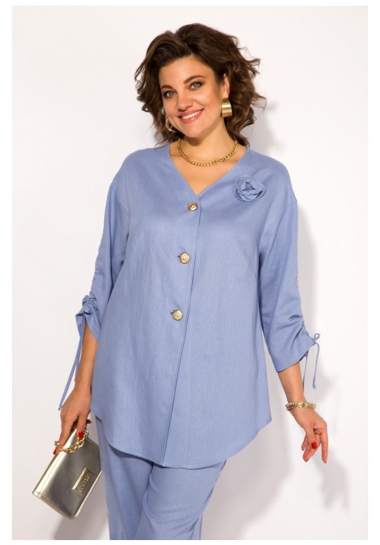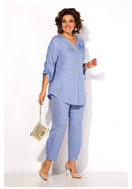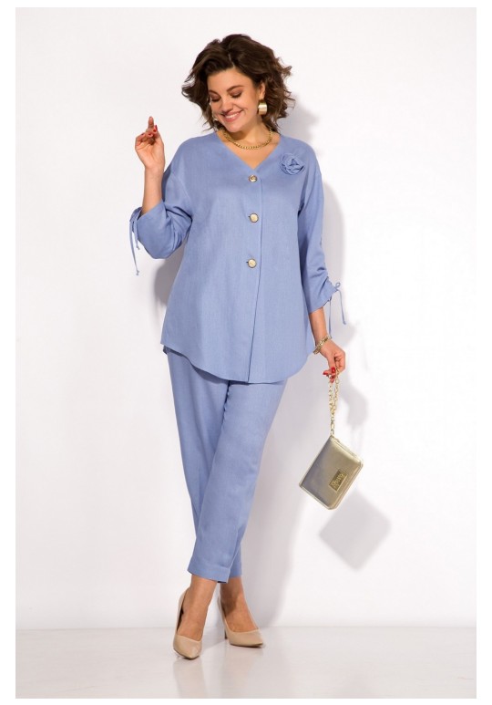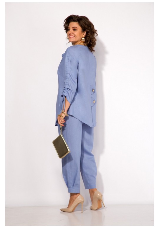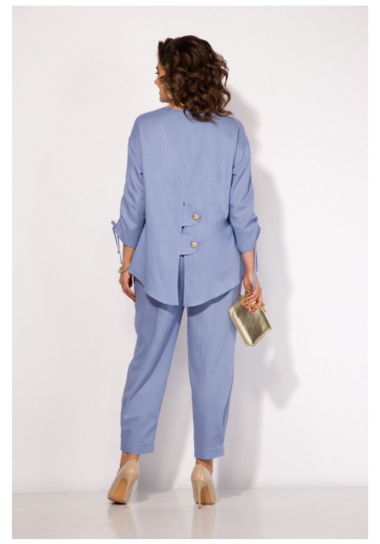 Костюм женский: блузка+брюки. Эффектный летний костюм, из натурального льна с добавлением вискозы; состоит из свободной блузки и брюк. Блузка свободного силуэта, со спущенной линией плеча и рукавом длиной ¾-ти. Модель c V-образной линией горловины с центральной застежкой на петли и пуговицы. По центру рукава расположена кулиска с утяжкой на шнуровку. Спинка с центральным швом, переходящий в шлицу с декоративными клапанами на пуговицах. Брюки в костюме с завышенной посадкой, на притачном поясе с круговой резинкой. По бокам имеются рабочие карманы. Низ брюк с заложенными складками. Отличный вариант на жаркую солнечную погоду; для особого случая и легкого променада! Длина по спинке – 80 см. Рукав – 40 см. Брюки – 96-98 см.
