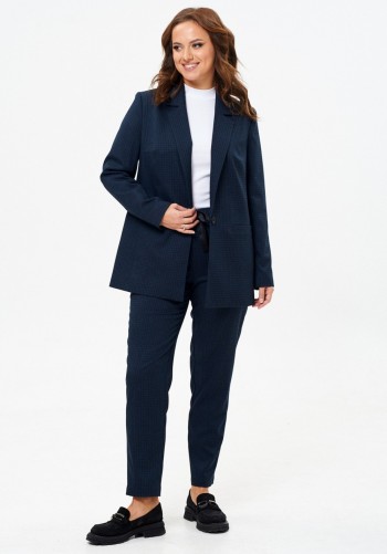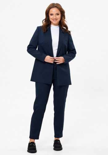 Комплект женский 2-х предметный: жакет и брюки. Двубортный жакет прямого силуэта с отрезным бочком в котором обработаны карманы, пиджачный воротник, спинка со средним швом, втачные двухшовные рукава, жакет на подкладке. Брюки зауженные к низу. На передних половинках брюк боковые карманы хулиганы. Верхний срез брюк на притачном поясе на резинке с тесьмой. Длина жакета по середине спинки: 70см. Длина рукава: 61 см. Длина брюк по боковому шву с учётом пояса: 104 см.