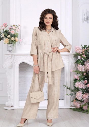 Комплект женский 2-х предметный: жакет и брюки. Жакет прямого силуэта. Перед жакета с отрезными бочками и нагрудными вытачками. По полочкам жакета расположены прорезные карманы с листочкой. Спинка жакета со средним швом. Воротник пиджачного типа с отложными лацканами с центральной застёжкой на одну пуговицу. Рукав втачной двух шовный. Жакет на подкладке. Брюки зауженные к низу. На передних половинках брюк боковые карманы хулиганы. Верхний срез брюк на притачном поясе на резинке со шнуром. Длина жакета по середине спинки: 69 см. Длина рукава: 60 см. Длина брюк по боковому шву с учётом пояса: 102 см.