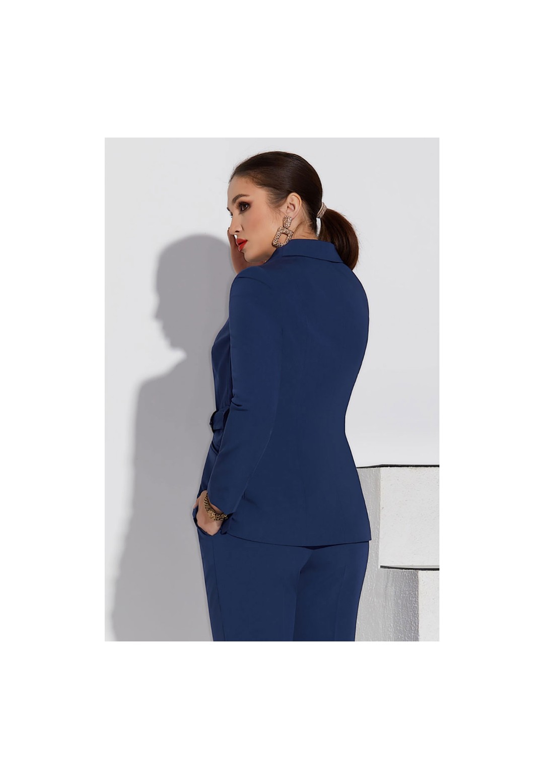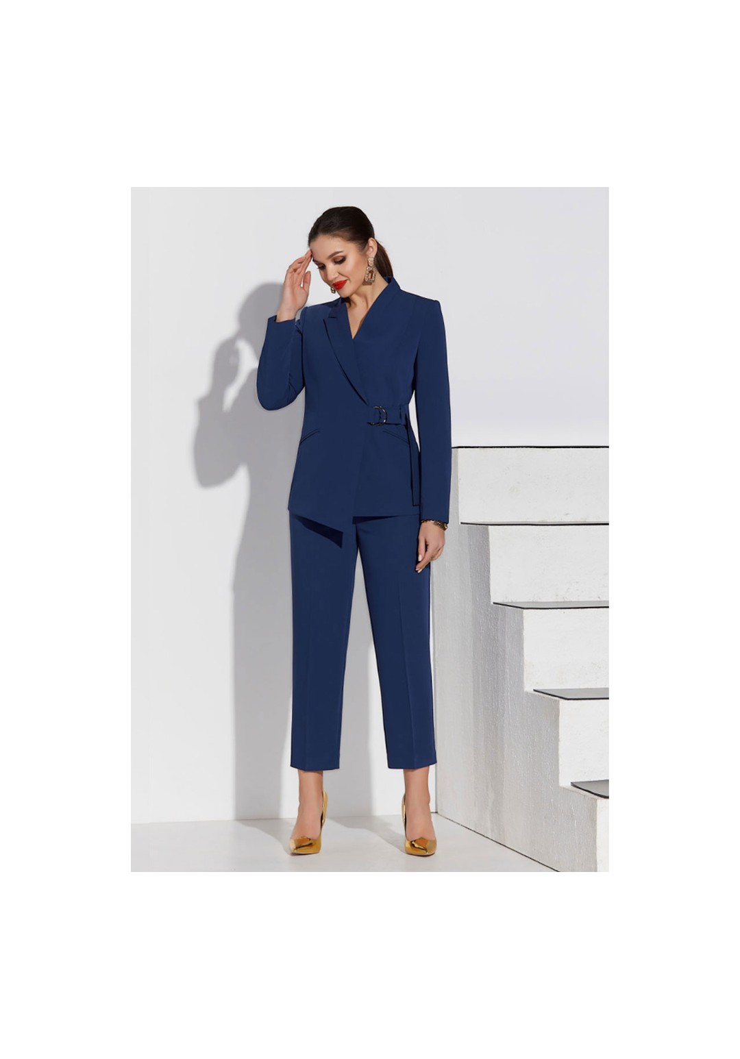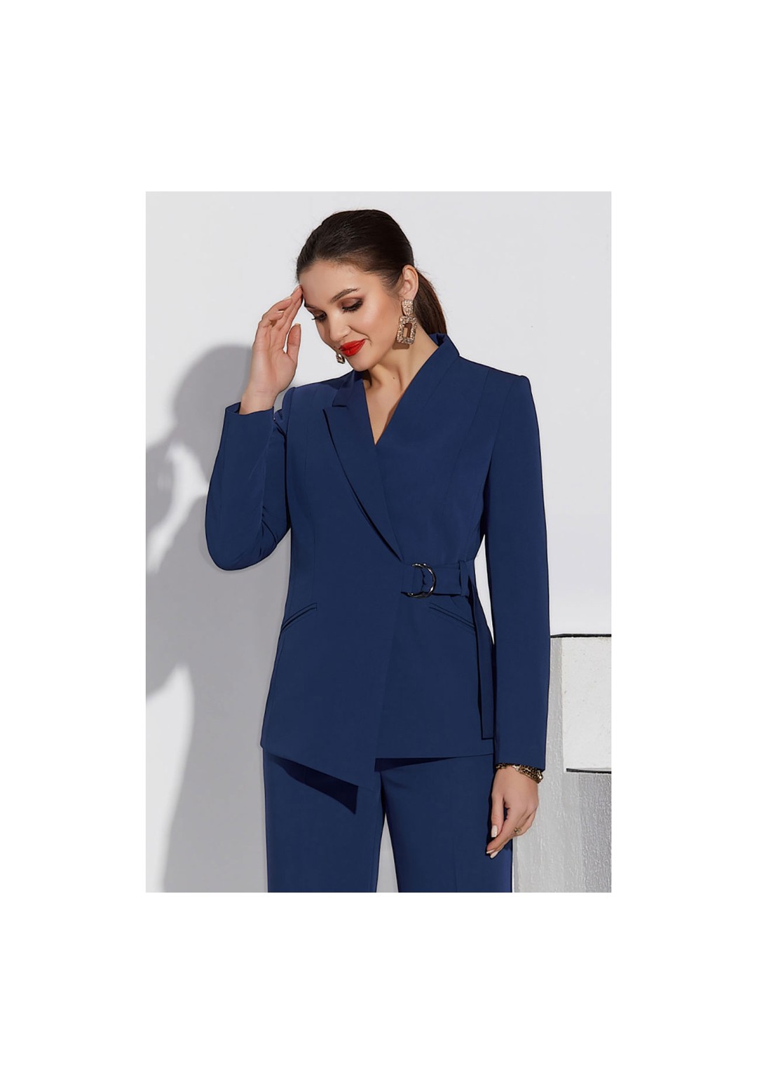 Жакет с ассиметричным дизайнерским воротником и смещённой застёжкой на полукольца и пояс по талии переда. Перед с карманами в нижней части. Спинка со средним швом и двумя рельефами. Рукава втачные. Изделие с фигурным низом. Жакет на подкладке.