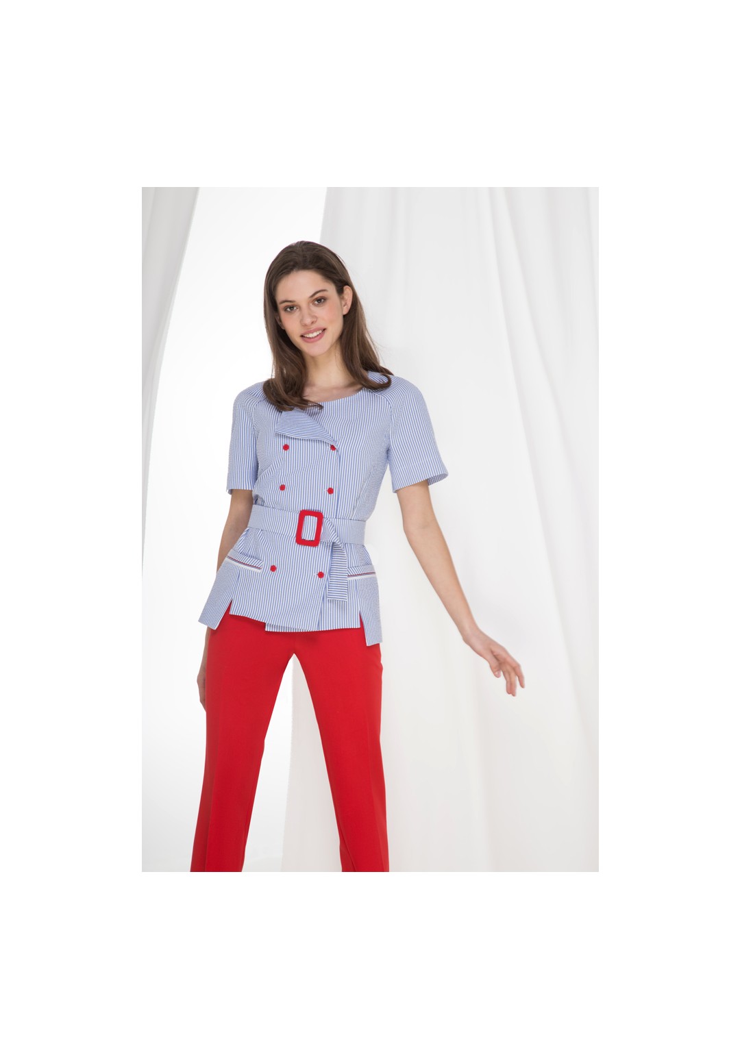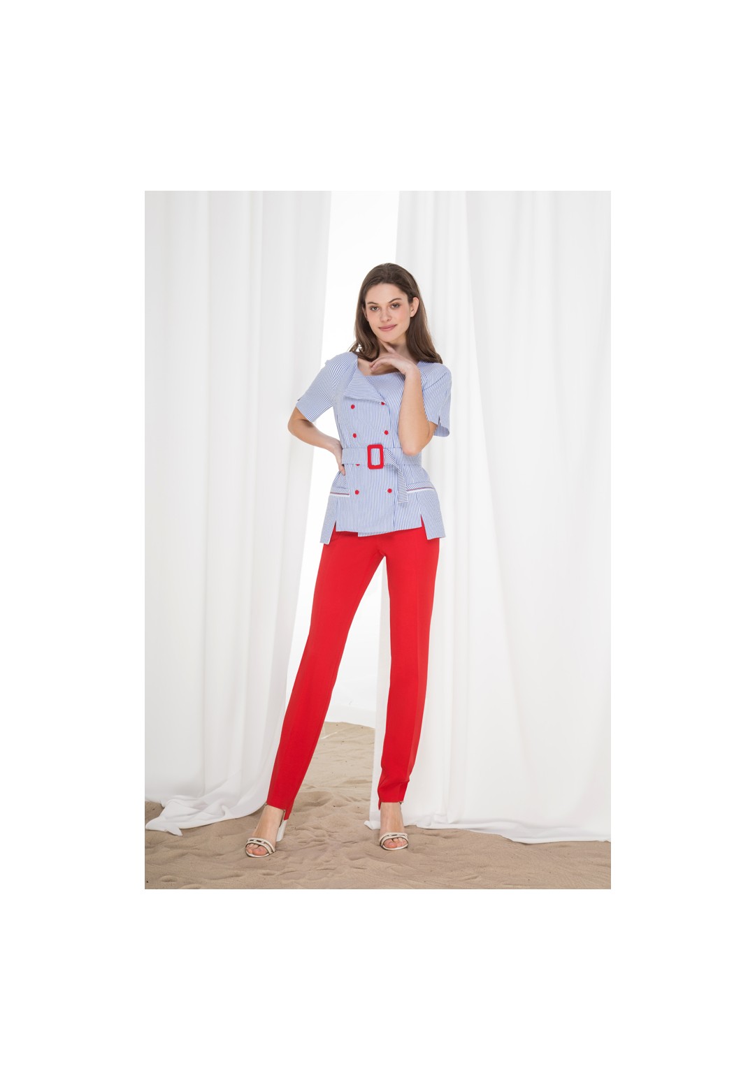 Существует одежда, которая привлекает к себе внимание не только на улице, но даже на подиуме. Одним из таких костюмов может быть модный брючный костюм с принтом «полоска». Тем более, что полоска в сочетании с контрастным однотоном всегда была хорошим предметом для всевозможных дизайнерских экспериментов. В нашем комплекте мы используем именно этот дизайнерский ход. Комплект состоит из жакета и брюк. Жакет полуприлегающего силуэта, округлый вырез горловины, двубортный на застежку петли пуговицы. Рукав укороченный, реглан с разрезами по низу. По переду жакета нагрудная вытачка, выходящая из боковых рельефов, низ которых заканчиваются  разрезами. По переду карман-листочка с декоративной тесьмой, карман не функциональный. По спинке средний шов и боковые рельефы. Низ жакета с асимметричный. Брюки заужены книзу, на обтачке. По передним половинкам брюк функциональные карманы в боковых швах, застежка на молнию и петлю-пуговицу. К комплекту прилагается пояс с обтяжной пряжкой из отделочной ткани. Комплект можно носить как с поясом так и без него.