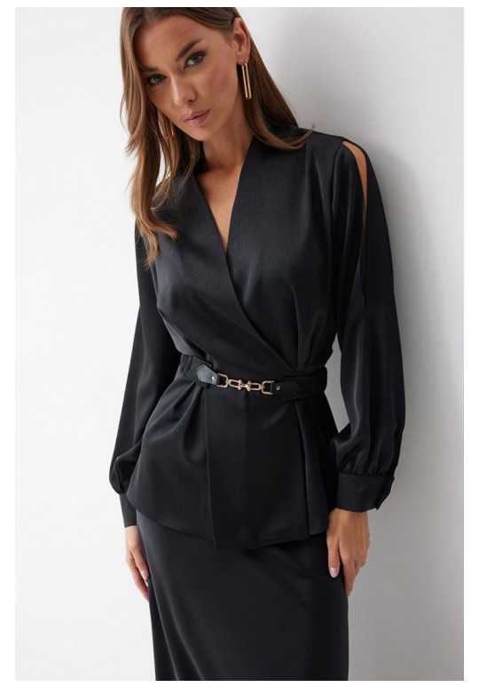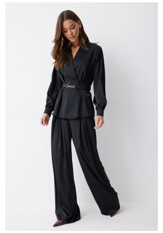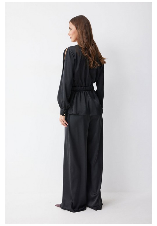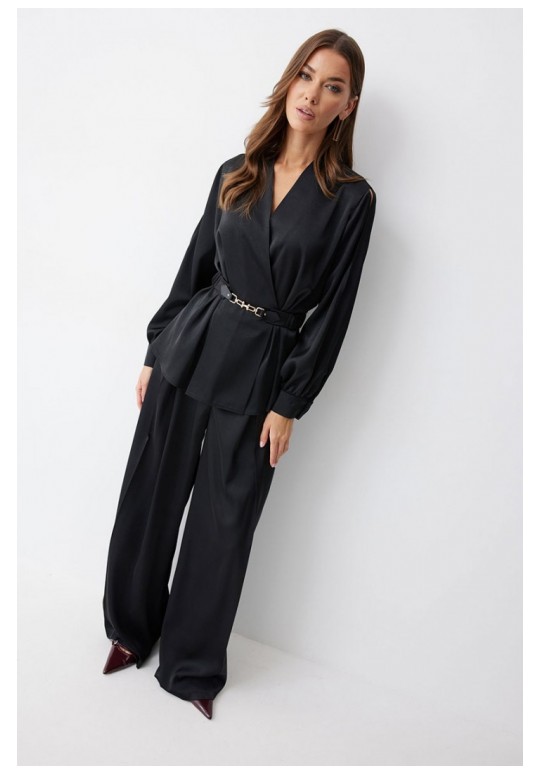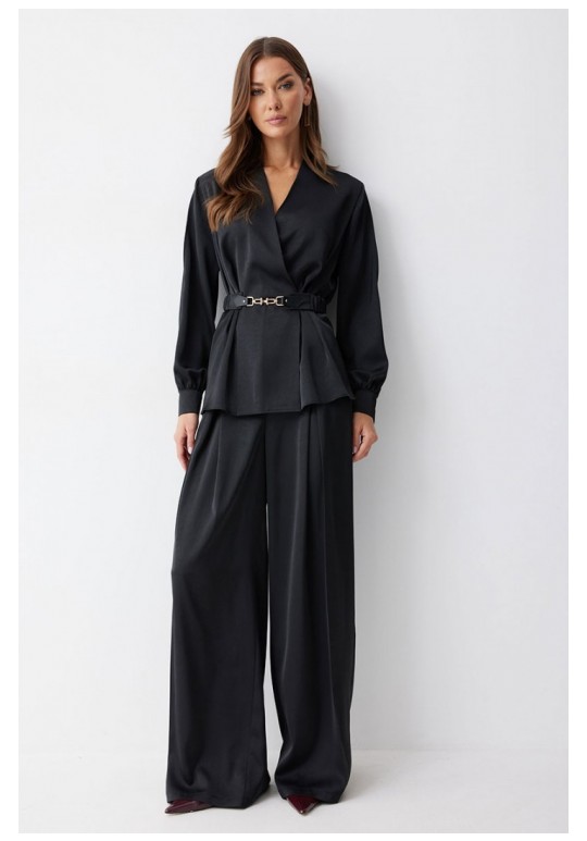 Комплект, состоящий из блузки и брюк. Блузка полуприлегающего силуэта расширенная книзу из струящейся ткани. Рукав втачной, с разрезом в области плеча, по низу манжета с застежкой на петли и пуговицы. Блузка отрезная по линии талии. По переду от подреза вверх и вниз декоративные складки. На спинке в подрез вставлена резинка. В комплект входит съемный ремень. Обращаем ваше внимание, что фурнитура может отличаться от фото. Брюки прямого силуэта расширенные книзу из струящейся ткани. По верху брюк притачной пояс с застежкой на петли и пуговицы. На передних половинках обработана застежка молния в среднем шве. На передних половинках карманы и декоративные складки. По поясу задних половинок брюк резинка и вытачки. Обращаем ваше внимание, что фурнитура может отличаться от фото. Подходит на рост 164-170 см. Длина блузки (44-48р – 66см)(50-54р - 68см). Длина рукава (44-48р – 59см)(50-54р - 59,5см). Длина брюк (44-48р - 108+3,5см пояс)(50-54р - 109+3,5см пояс).