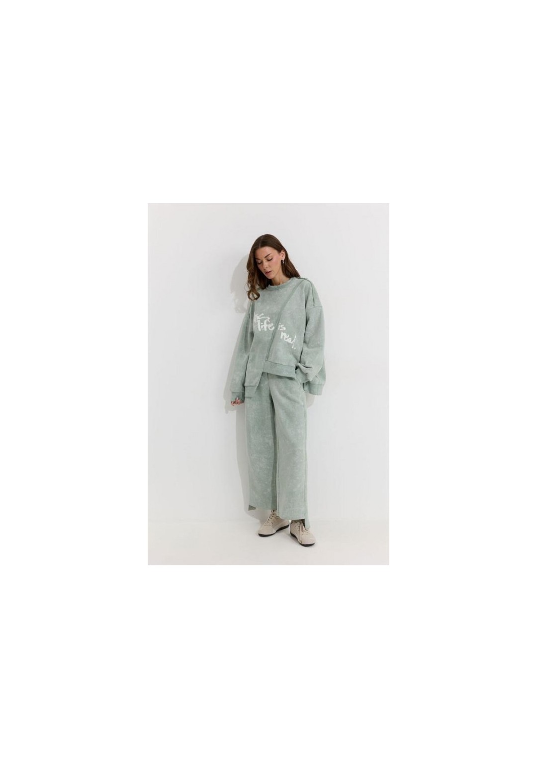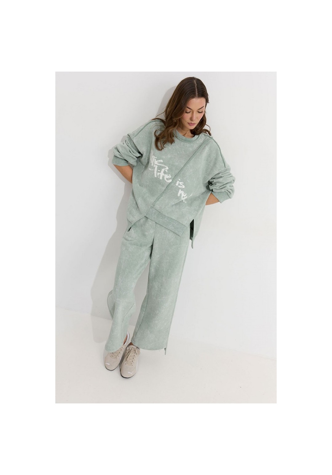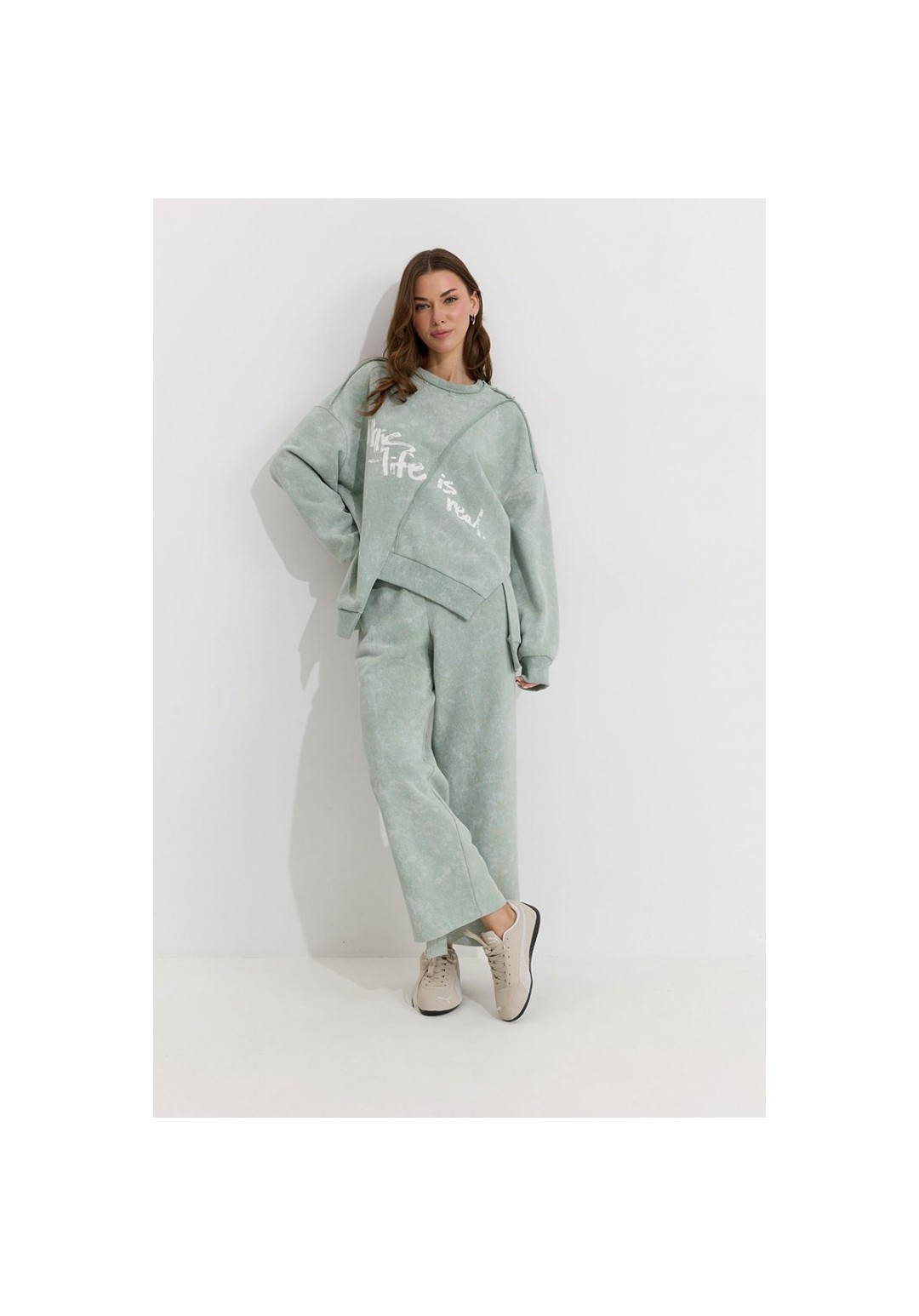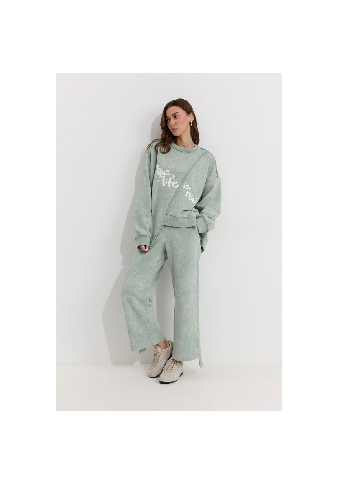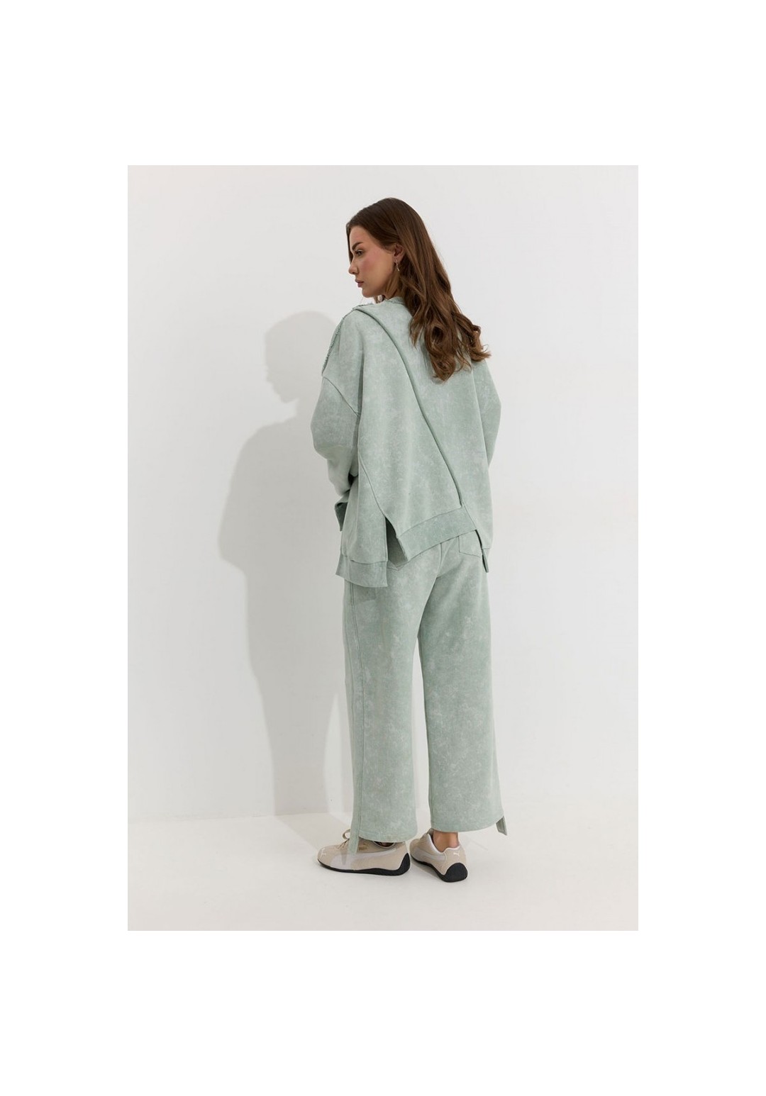 Костюм состоящий из джемпера и брюк. Ассиметричный джемпер прямого силуэта из трикотажного полотна. Горловина округлая. Рукав со спущенной линией плеча . По переду и спинке декоративный шов, по низу пояс с нашивкой. По низу джемпера и рукава декоративная сетка. Брюки прямого силуэта из трикотажного полотна. По верху брюк притачной пояс. По боковым швам лампасы. По задним половинкам брюк карманы. Обращаем ваше внимание, что фурнитура может отличаться от фото. Подходит на рост 164-170 см. Длина джемпера по спинке во всех размерах: 70 см. Длина рукава: (44р.-48р. – 78см.; с 50р.-54р. – 79см.)