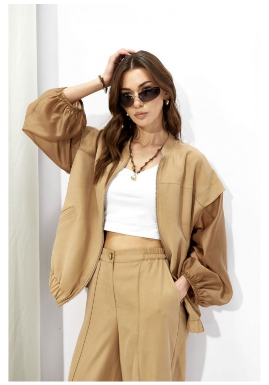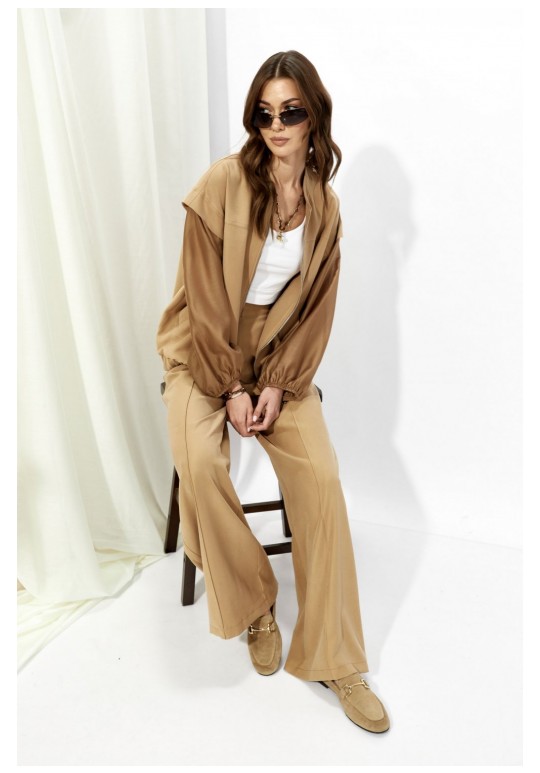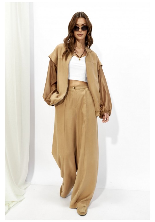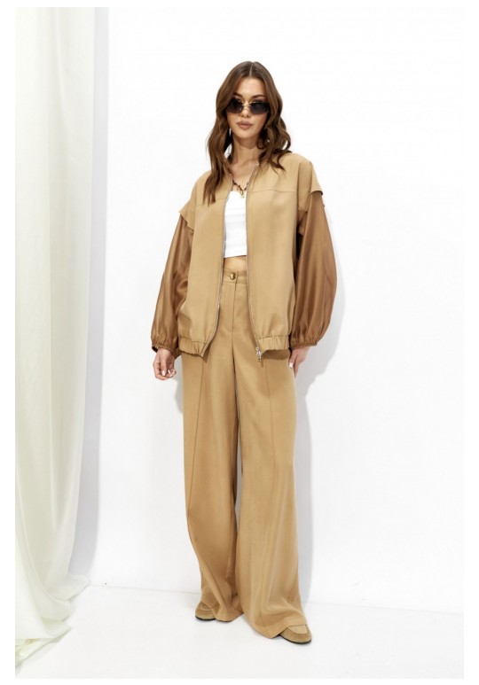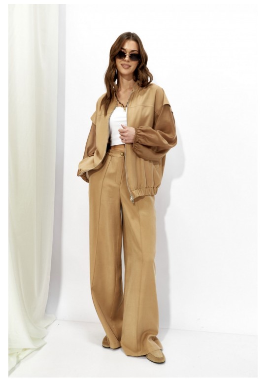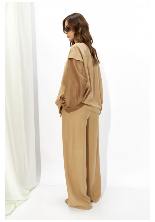 Костюм, состоящий из жакета и брюк из струящейся натуральной ткани. Жакет свободного расширенного силуэта со спущенной линией плеч, без подкладки, длиной до линии бёдер. Застежка центральная на металлическую молнию. Вырез горловины округлый с воротником стойкой. Рукава из полупрозрачной ткани со сборкой на резинку по низу. Перед и спинка с отрезными горизонтальными кокетками. На переде обработаны карманы с широкими листочками с декоративной строчкой. По низу изделия притачная планка с частичной сборкой на резинку, по переду и спинке до боковых рельефов. Брюки свободного силуэта, расширенные к низу. Пояс притачной с застежкой на молнию и пуговицу, и с частичной эластичной тесьмой. Передние половинки с боковыми карманами, с наклонным входом. По центру передних половинок брюк застрочены канты. . Обращаем ваше внимание, что фурнитура может отличаться от фото. Длина брюк - 44-48 – 110см + 4 см пояс, 50-54 – 111см + пояс 4 см Длина по спинке 44-48 -60см, 50-54 - 65 см Длина рукава от горловины 44-48 - 72 см, 50-54 - 73 см