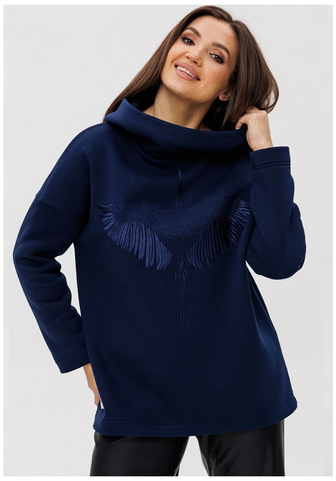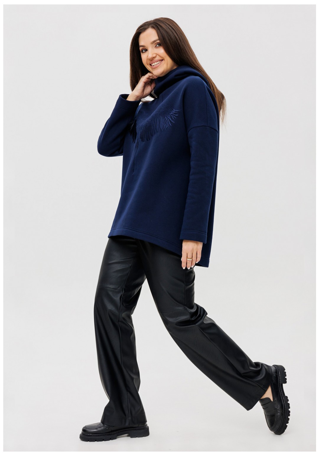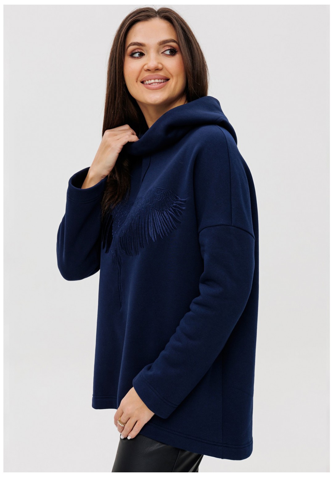 Джемпер с капюшоном. На груди выполнена дизайнерская вышивка "аист". Спинка цельная, низ фигурный. Длина спереди джемпера немного короче, чем по спинке. Рукав длинный одношовный втачной, линия плеча спущена. Джемпер выполнен из теплого трикотажа с начесом. Длина изделия 76-77,5 см в зависимости от размера, длина рукава от горловины 71-72,5 см.