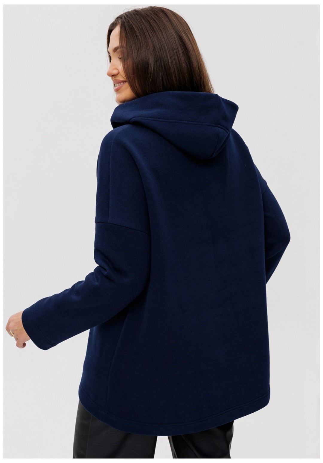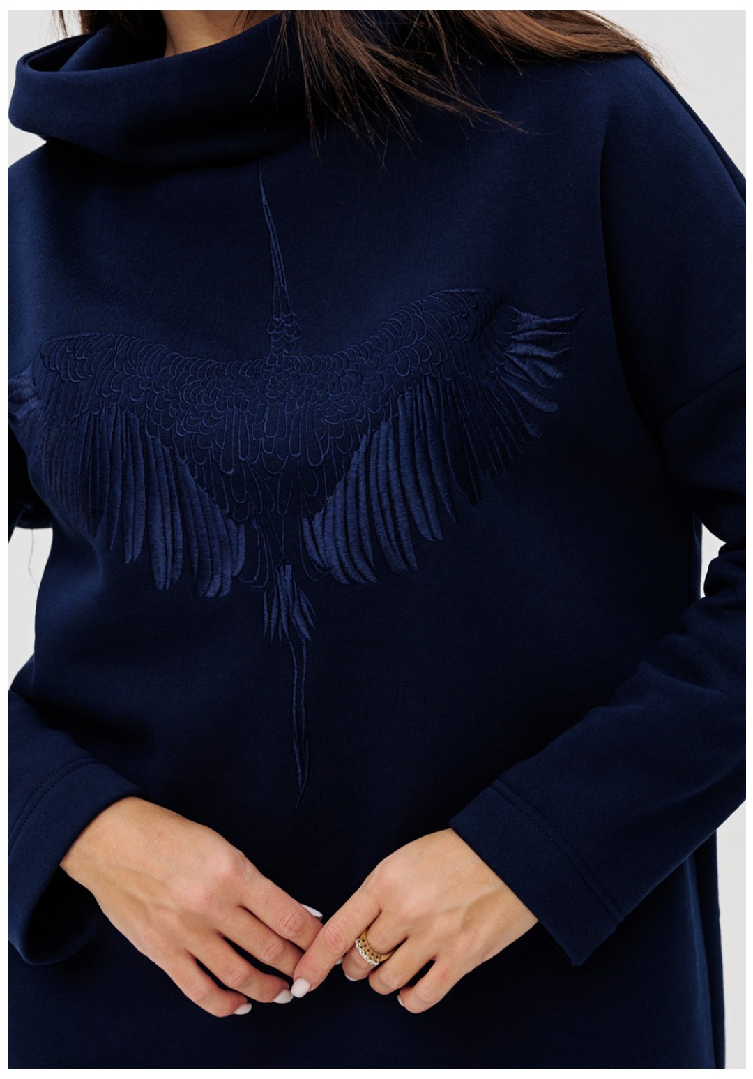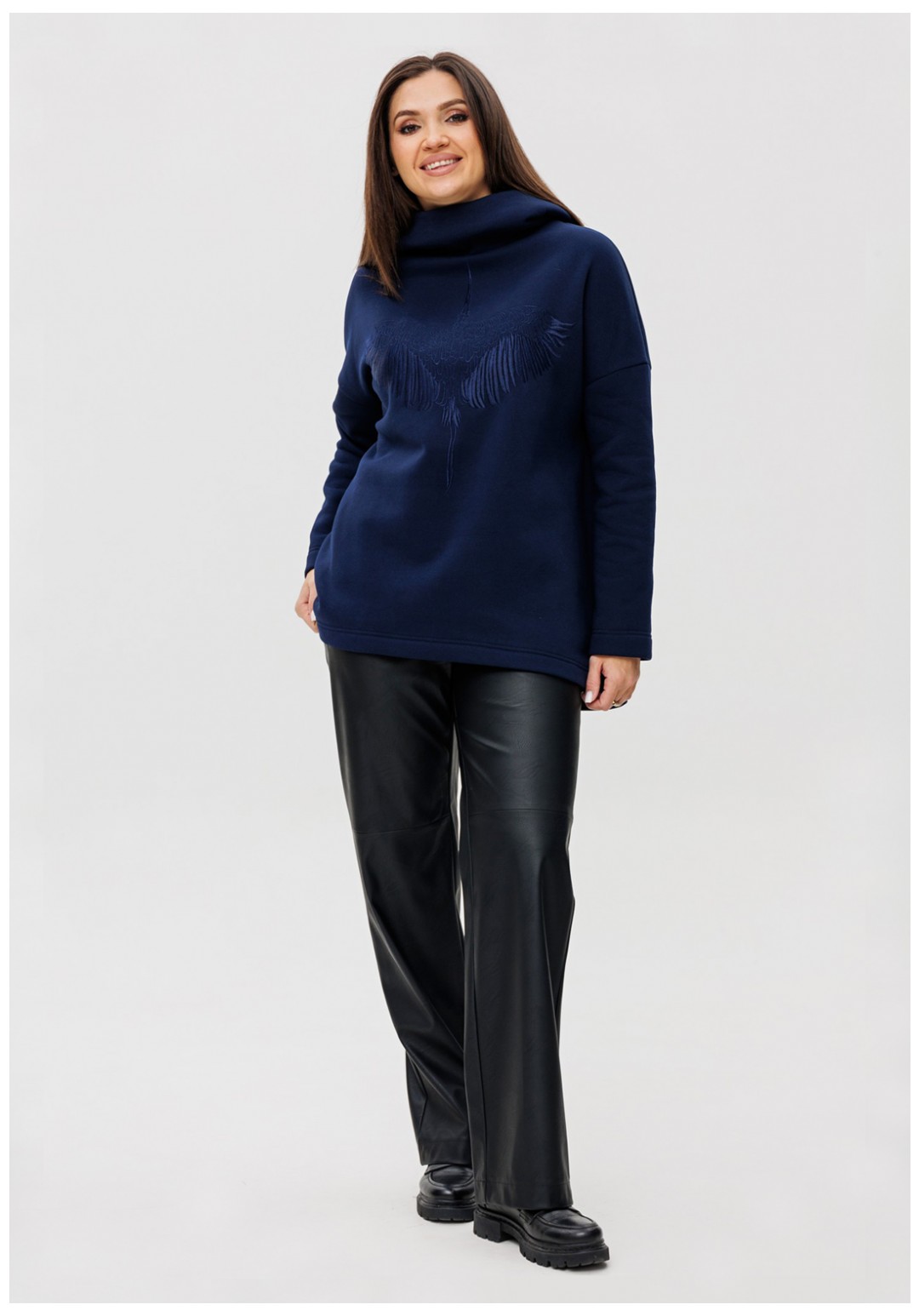 Джемпер с капюшоном. На груди выполнена дизайнерская вышивка "аист". Спинка цельная, низ фигурный. Длина спереди джемпера немного короче, чем по спинке. Рукав длинный одношовный втачной, линия плеча спущена. Джемпер выполнен из теплого трикотажа с начесом. Длина изделия 76-77,5 см в зависимости от размера, длина рукава от горловины 71-72,5 см.