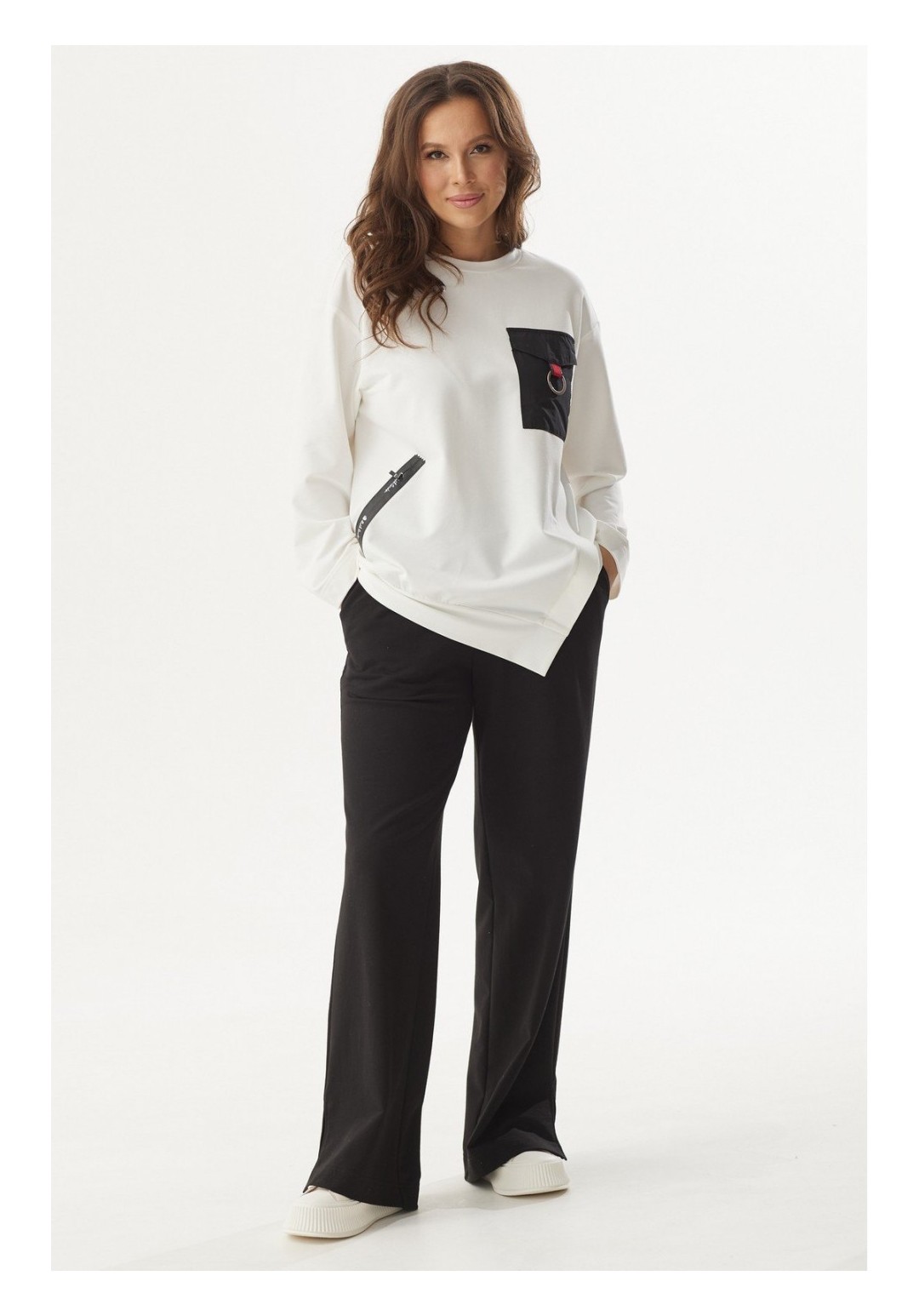 Стильный костюм из свитшота и брюк. Выполнен из футера без флиса. Свитшот свободного кроя со спущенным рукавом. Низ выполнен с асимметрией. Горловина округлой формы. На груди накладной карман с клапаном и декоративным элементом. Сбоку молния(имитация кармана) Брюки прямого свободного кроя, с притачным поясом, дополненным эластичной тесьмой. Посадка средняя. По бокам брюки дополнены удобными карманами. По низу брюк разрезы. Длина свитшота от плечевого шва 66см. Длина рукава 60см. Длина брюк по боковому шву 105см.
