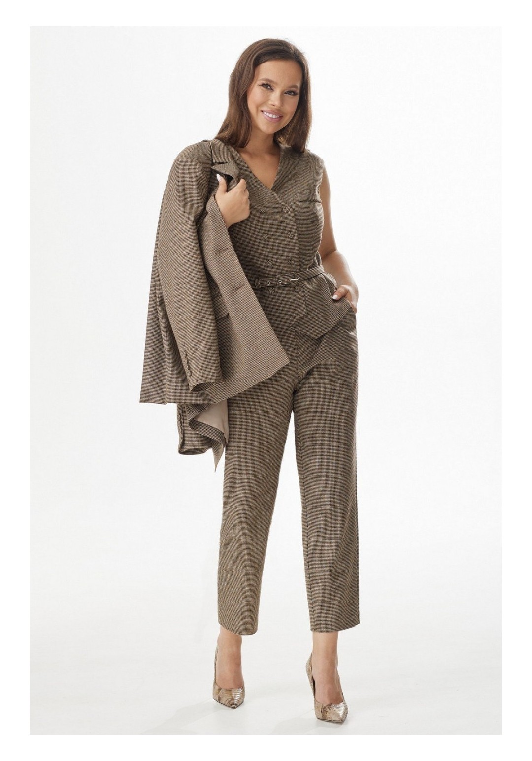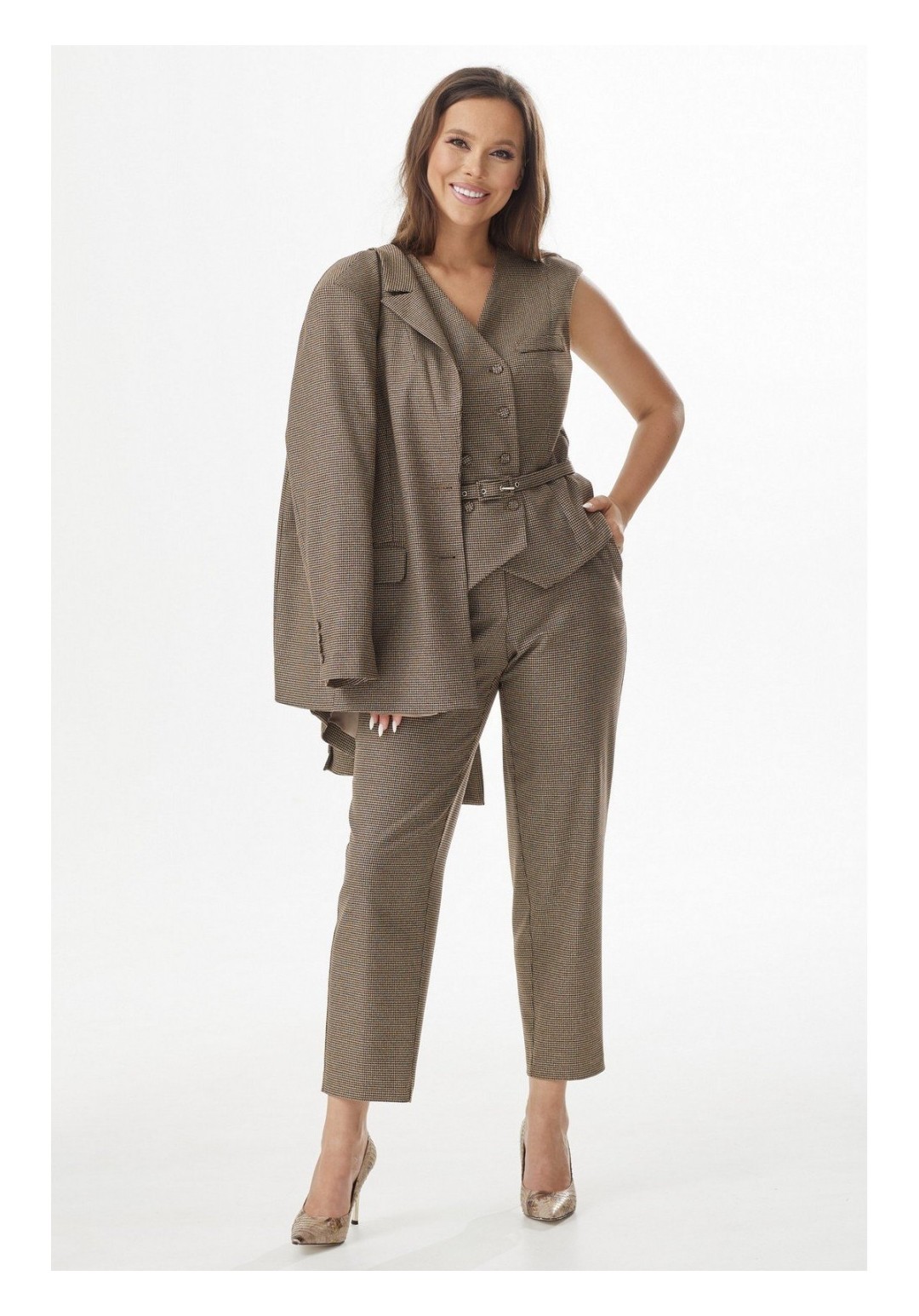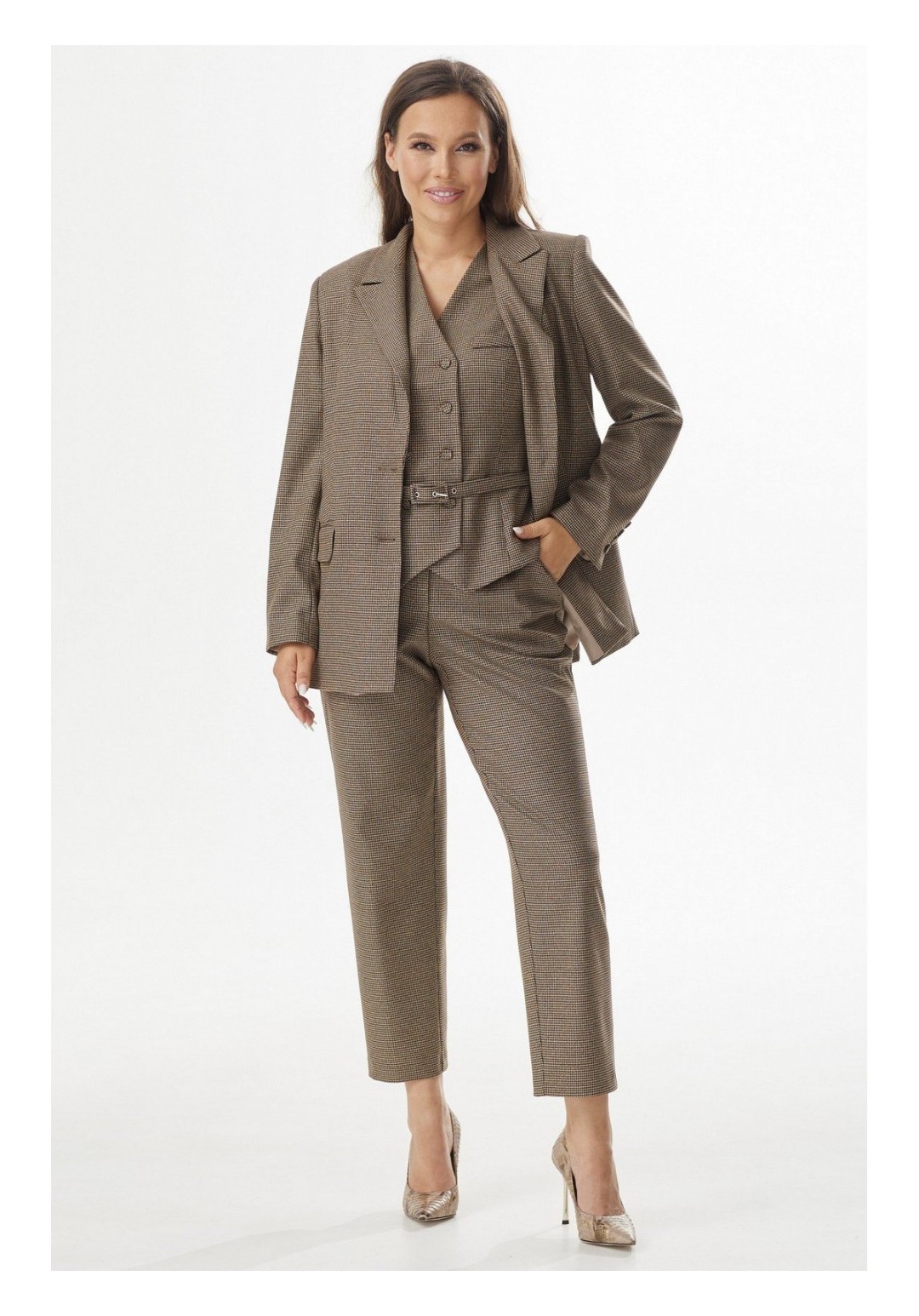Элегантный комплект из удлиненного жакета, жилета и брюк. Жакет свободного кроя, на подкладке, с центральной застежкой на пришивную пуговицу. Дополнен боковыми прорезными карманами с клапанами. Рукав втачной. Двубортный жилет приталенного силуэта, на подкладке, с отложным воротником, с центральной застежкой на пришивные пуговицы. Пояс в комплекте. Брюки классического кроя с притачным поясом, дополненным эластичной тесьмой, с застежкой на пришивную пуговицу и молнию. К низу брюки слегка заужены. Посадка средняя. Дополнены функциональными боковыми карманами. Длина жакета от плечевого шва 70 см. Дина рукава 60 см. Длина жилета от плечевого шва 57 см. Длина брюк 97 см