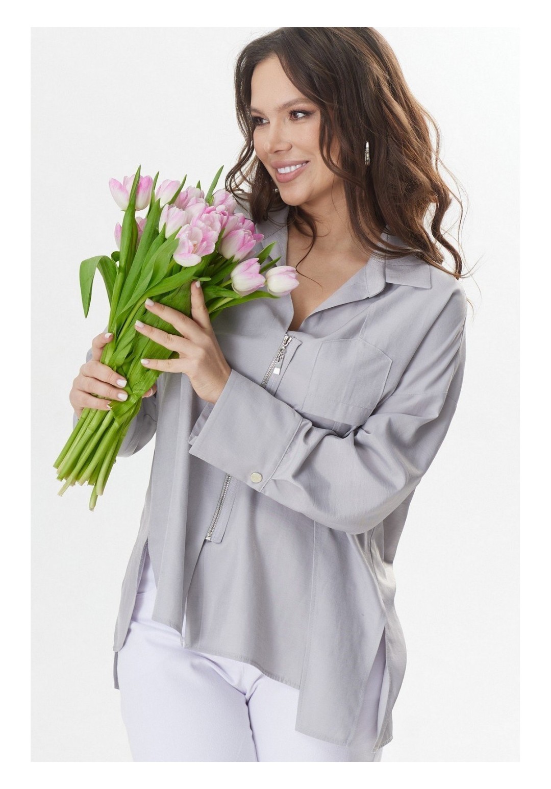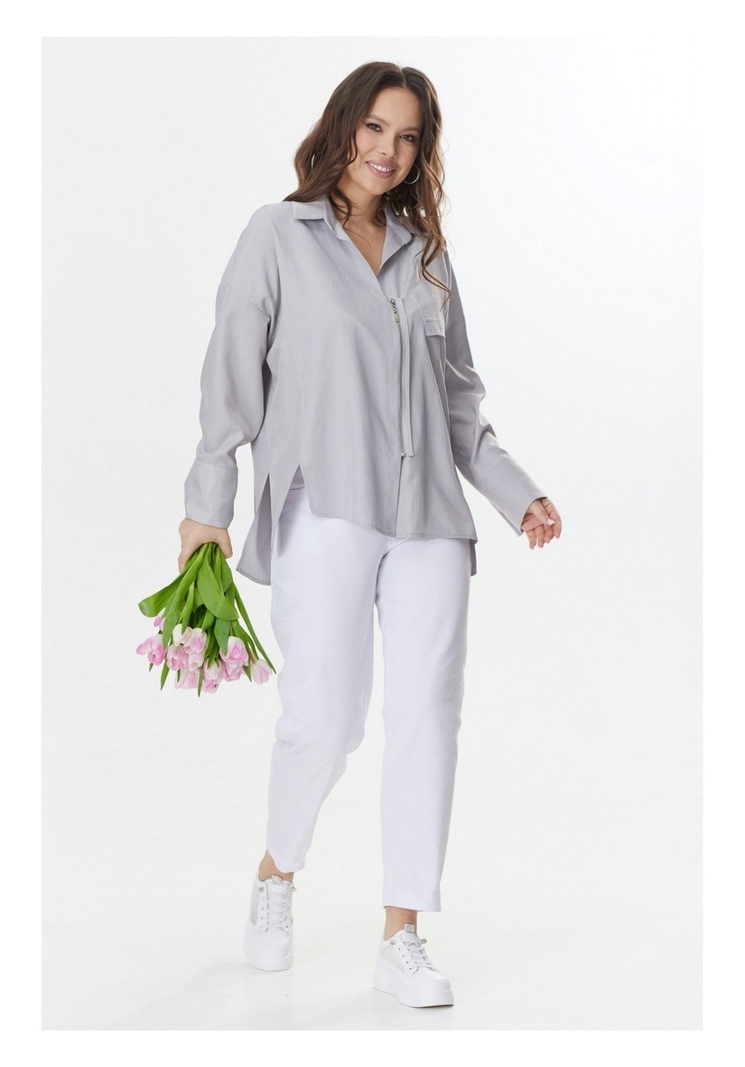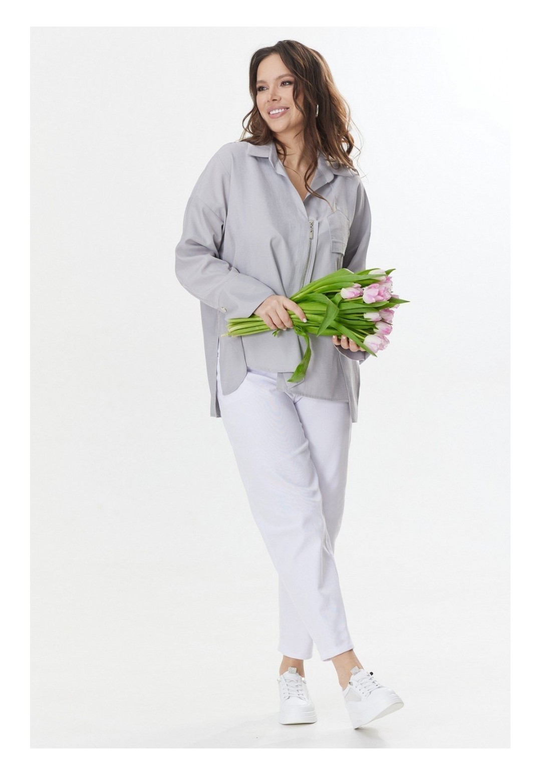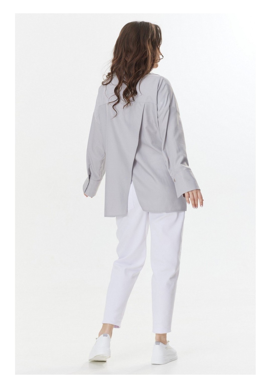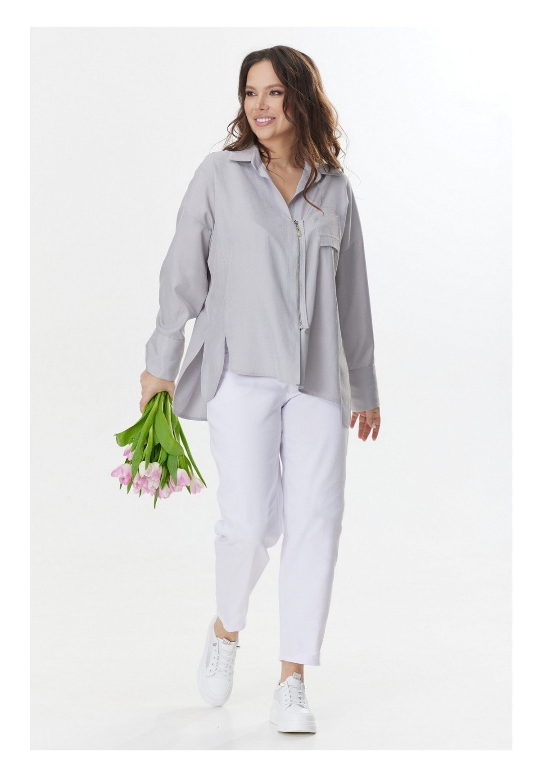 Стильный комплект из блузы и брюк. Блуза свободного оригинального кроя с центральной застежкой на молнию. Выполнена из приятного к телу поливискозного полотна. Воротник отложной. Рукав втачной, слегка спущен, дополнен притачной манжетой. Брюки прямого классического кроя, слегка заужены книзу, с притачным поясом. Выполнены из джинсовой ткани. Посадка средняя. Застежка на молнию и пришивную пуговицу. Дополнены боковыми и задними карманами. Длина блузы от плечевого шва 70см. Длина рукава 60см. Длина брюк по боковому шву 92 см.