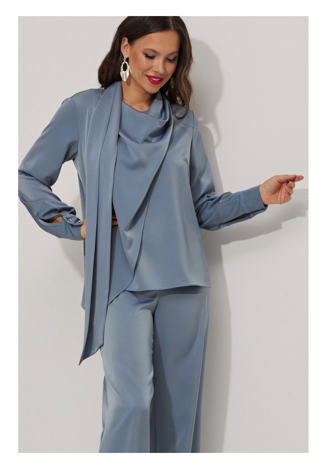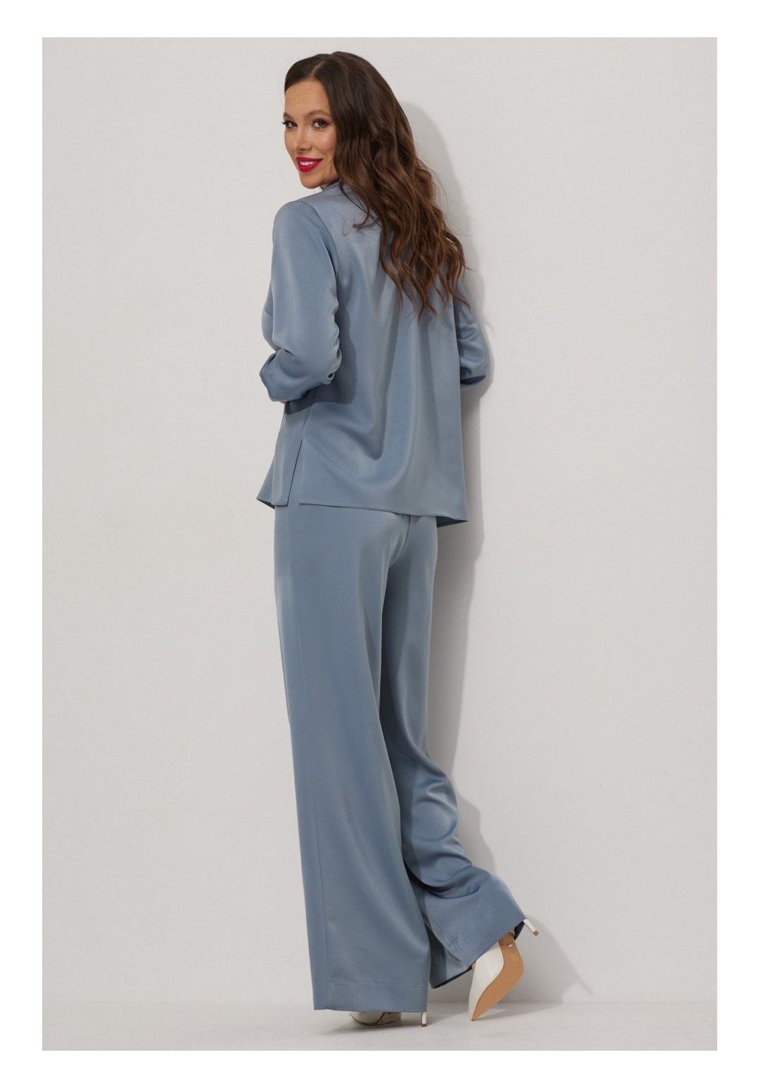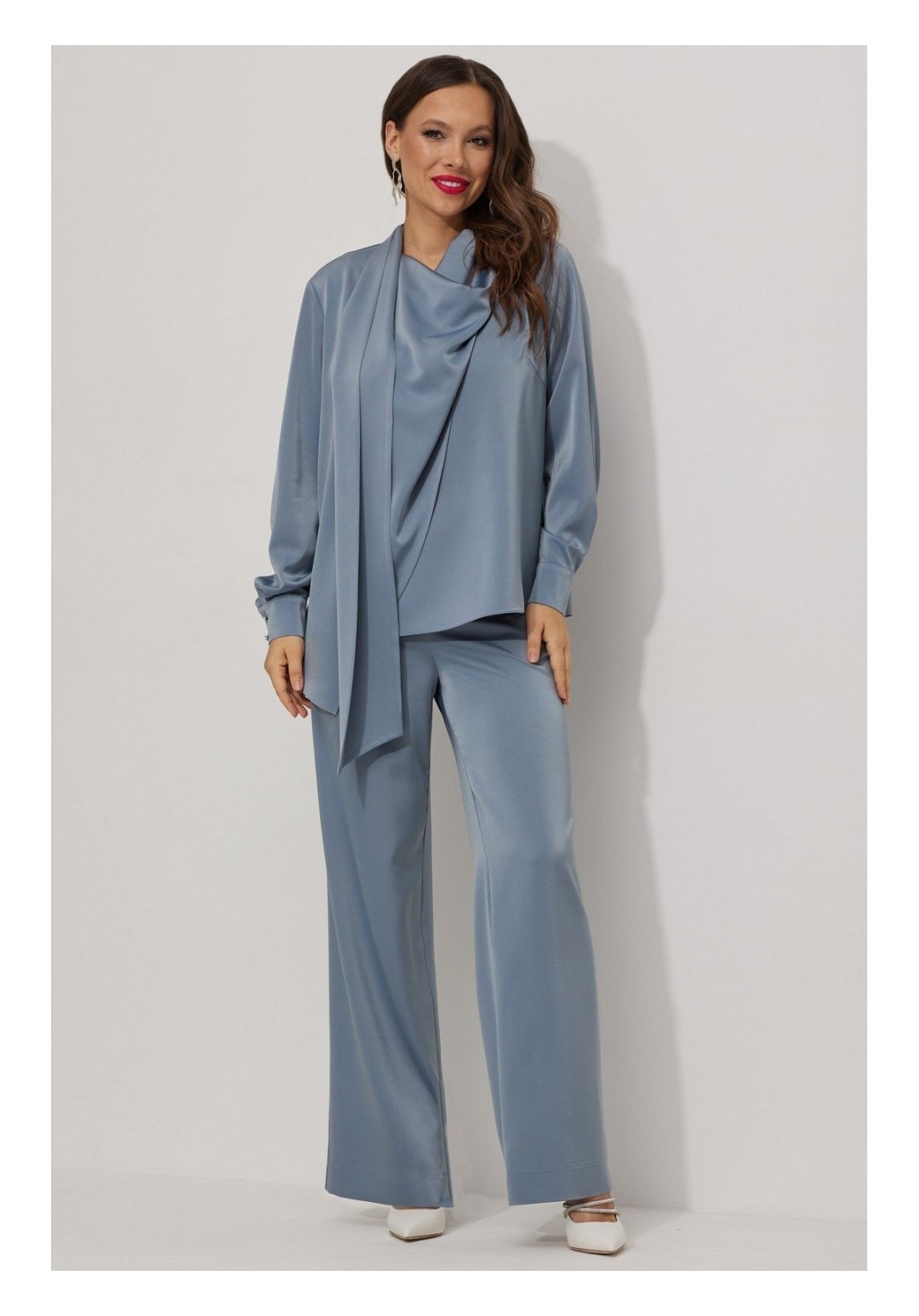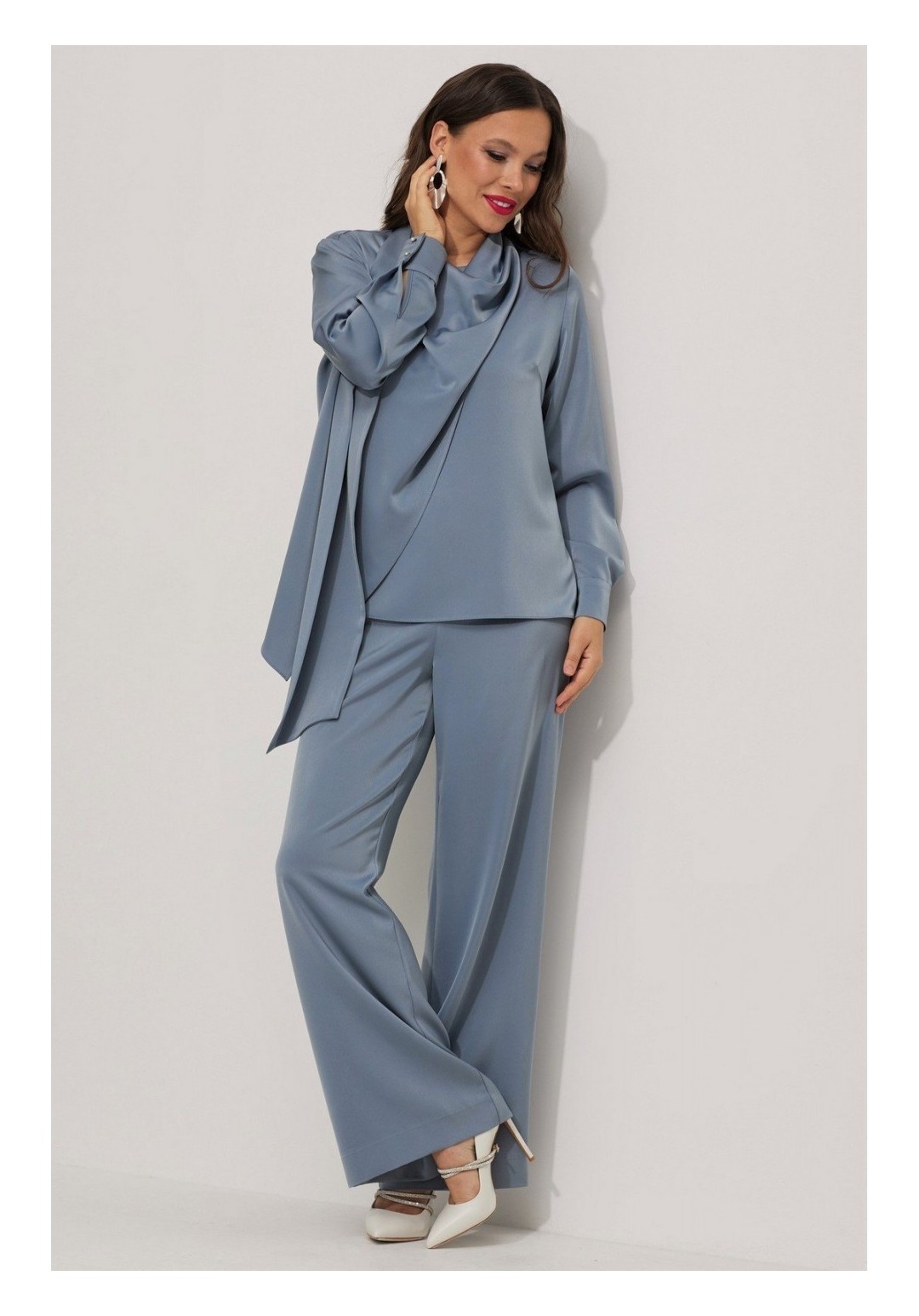 Элегантный комплект из блузы и брюк, выполненных из струящейся ткани средней плотности с атласным блеском. Блуза свободного кроя со слегка спущенным рукавом, дополненным притачной манжетой с застежкой на красивые пришивные пуговицы. Блуза дополнена притачным элементом, который драпируется вокруг горловины с помощью пришивных шлевок. По спинке застежка капелька на пришивную пуговицу. Брюки прямого кроя с притачным поясом, дополненным эластичной тесьмой. Застежка на потайную молнию и пуговицу. Длина блузы от плечевого шва 64см. Длина рукава 61см. Длина рукава 109см.