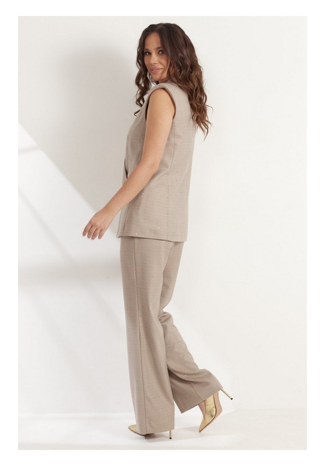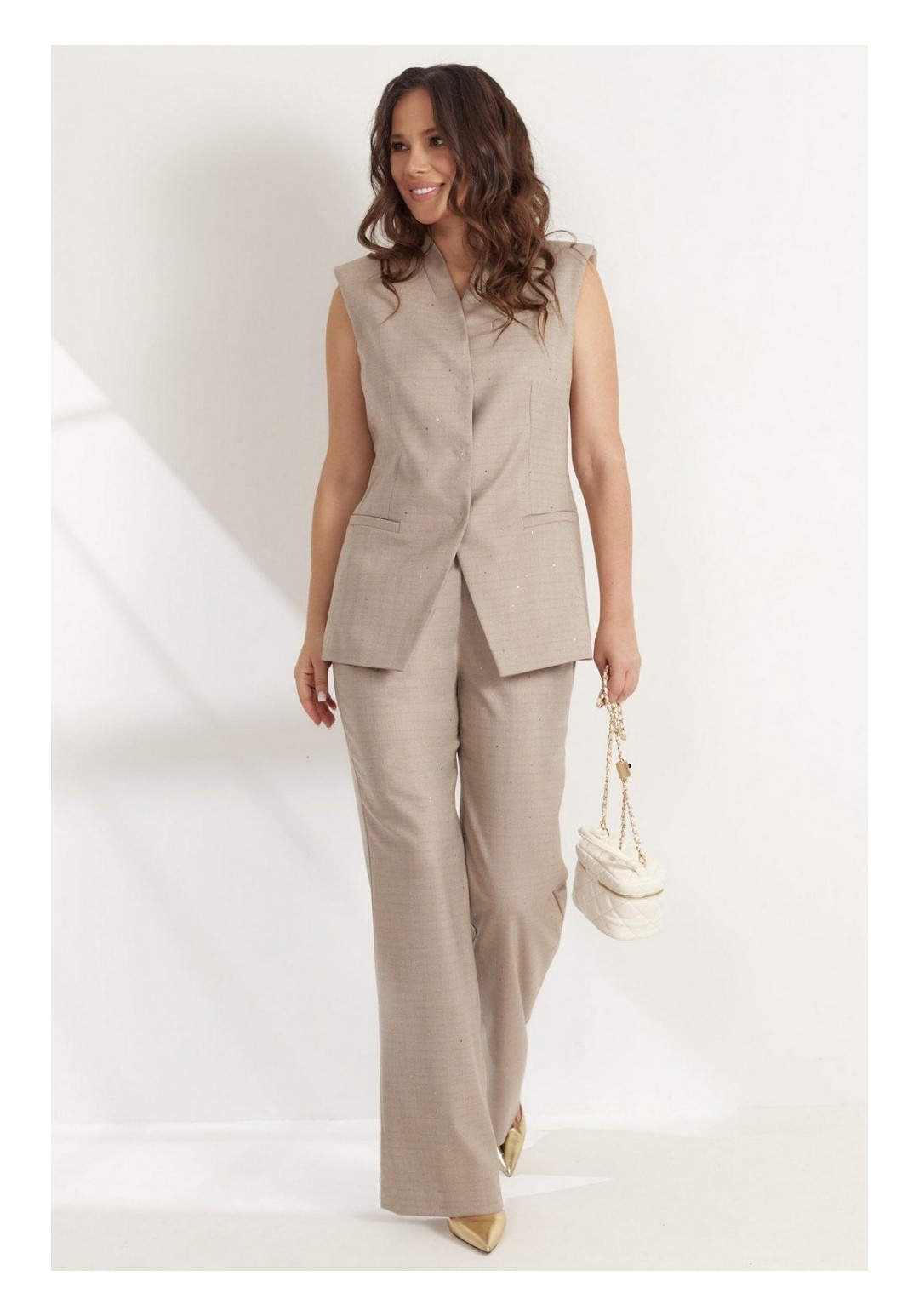Элегантный комплект из жилета и брюк. Крой костюма выгодно подчеркивает фигуру и скрывает недостатки. Выполнен из костюмной ткани с россыпью мелких пришивных пайеток, создающих легкое мерцание. Жакет полуприталенного силуэта, на подкладке, с центральной застежкой на потайные кнопки. Дополнен функциональными карманами. Брюки классического прямого кроя с притачным поясом, дополненным эластичной тесьмой. Дополнены удобными боковыми карманами. Застежка гульфик на молнию и пришивную пуговицу. Длина жилета от печевого шва 70см. Длина брюк 109
