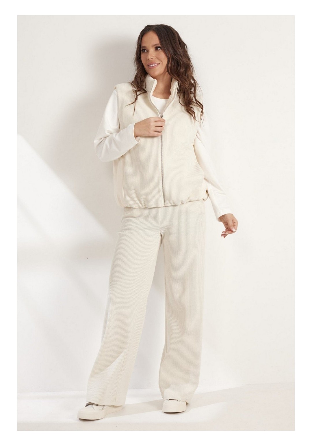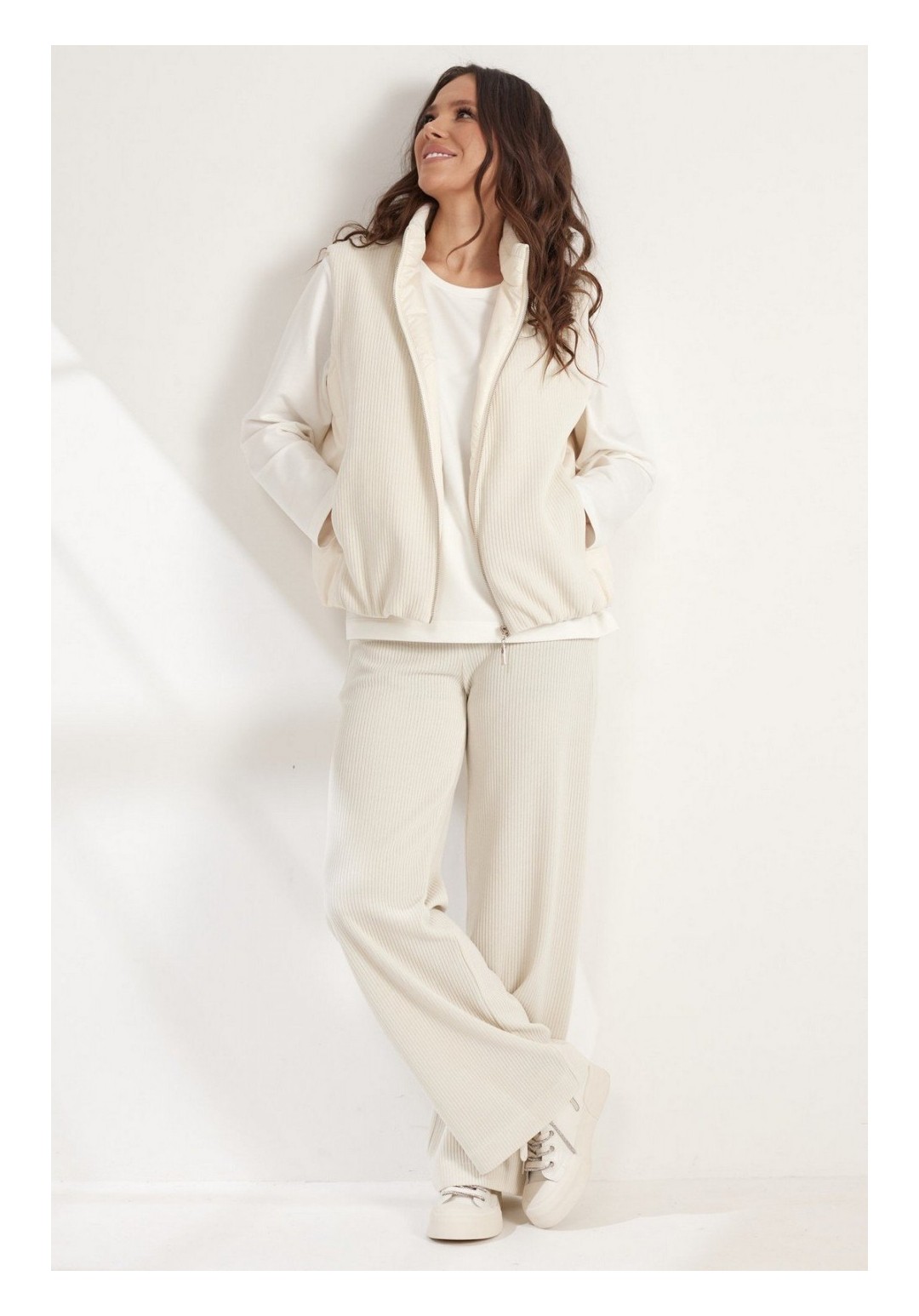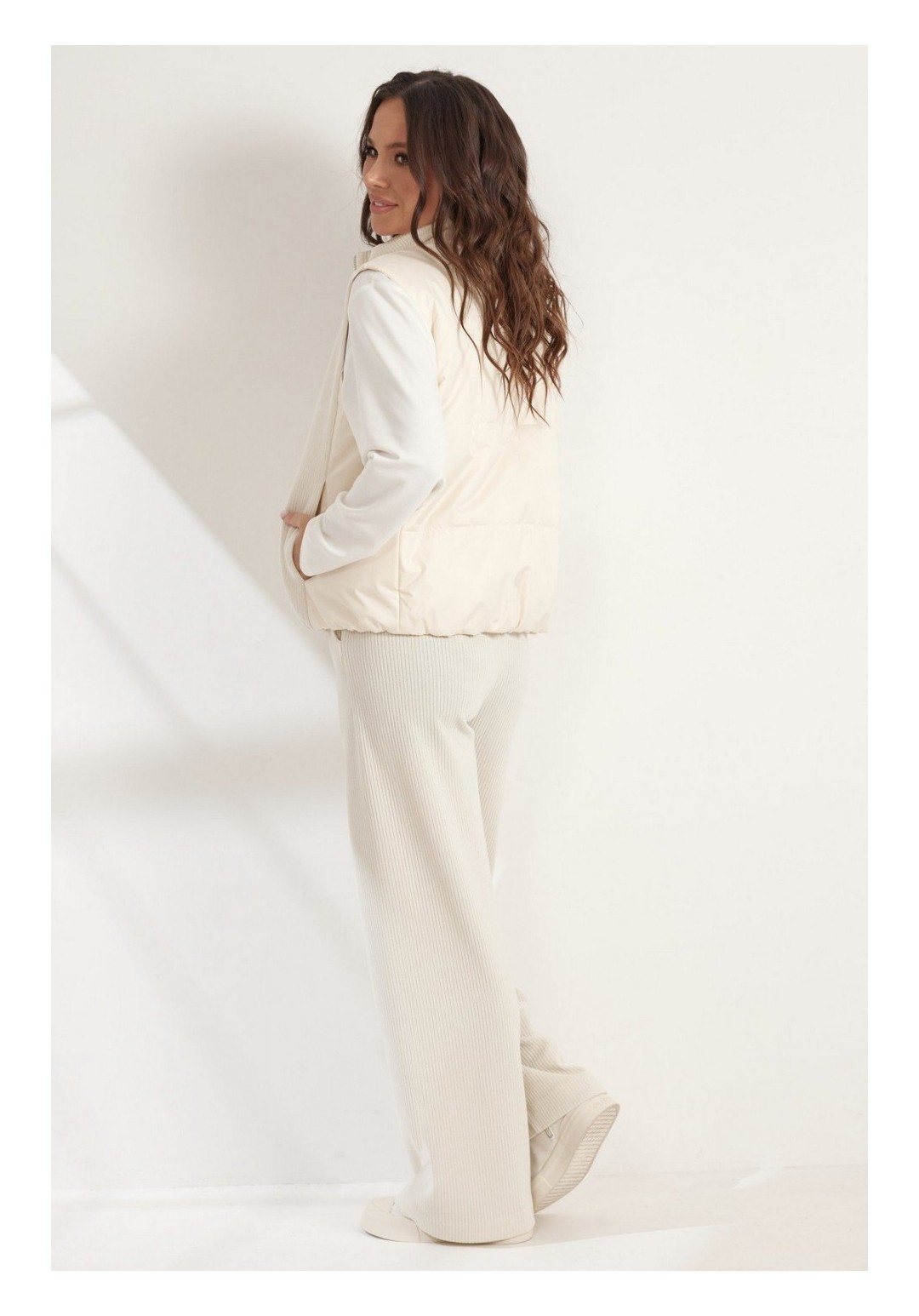 Нежный и уютный комплект из утепленного жилета и брюк, выполненных из фактурного трикотажного полотна(штрукс), и джемпера. Жилет свободного прямого кроя с центральной застежкой на металлическую молнию. Горловина обработана стойкой. Перед жилета выполнен из трикотажного полотна, спинка выполнена из плащевой ткани. Жилет дополнен удобными боковыми карманами с застежкой на молнию. Джемпер свободного прямого кроя со слегка спущенным рукавом. Брюки прямого свободного кроя, с притачным поясом, дополненным эластичной тесьмой. Посадка средняя. По бокам брюки дополнены удобными карманами. Длина жилета от плечевого шва 62см. Длина джемпера от плечевого шва 63см. Длина рукава 60см. Длина брюк по боковому шву 107см.