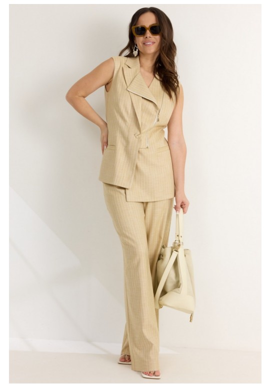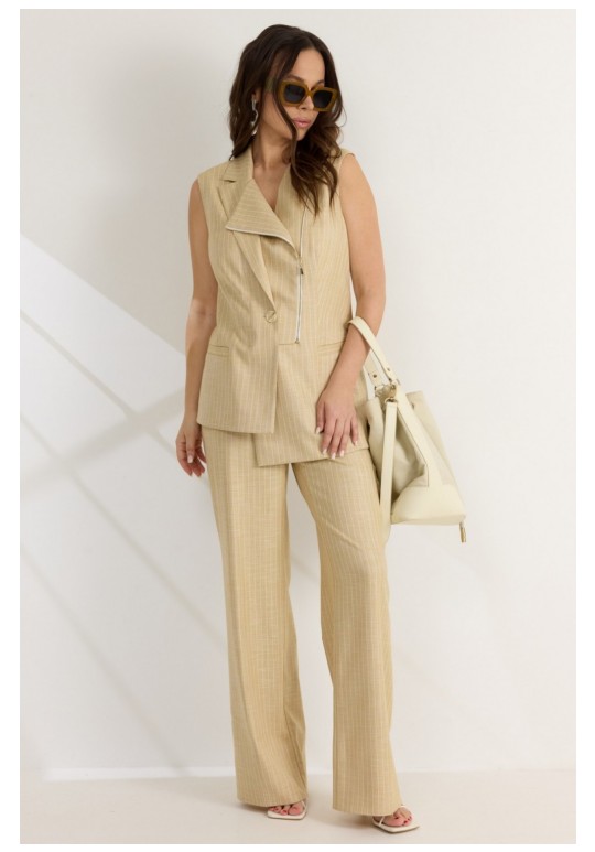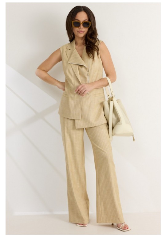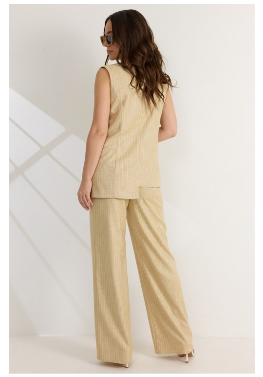 Стильный комплект из жилета и брюк. Жилет полуприлегающего силуэта с оригинальной застежкой на косую молнию и пуговицу. Перед жилета на хлопковой подкладке. Низ жилета ассиметричный. Брюки свободного кроя с притачным поясом, дополненным эластичной тесьмой. Застежка гульфик на молнию и пуговиц. Брюки дополнены функциональными боковыми карманами. Длина жилета от плечевого шва 74см. Длина брюк по боковому шву 106см.