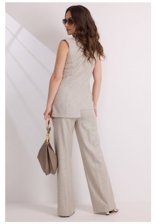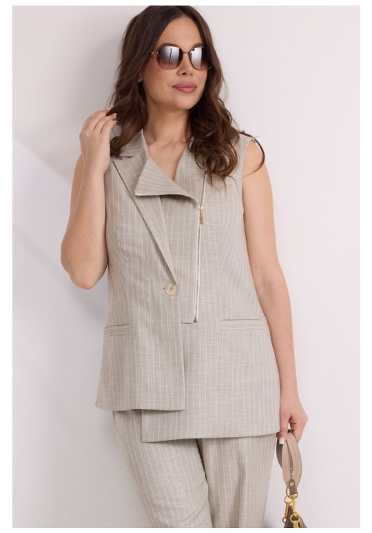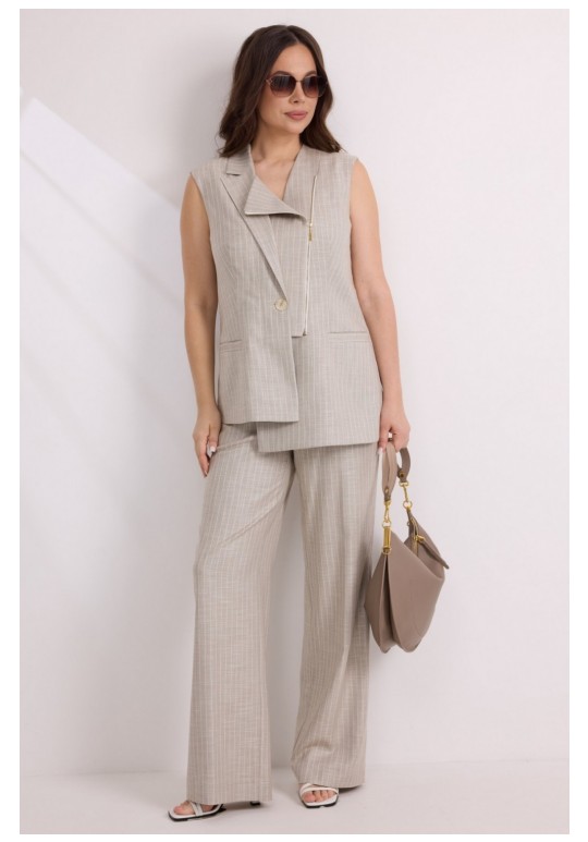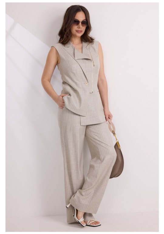 Стильный комплект из жилета и брюк. Жилет полуприлегающего силуэта с оригинальной застежкой на косую молнию и пуговицу. Перед жилета на хлопковой подкладке. Низ жилета ассиметричный. Брюки свободного кроя с притачным поясом, дополненным эластичной тесьмой. Застежка гульфик на молнию и пуговиц. Брюки дополнены функциональными боковыми карманами. Длина жилета от плечевого шва 74см. Длина брюк по боковому шву 106см.