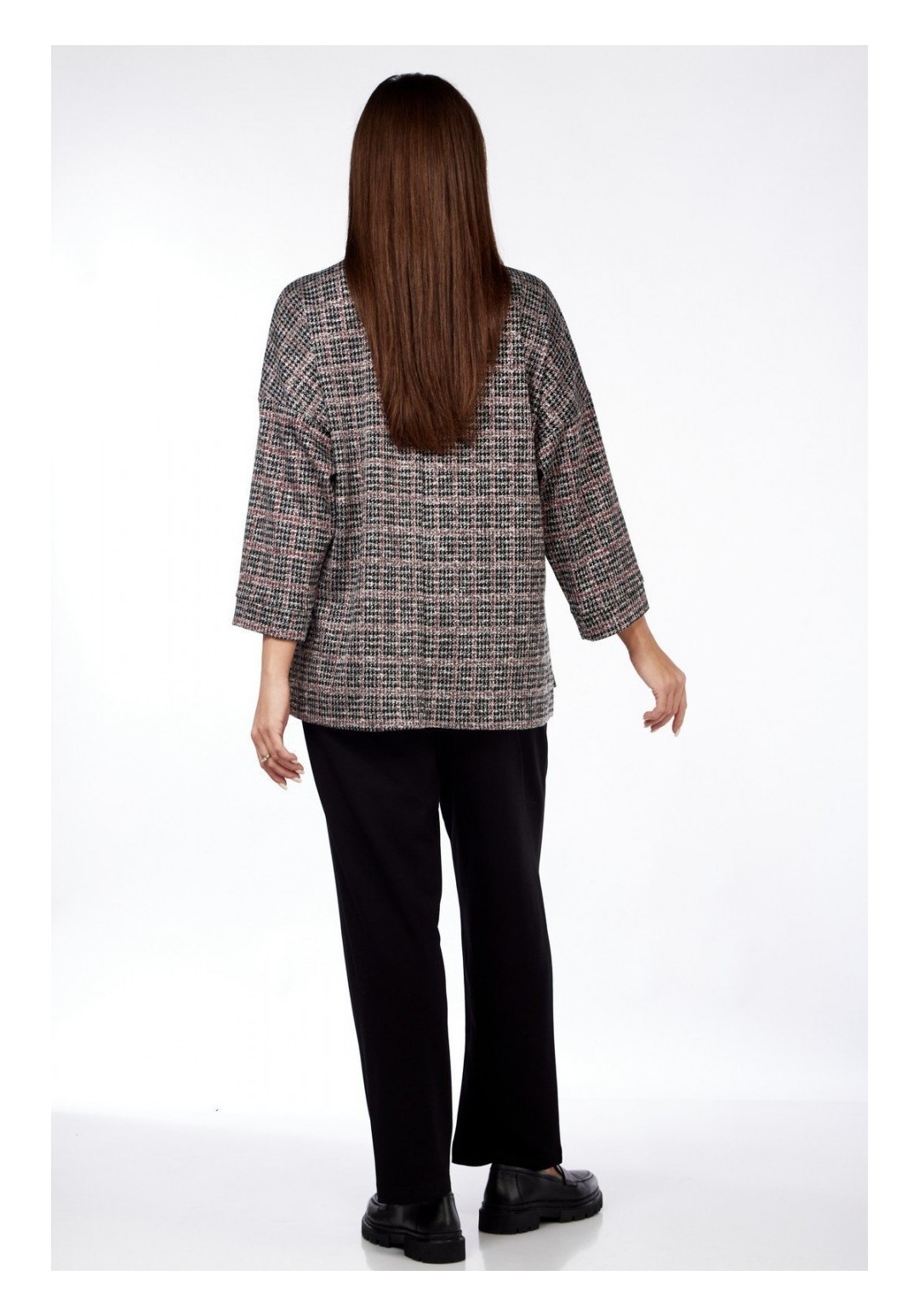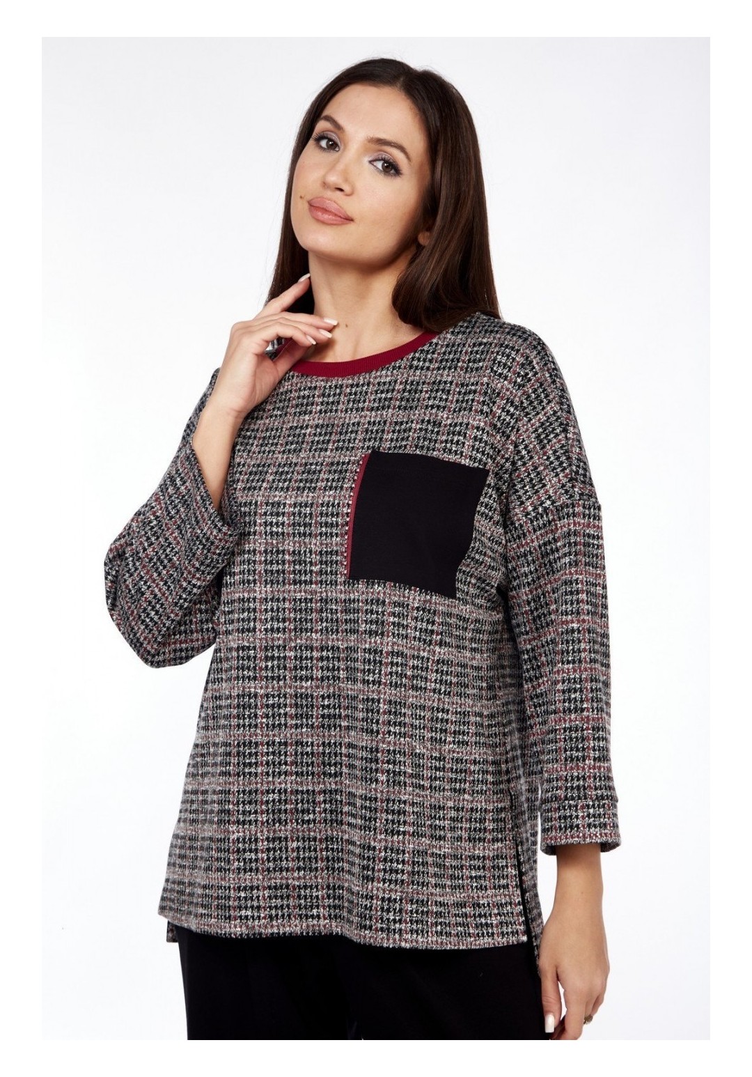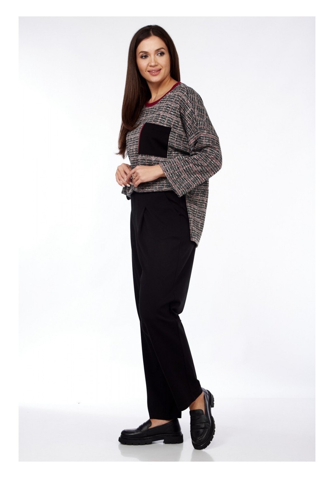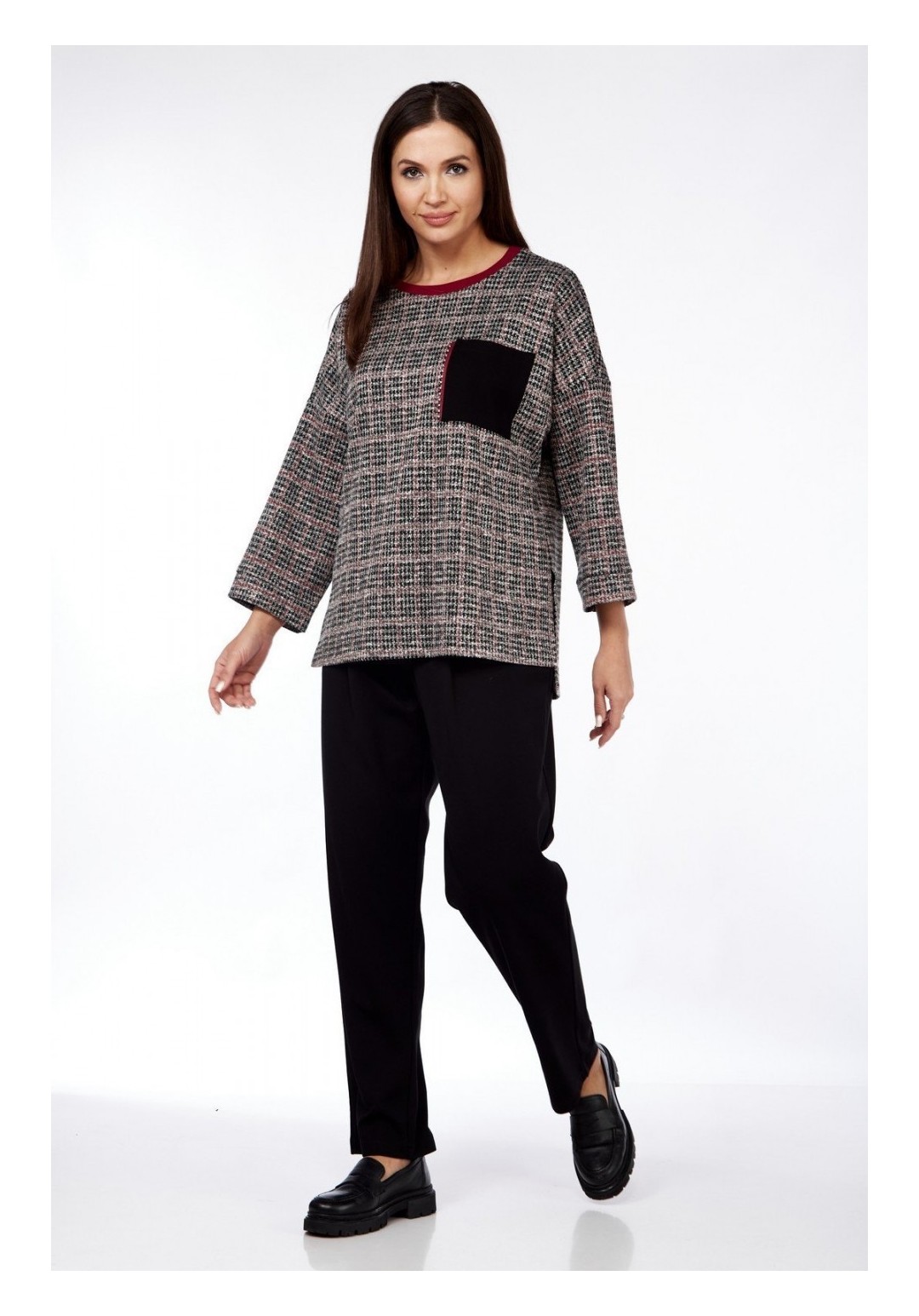 Удобный и практичный повседневный женский комплект в стиле спорт-шик, прекрасно сочетающийся с другими элементами одежды Вашего гардероба. Комплект женский брючный из трикотажа. Джемпер оверсайз с рукавом 3/4 с притачной манжетой из основной ткани. Вырез горловины круглый, обработан трикотажной притачной планкой резинкой. В качестве декора на груди джемпера накладной карман. Спинка джемпера немного длинее переда. По бокам высокие разрезы. Брюки-бананы длиной 7/8, с целнокроенной манжетой по низу, по верху на притачном поясе с резинкой. Имеются два кармана в бокоых швах. Длина изделия по спинке 67см± 1см, длина рукава от плечевого шва 57см± 1см. Длина брюк по боковому шву 96 см± 1см, по шаговому шву 64см± 1см. Изделие подойдет на рост 170см.