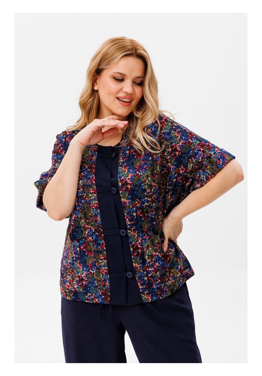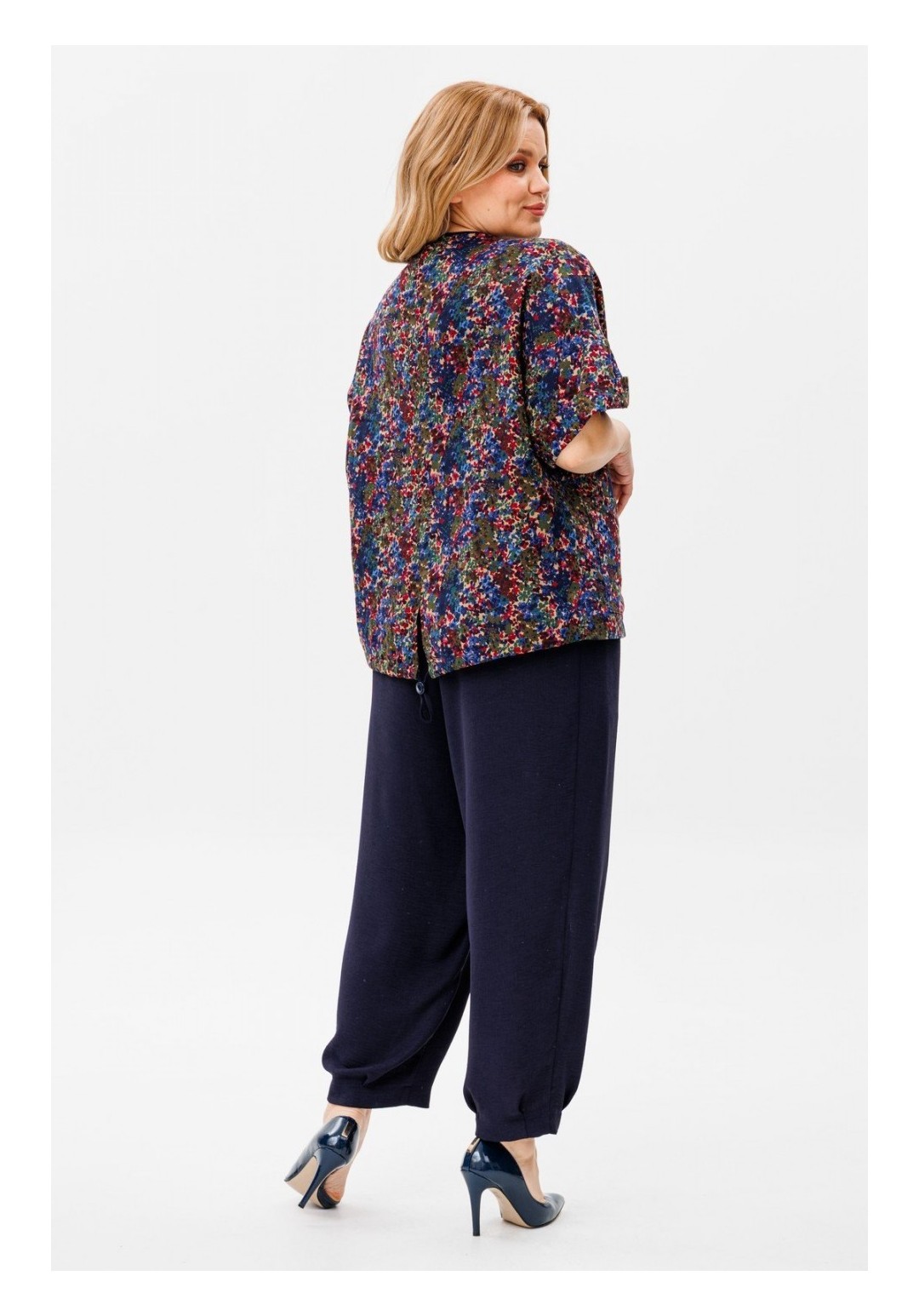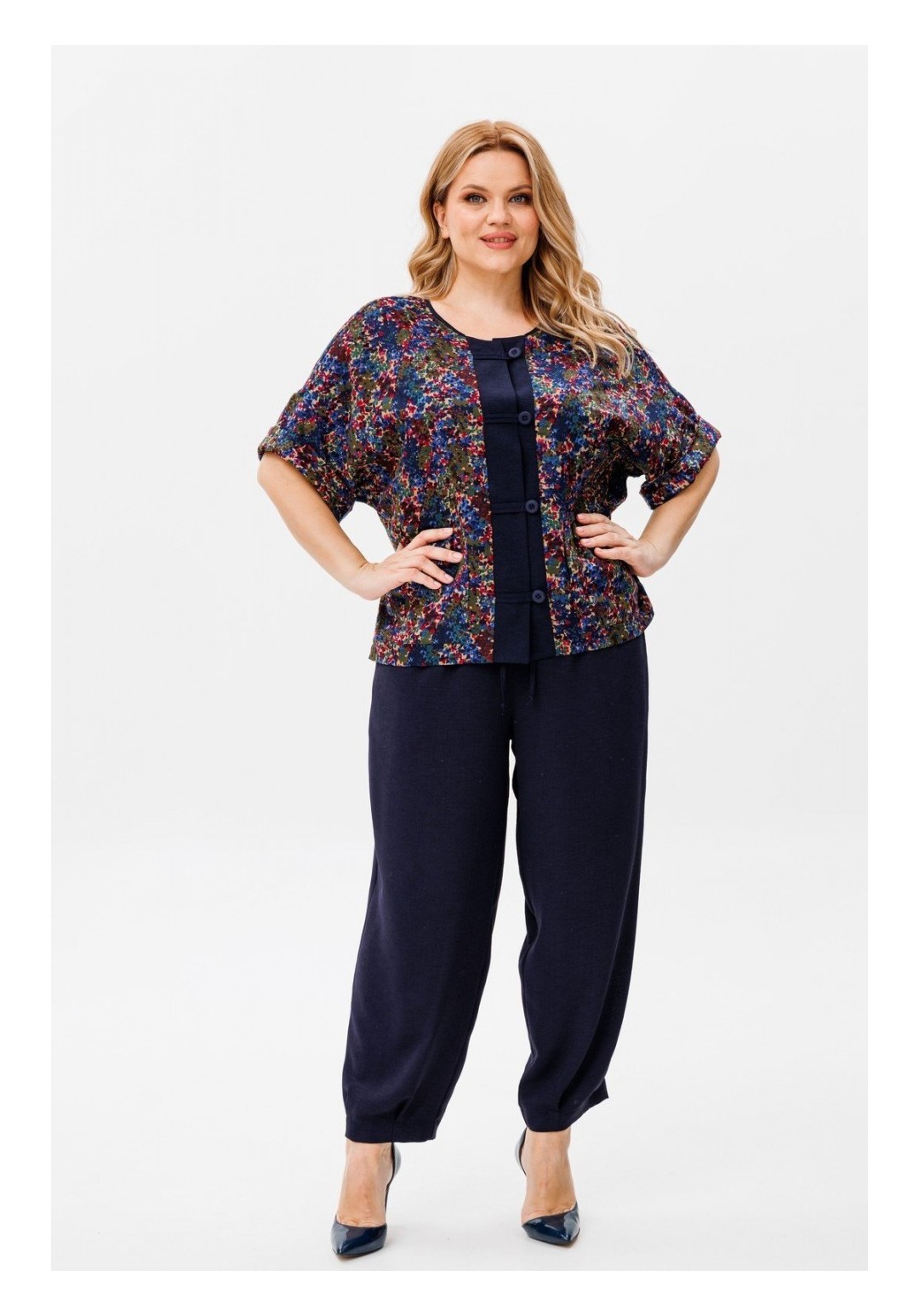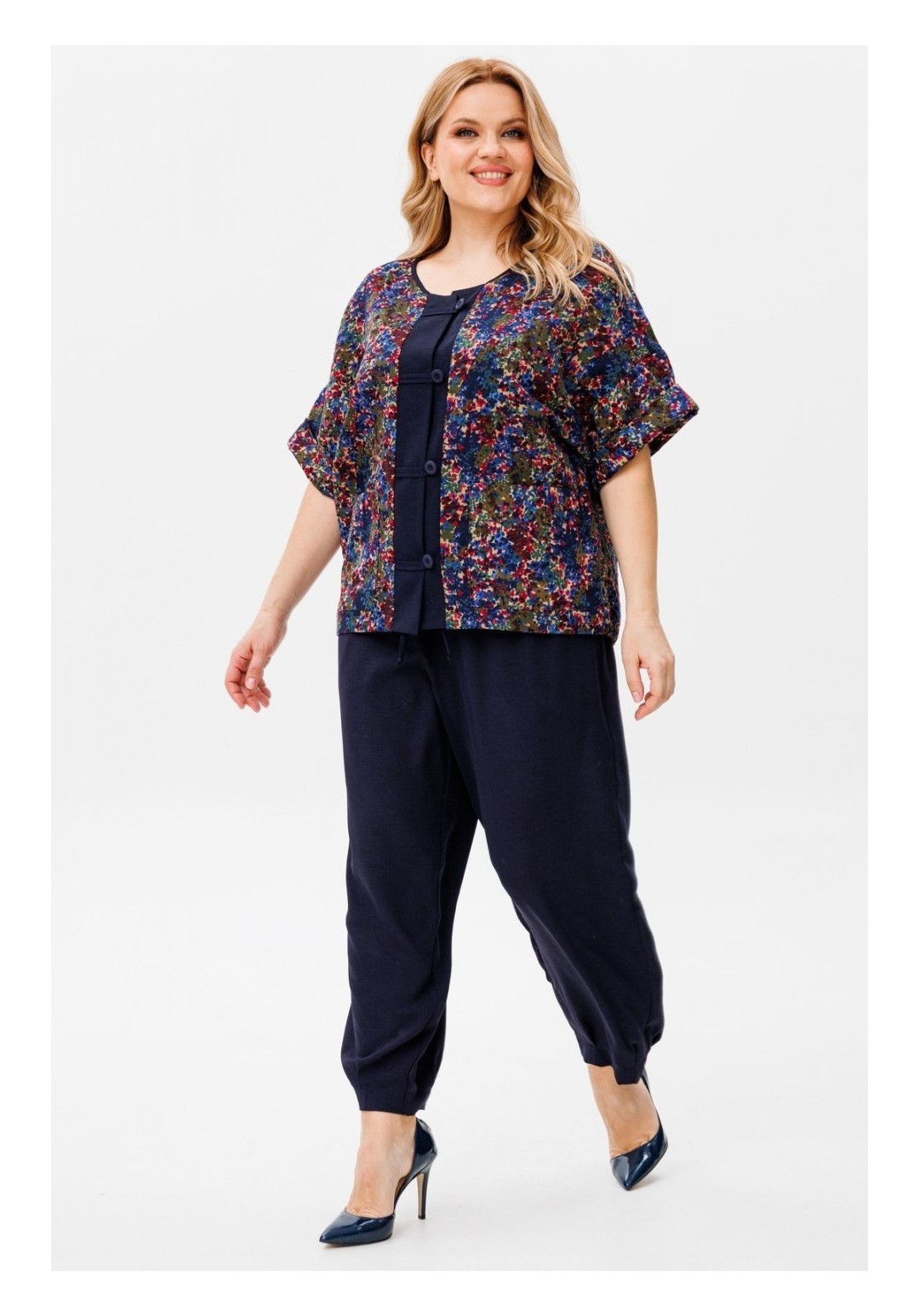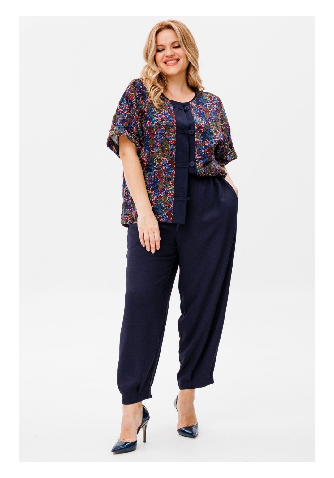 Универсальный и удобный женский й костюм выполнен из двух предметов: жакета и брюк. Жакет из натуральной ткани, свободного силуэта, с цельнокроенным коротким рукавом с манжетой. Перед жакета с прямой застежкой на навесные петли с пуговицами. Брюки-шаровары выполнены из струящейся ткани, длиной 7/8, по верху с поясом на резинке, имеются боковые карманы в швах. Комплект смело сочетается с любой обувью, будет назаменим для будней и любых торжественных мероприятий. Длина жакета по спинке 55 см+-1 см, длина рукава от горловины 41 см ± 1см. Длина брюк по боковому шву 99 см+-1см, по шаговому 66 см+-1см. Изделие подойдет на рост 170 см.
