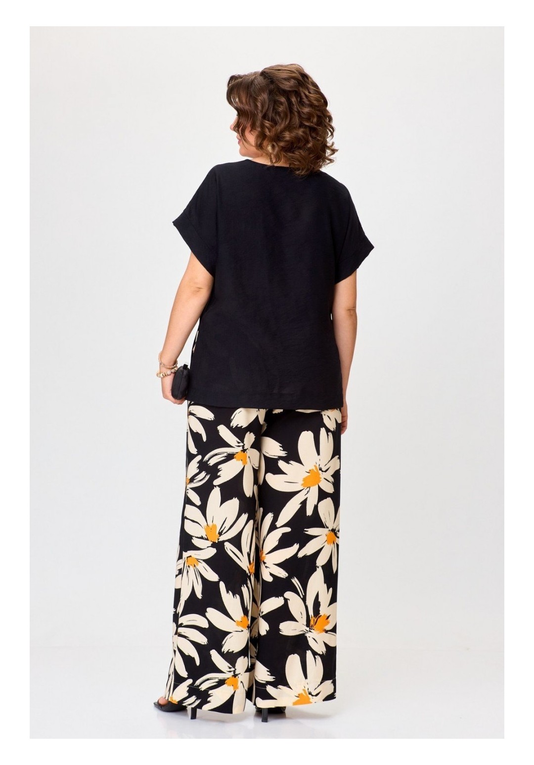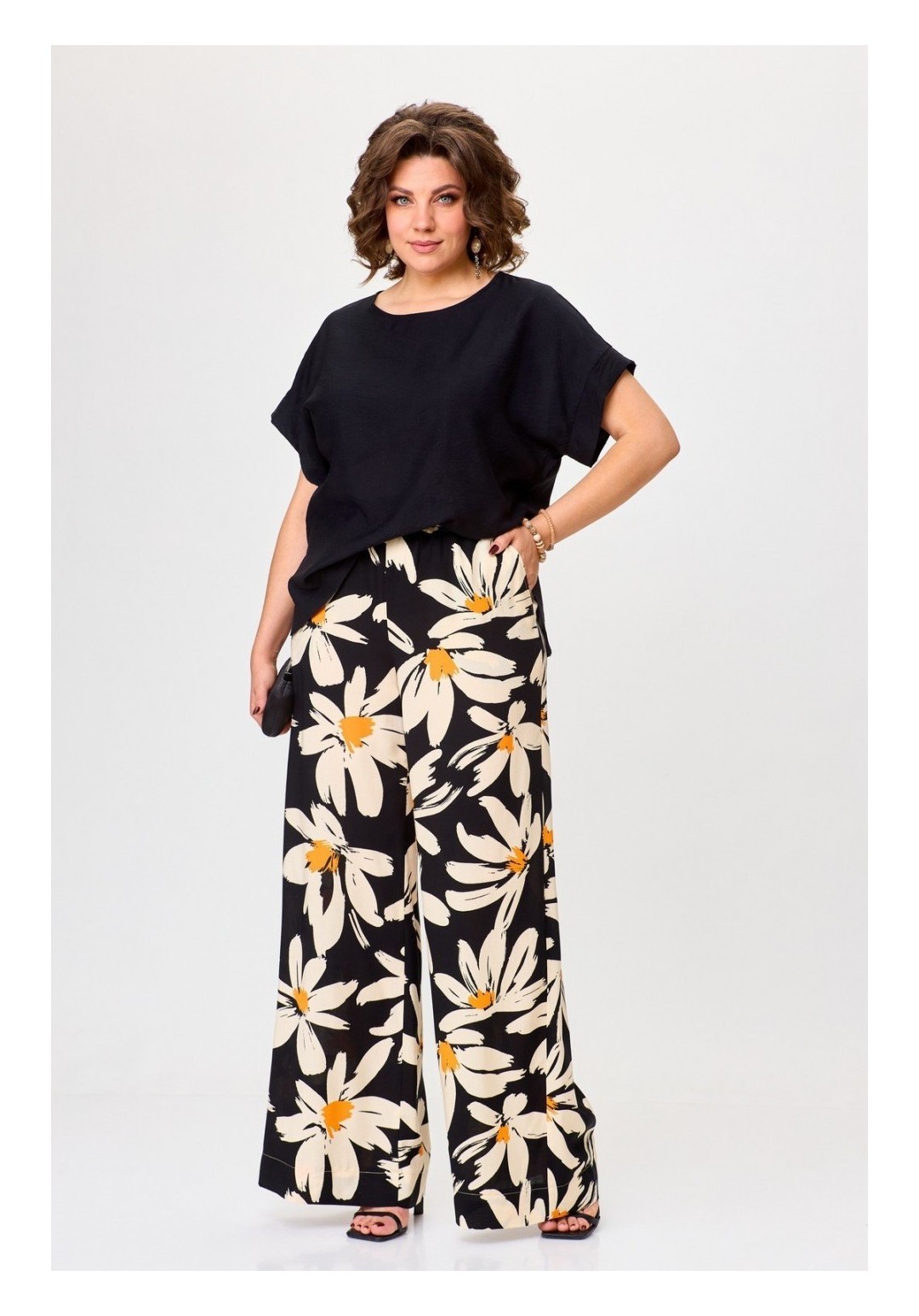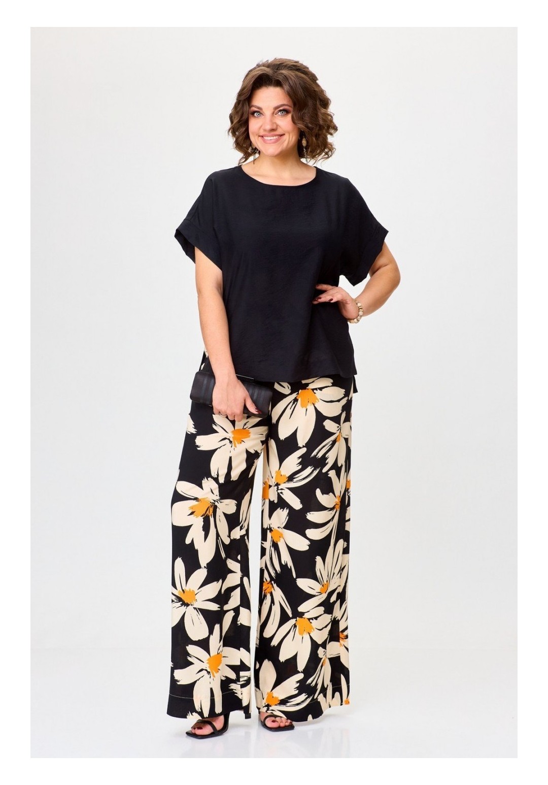 Комплект женский брючный повседневный, будет актуальным, как и для рабочих будней, также и торжественных мероприятий. Комплект свободного кроя, выполнен из легкой струящейся вискозной ткани. Блуза с коротким спущенным рукавом, круглой горловиной, ассиметричным низом, где спинка длиннее переда, по бокам имеются разрезы. Брюки- палаццо, на поясе с резинкой, наклонные карманы в боковых швах. Длина блузы по спинке 66+-1 см, длина рукава от горловины 29+-1см, длина брюк по боковому шву 117+-1 см, длина брюк по шаговому шву 82 +-1 см. Изделие подойдет на рост 170 см.