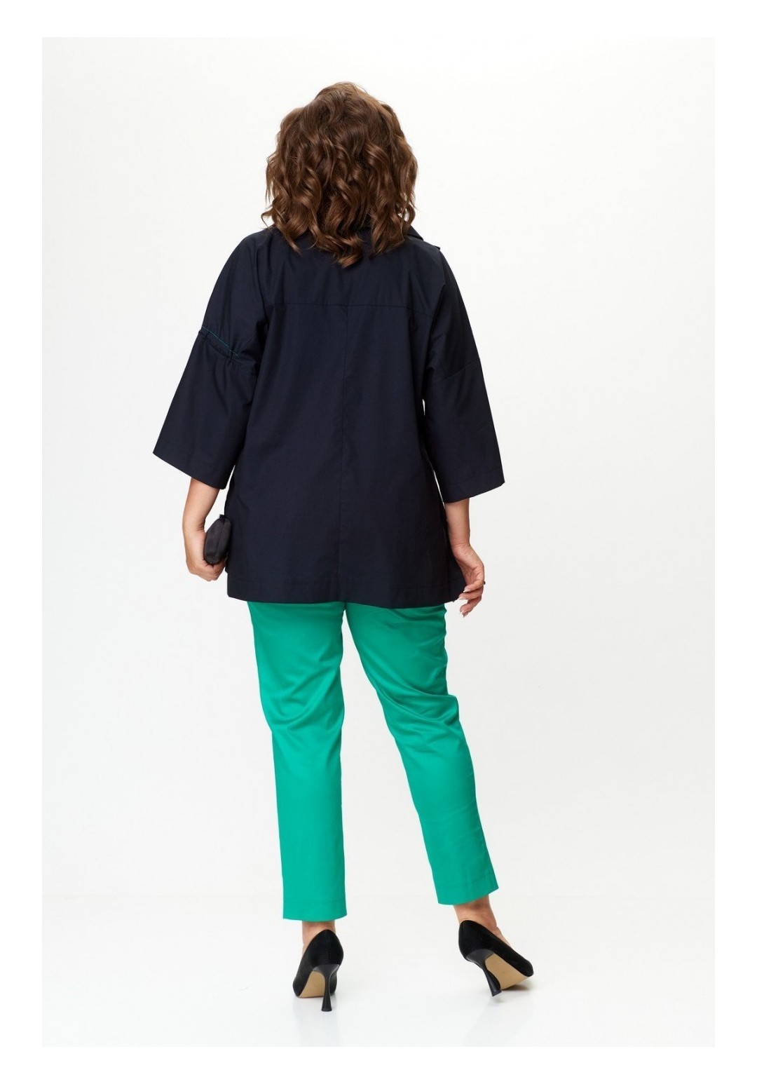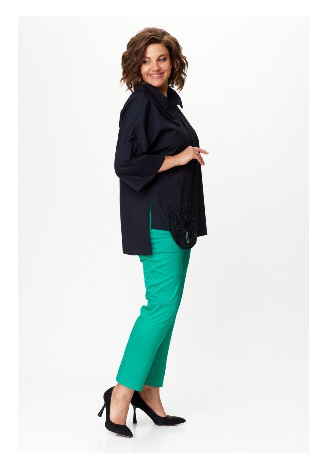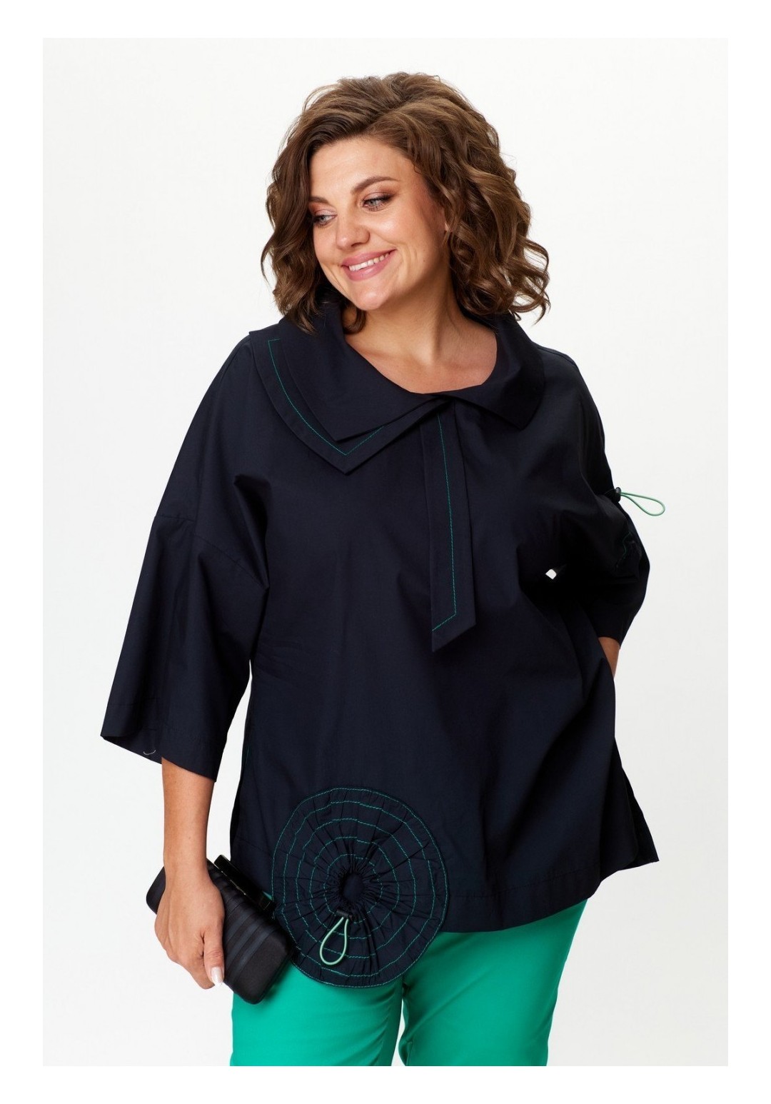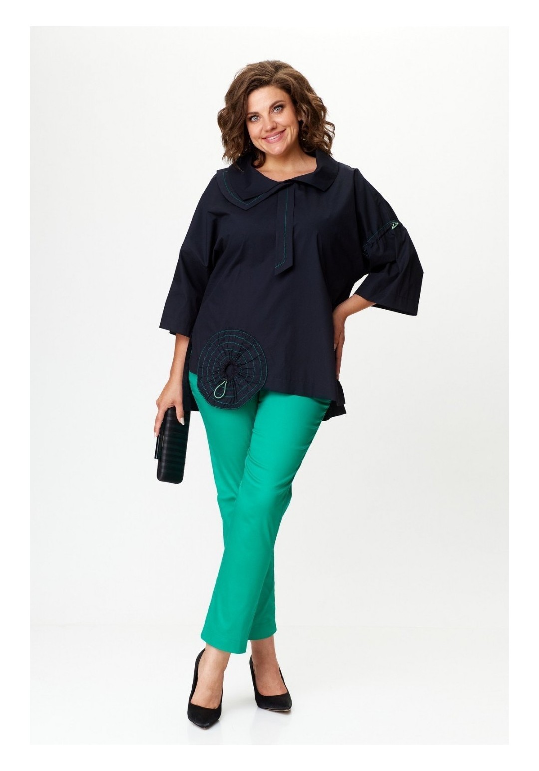Комплект женский брючный повседневный. Женская хлопковая блуза в стиле бохо свободного кроя, вырез горловины круглый с раскладным асимметричным воротником, по спинке скрепленным патой, а по переду с декоративным галстуком. Рукав втачной 3/4, низ блузы так же с асимметрией и боковыми разрезами. Перед цельный, спинка разрезная с плечевой кокеткой, переходящей в рукав. Левый рукав — с кулиской и декоративной стяжкой. Так же по переду круглый декоративный карман-стяжка. Брюки выполнены из хлопковой ткани средней плотности, длина 7/8, слегка заужены к низу, по верху на притачном поясе с резинкой по бокам. По переду с двумя боковыми карманами в швах и центральной застежкой на молнию и пуговицу. Универсальность кроя и легкая ткань сделают его любимым изделием Вашего гардероба. Длина блузы по спинке 74 (+/- 1 см), длина рукава от горловины 55 (+/- 1 см). Длина брюк по боковому шву 100 см (±1 см), длина брюк по шаговому шву 72 +-1 см. Изделие подойдет на рост 170 см.