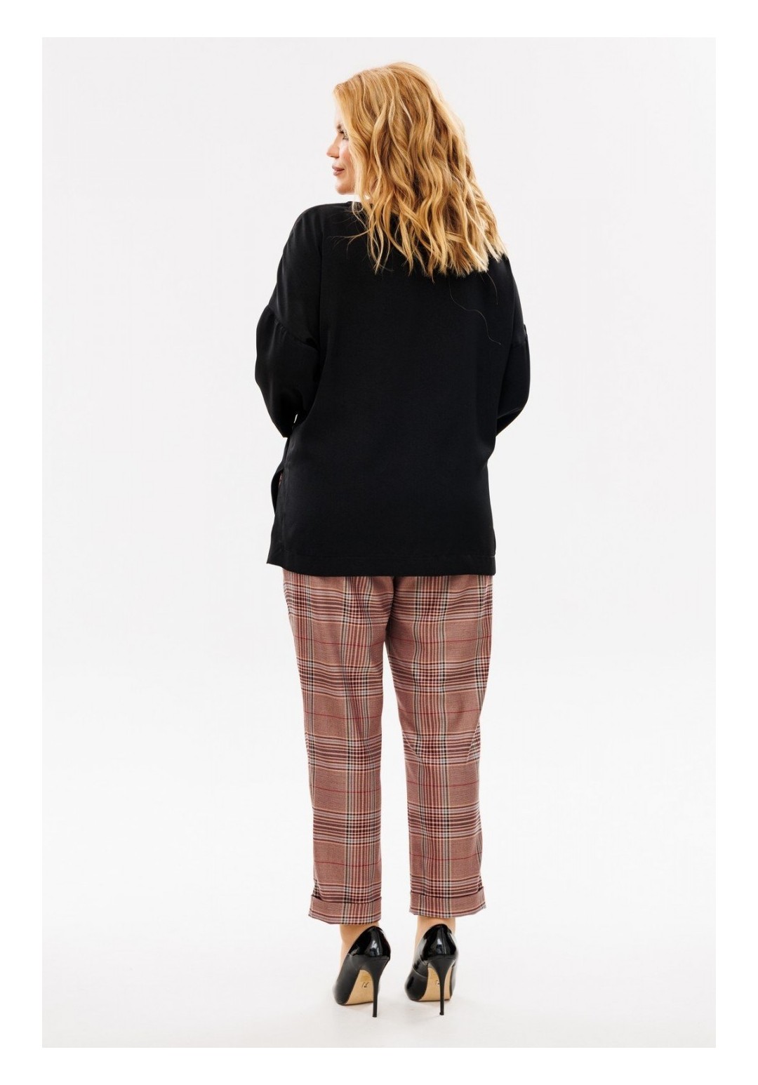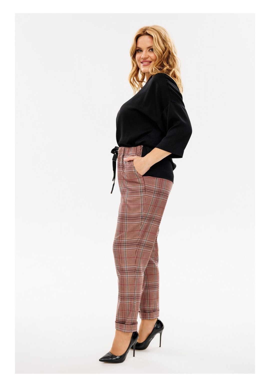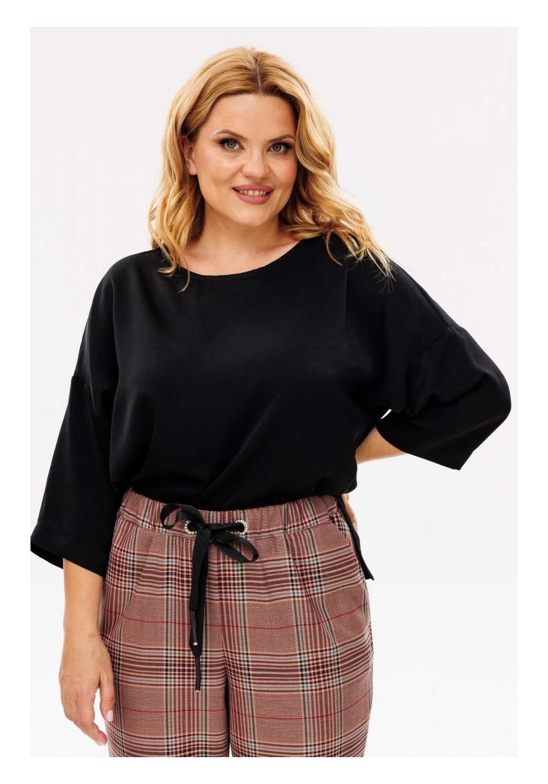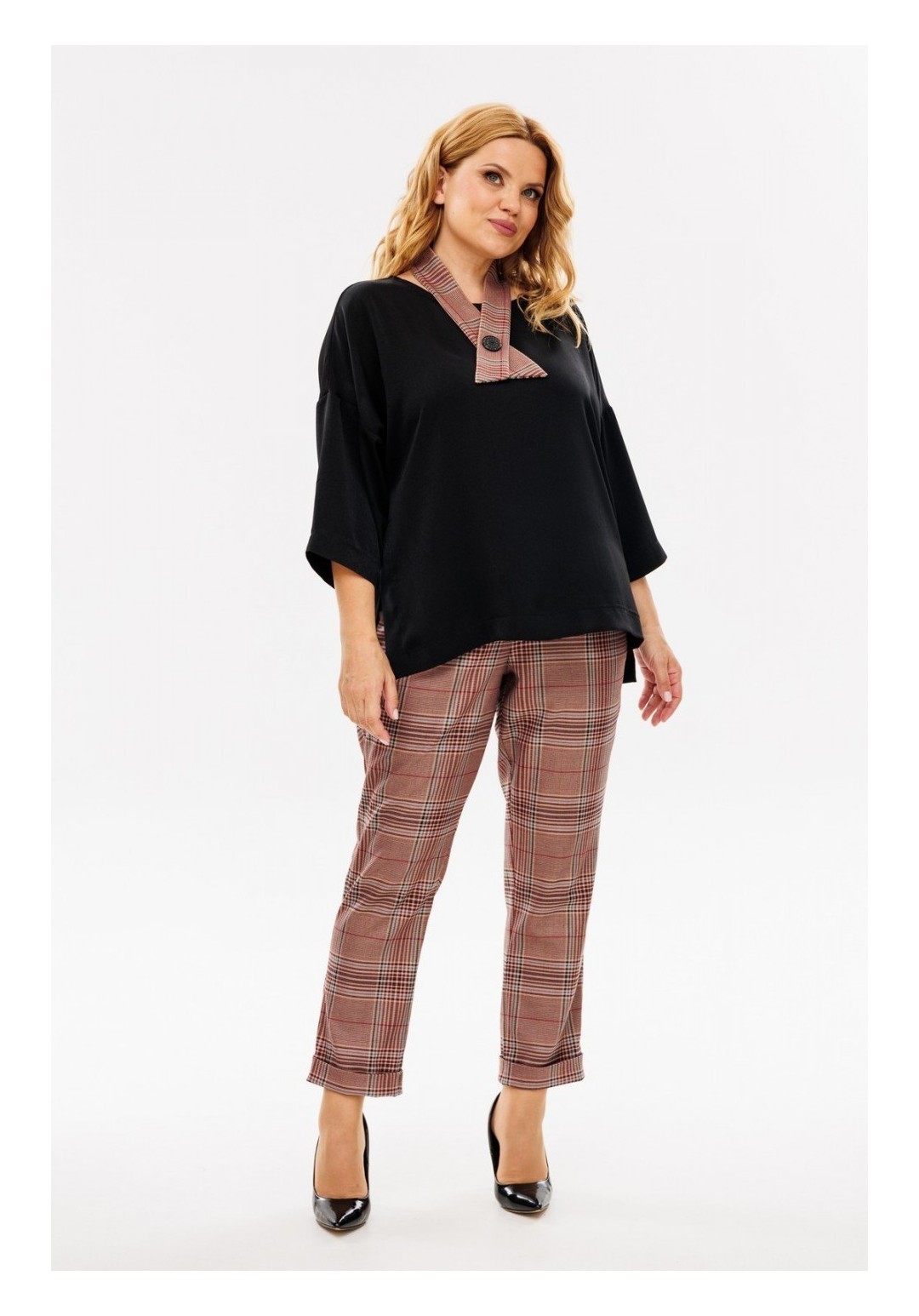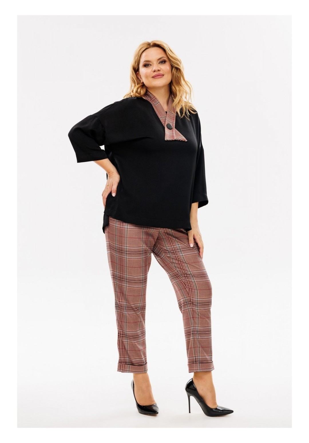 Удобный и универсальный женский брючный комплект. Данный комплект отличный вариант для повседневной носки. Изделие состоит из блузы и брюк. Блуза свободного кроя выполнена из шелковистой блузочной ткани. Перед и спинка цельные, вырез горловины круглый на окантовке, спинка удлиненная. Плечи спущены, рукав втачной 3/4 одношовный с широкой подгибкой по низу. Низ блузы также с широкой подгибкой и отделочной строчкой, имеются размеры по бокам, благодаря которым блузу с легкостью можно носить как навыпуск, так и заправленной. Для создания интересного образа к комплекту прилагается съемный галстук, застегивающийся на петлю-пуговицу. Брюки свободного кроя, длина 7/8, пояс притачной на резинке и шнуровкой люверсами, в боковых швах карманы. Брюки слегка заужены к низу с цельнокроеной манжетой. С данным комплектом можно смело создавать стильные образы как вместе, так и по отдельности. Длина блузы по спинке 67 см, длина рукава 53 см. Длина брюк по боковому шву 99 см, по шаговому — 69 см. Изделие подойдет на рост 170 см.