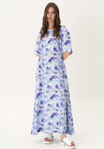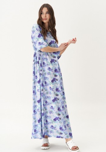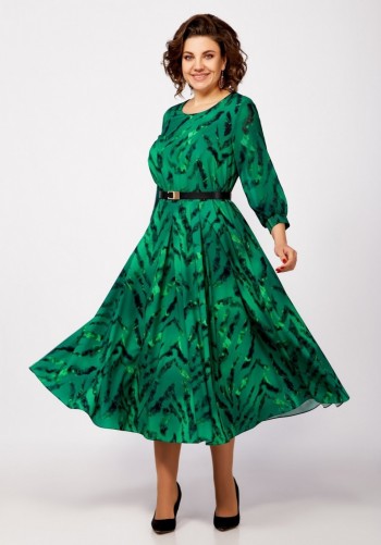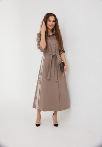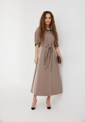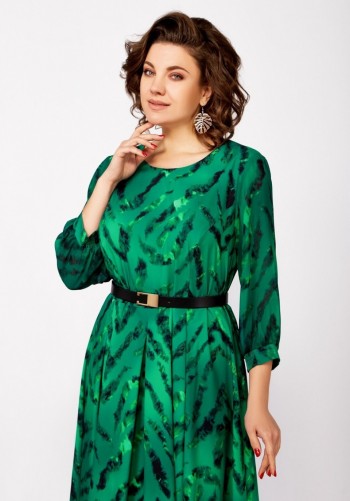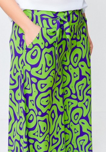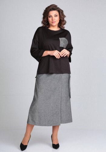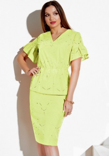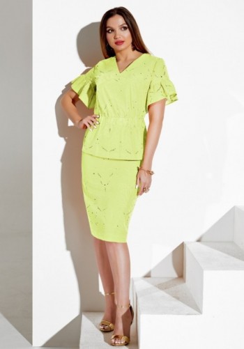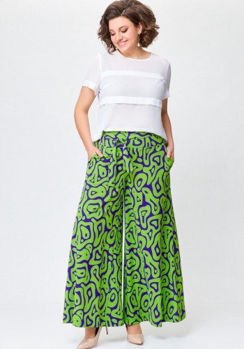 Костюм женский, состоящий из блузы и брюк. Блуза прямого силуэта, с разрезами по бокам. Рукав цельнокроеный, заканчивается притачной манжетой. Горловина V-образная с притачной планкой по линии переда, спинки и рукава. Головина на завязке. Дополнением служит пояс. Брюки по силуэту с легким клешем от колена, по передним половинкам по центру застрочен защип. Карманы боковые накладные. Брюки с застежкой на молнию. Притачной пояс застегивается на петлю-пуговицу и с резинками по бокам. Модель без подкладки.