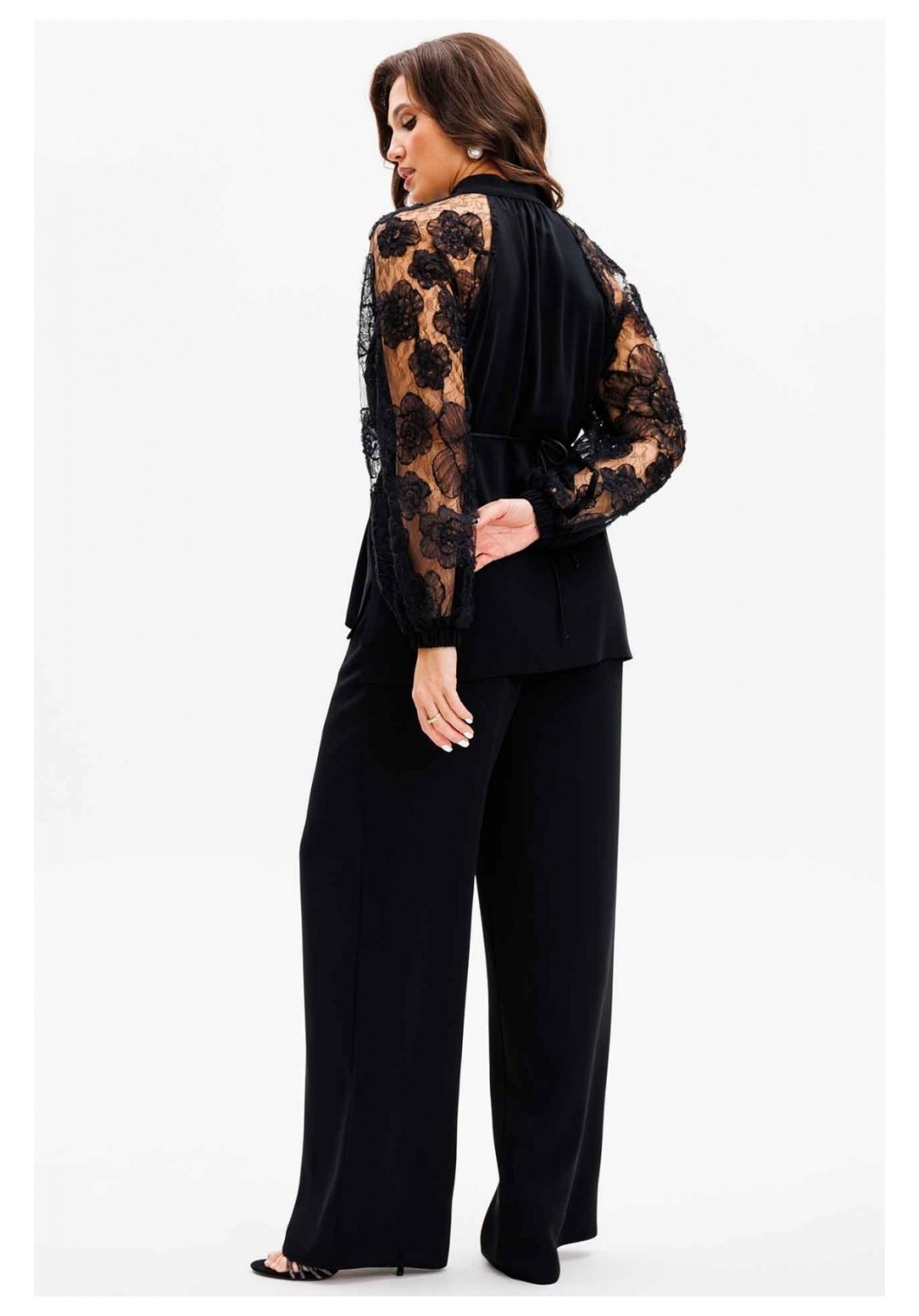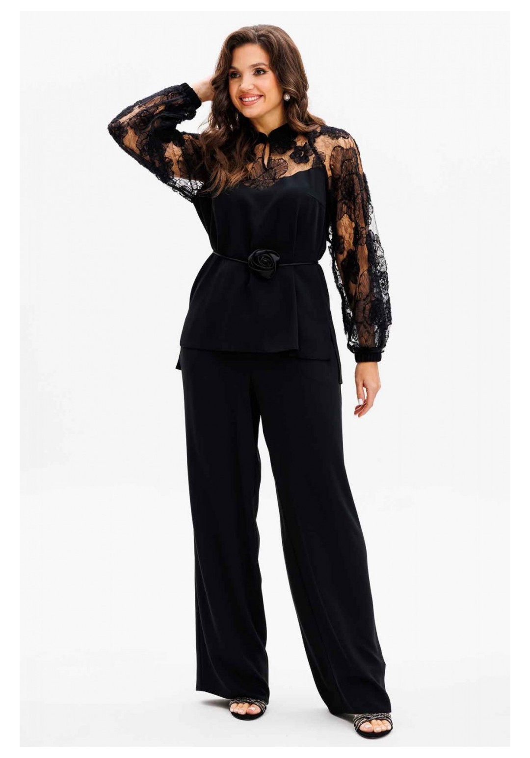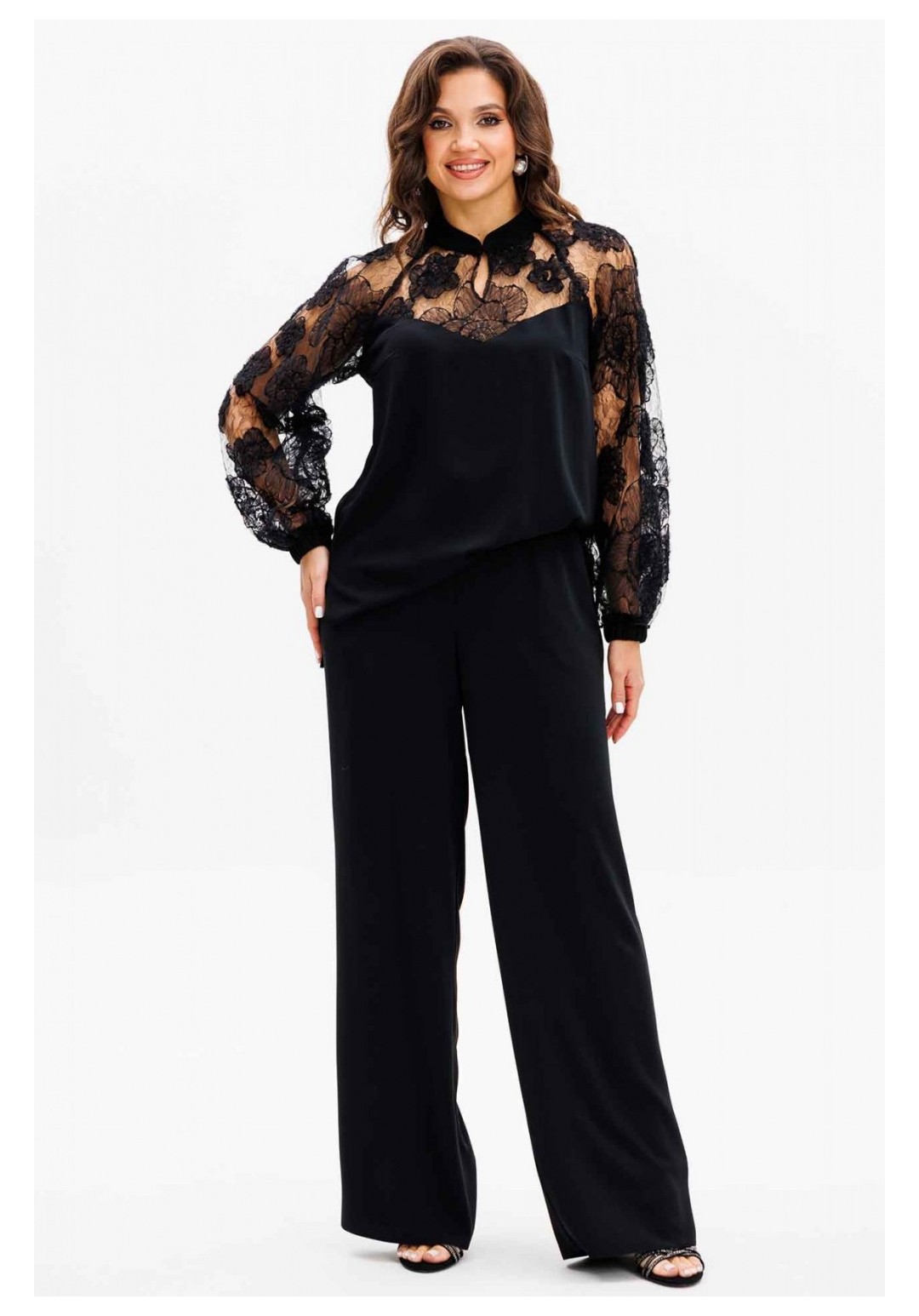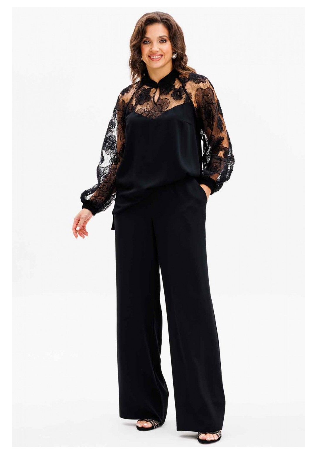 Костюм женский свободного силуэта состоит из блузы и брюк. Блуза, комбинированная из двух различных по фактуре тканей. По горловине застежка на крючек. Боковые швы заканчиваются небольшими разрезами. Воротник стойка. Рукава реглан, низ на резинке. Брюки палаццо, на притачном поясе с резинкой и тесьмой. У брюк - боковые карманы.