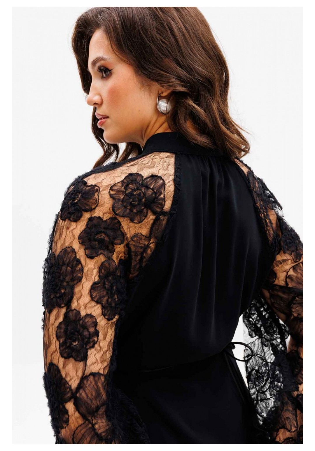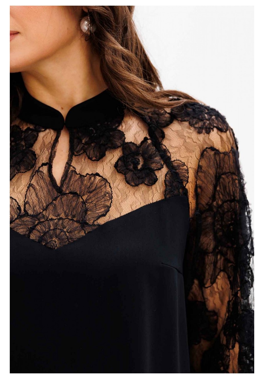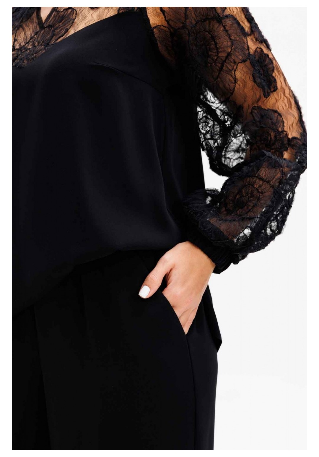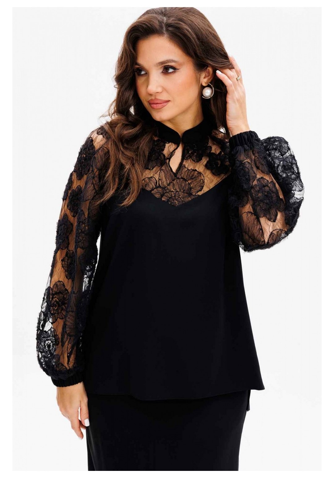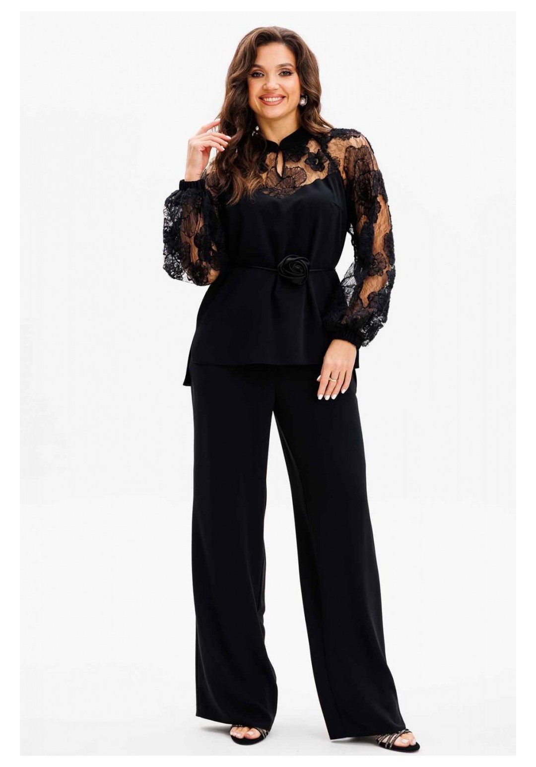 Костюм женский свободного силуэта состоит из блузы и брюк. Блуза, комбинированная из двух различных по фактуре тканей. По горловине застежка на крючек. Боковые швы заканчиваются небольшими разрезами. Воротник стойка. Рукава реглан, низ на резинке. Брюки палаццо, на притачном поясе с резинкой и тесьмой. У брюк - боковые карманы.