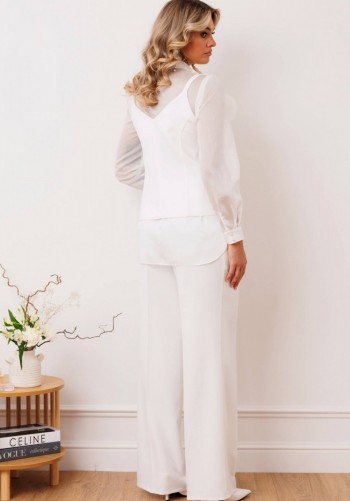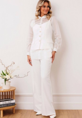 Костюм из серии нескучный офис — это стильное решение для современных профессионалов, которые ценят комфорт и элегантность. Жилет женский из костюмной ткани свободного силуэта с центральной бортовой застёжкой на 3 пуговицы. Вырез горловины v- образной формы. По переду обработаны карманы в рамку с клапаном и вытачки. В шве отрезного бочка и спинки - шлицы. Спинка прямая, со средним швом. С левой стороны спинки настрочены две шлёвки, через которые протягивается пояс. С помощью петли и пары пуговиц на поясе можно регулировать приталенность жилета. Жилет на подкладке. Брюки прямые, с высокой посадкой, с заутюженными стрелками. Верхний срез брюк с притачным поясом. Брюки с застежкой на тесьму-молнию в среднем шве передних частей и застежкой на петлю-пуговицу по выступающим концам пояса. Передние части брюк с мягкими складками от верхнего среза, боковыми карманами, наклоненными к боковому шву. длина спинки жилета: 71 см длина брюк: 108 см