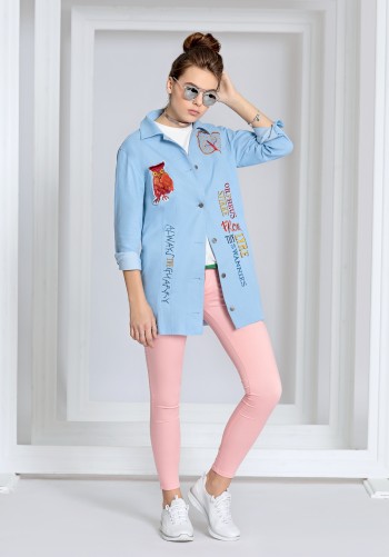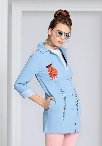 Комплект тройка состоящий из блузона, топа и брюк. Блузон прямого силуэта. По борту, горловине спинки и низу рукавов довяз. По переду расположены нагрудные вытачки выходящие из бокового шва. Рукав втачной одношовный. Топ прямого силуэта, на брителях. Вырез горловины V-образной формы по переду и спинке, в боковых швах разрезы. Брюки прямые, на подкладке, сверху на притачном поясе с резинкой. Длина брюк: 112 см, длина рукава+довяз 54 см.