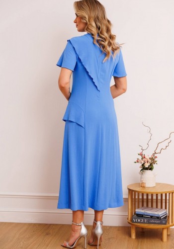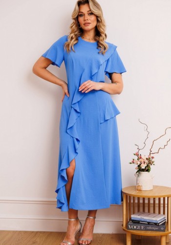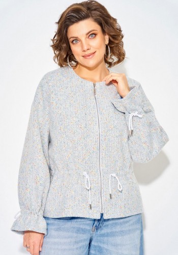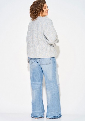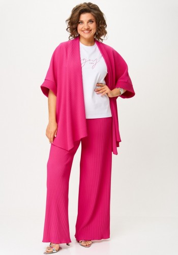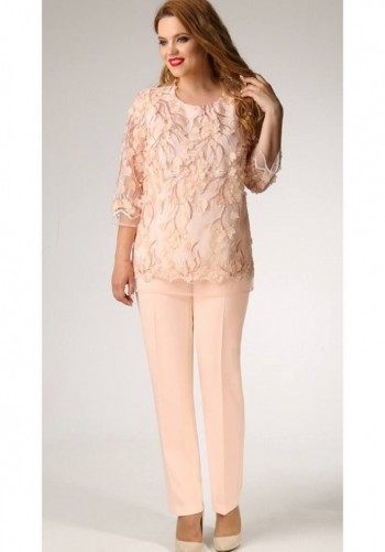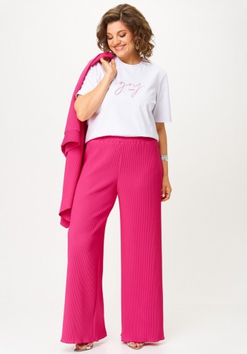 Стильный женский комплект состоит из блузы и брюк. Блуза свободного силуэта, выполненная из легкой струящейся ткани (не тянется) с модным принтом. По переду центральная застежка на петли-пуговицы. По спинке отрезная кокетка, от которой заложена складка для свободы движения. В нижней части спинки горизонтальный подрез с разрезом по середине. Низ блузы фигурной формы. Горловина оформлена рубашечным воротником со стойкой. Рукав втачной, одношовный, длиной ¾. Брюки свободного прямого кроя с высокой посадкой, в боковых швах наклонные карманы. Верхний срез оформлен поясом с эластичной резинкой.