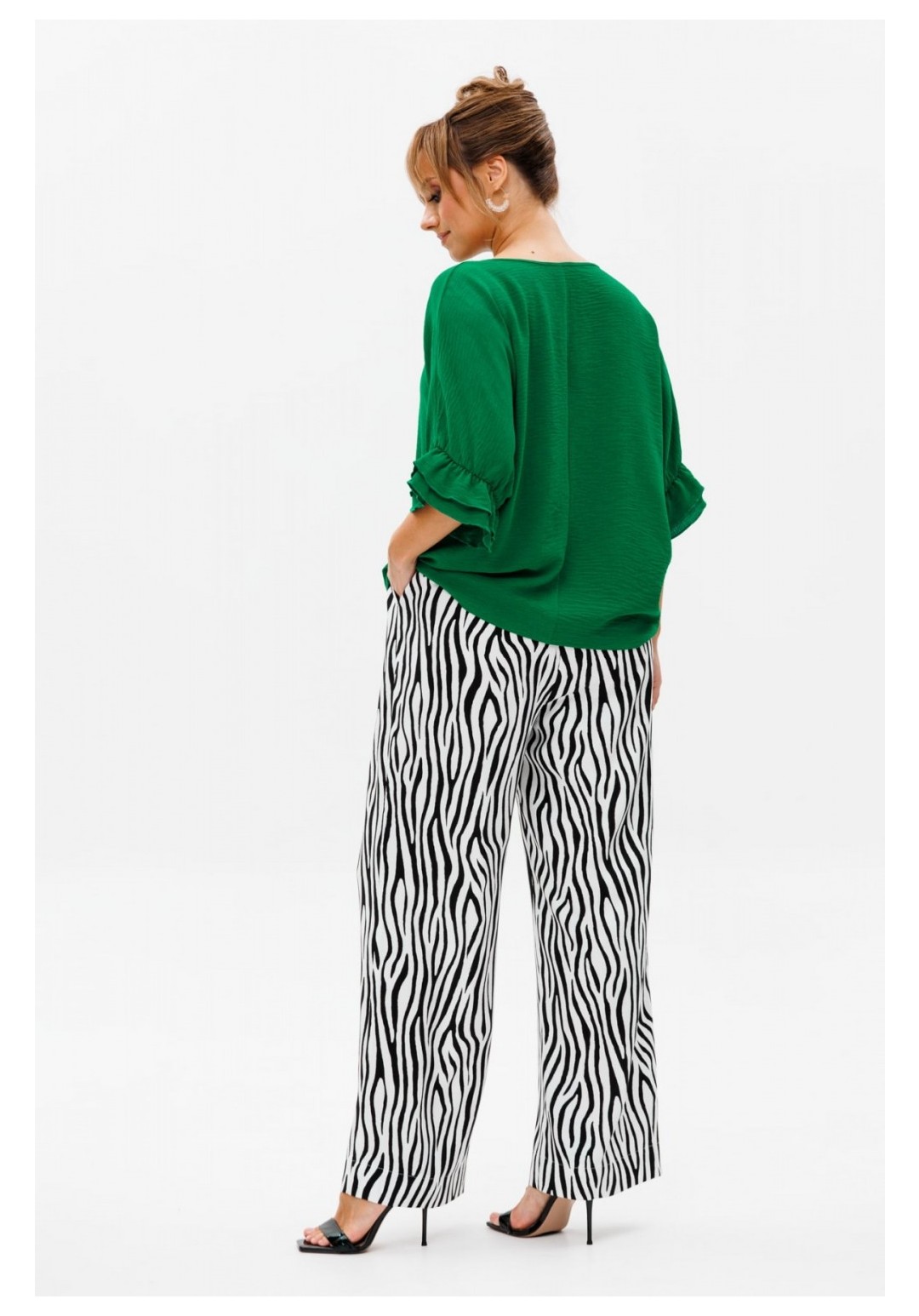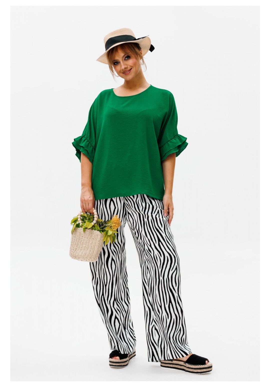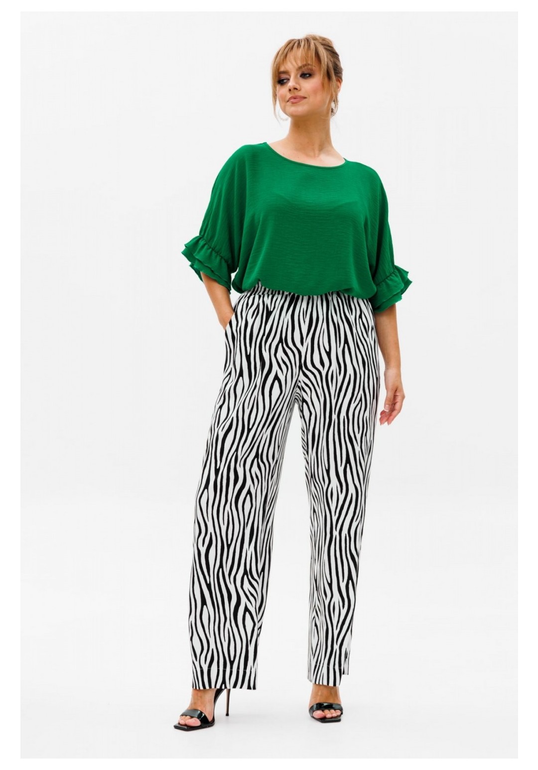 Стильный женский костюм, состоящий из блузы и брюк. Блуза прямого свободного силуэта со спущенной линией плеча, выполненная из блузочной ткани (тянется). Горловина округлой формы, обработана окантовкой. Спинка со средним швом. Низ рукава оформлен двумя волонами, присборенными на резинку. Длина блузы по среднему шву спинки – р48,50,52 – 63, р54,56,58 – 65 Длина рукава от горловины – р48,50,52 – 37, р54,56,58 – 38 Ширина рукава внизу с раст резинкой (макс) ½ - р48-26, р50-27, р52-28, р54-29, р56-30, р58-31 ОГ ½ - р48-64, р50-66, р52-68, р54-70, р56-72, р58-74 ОТ ½ - р48-61, р50-63, р52-65, р54-67, р56-69, р58-71 ОБ ½ - р48-62, р50-64, р52-66, р54-68, р56-70, р58-72 Брюки свободного прямого кроя с высокой посадкой, выполненные из легкой костюмной ткани (не тянется).В боковых швах наклонные карманы. Верхний срез оформлен поясом с эластичной резинкой. Длина брюк по боковому шву – р48,50,52 – 109, р54,56,58 – 111 Длина брюк по внутреннему шву во всех р-ах - 79 Ширина брюк внизу ½ - р48-28, р50-29, р52-30, р54-31, р56-32, р58-33 Высота посадки брюк спереди – р48,50,52 – 32, р54,56,58 – 34 Высота посадки брюк сзади – р48,50,52 – 46,5, р54,56,58 – 48,5 Обхват бедра ½ - р48-37, р50-38, р52-39, р54-40, р56-41, р58-42 ОТ с раст резинкой ½ - р48-55, р50-57, р52-59, р54-61, р56-63, р58-65 ОБ ½ - р48-56, р50-58, р52-60, р54-62, р56-64, р58-66