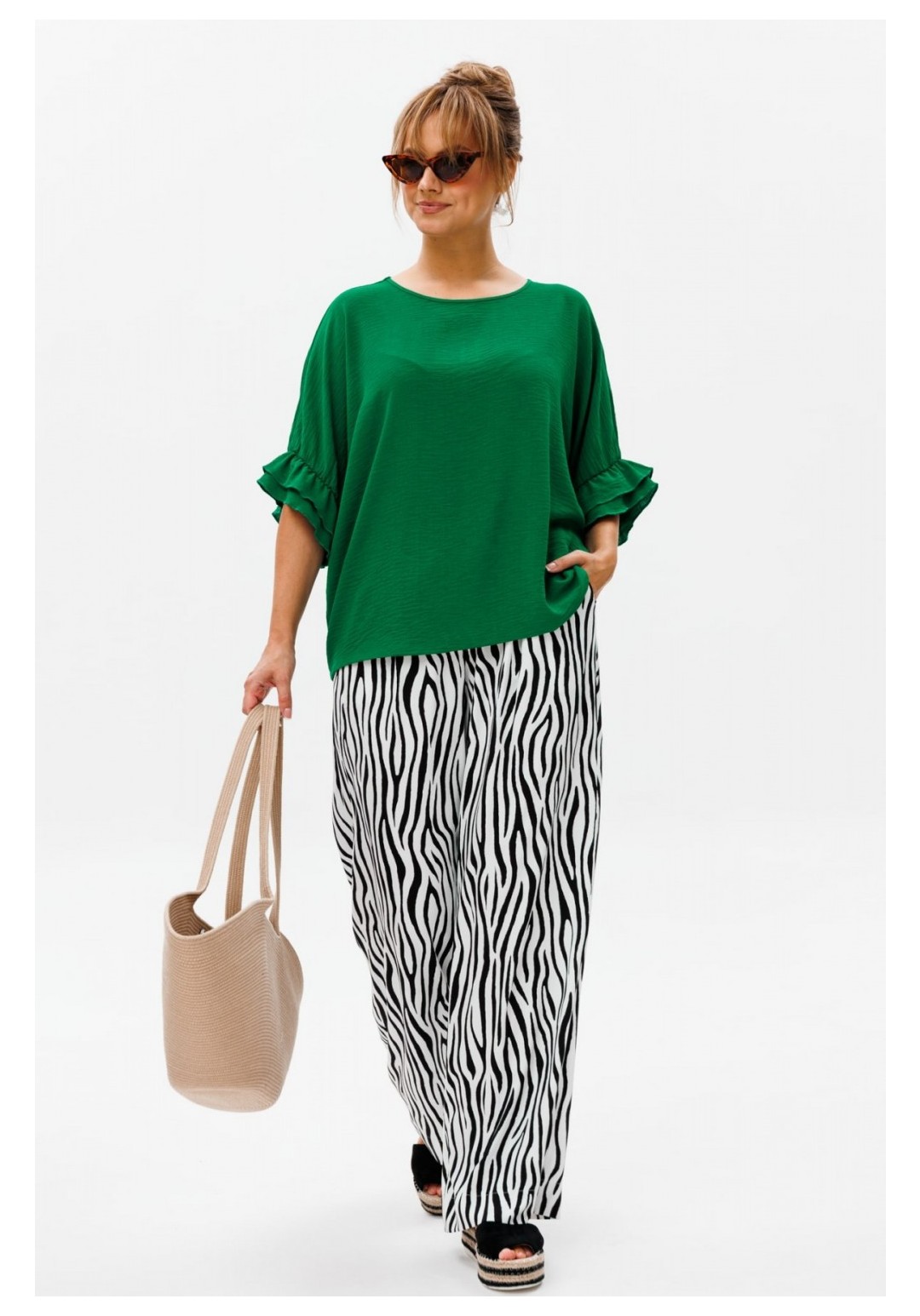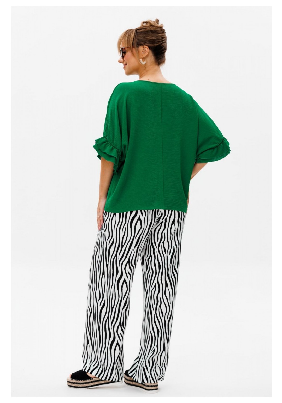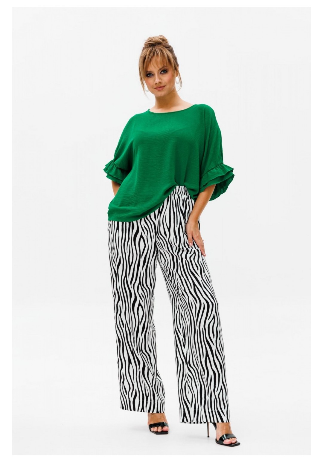 Стильный женский костюм, состоящий из блузы и брюк. Блуза прямого свободного силуэта со спущенной линией плеча, выполненная из блузочной ткани (тянется). Горловина округлой формы, обработана окантовкой. Спинка со средним швом. Низ рукава оформлен двумя волонами, присборенными на резинку. Длина блузы по среднему шву спинки – р48,50,52 – 63, р54,56,58 – 65 Длина рукава от горловины – р48,50,52 – 37, р54,56,58 – 38 Ширина рукава внизу с раст резинкой (макс) ½ - р48-26, р50-27, р52-28, р54-29, р56-30, р58-31 ОГ ½ - р48-64, р50-66, р52-68, р54-70, р56-72, р58-74 ОТ ½ - р48-61, р50-63, р52-65, р54-67, р56-69, р58-71 ОБ ½ - р48-62, р50-64, р52-66, р54-68, р56-70, р58-72 Брюки свободного прямого кроя с высокой посадкой, выполненные из легкой костюмной ткани (не тянется).В боковых швах наклонные карманы. Верхний срез оформлен поясом с эластичной резинкой. Длина брюк по боковому шву – р48,50,52 – 109, р54,56,58 – 111 Длина брюк по внутреннему шву во всех р-ах - 79 Ширина брюк внизу ½ - р48-28, р50-29, р52-30, р54-31, р56-32, р58-33 Высота посадки брюк спереди – р48,50,52 – 32, р54,56,58 – 34 Высота посадки брюк сзади – р48,50,52 – 46,5, р54,56,58 – 48,5 Обхват бедра ½ - р48-37, р50-38, р52-39, р54-40, р56-41, р58-42 ОТ с раст резинкой ½ - р48-55, р50-57, р52-59, р54-61, р56-63, р58-65 ОБ ½ - р48-56, р50-58, р52-60, р54-62, р56-64, р58-66