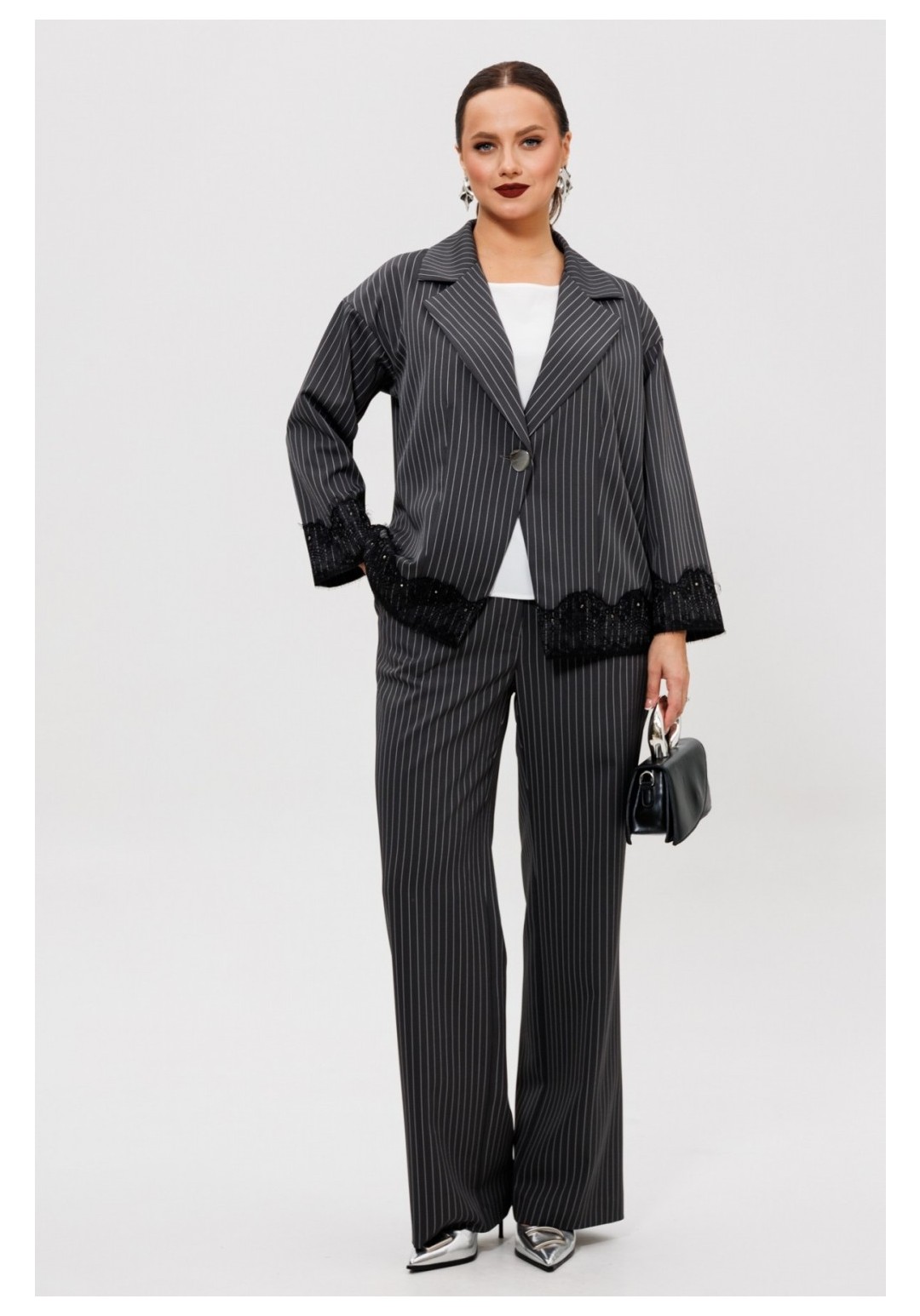 Нарядный женский комплект, состоящий из жакета, брюк и блузы. Жакет прямого силуэта со спущенной линией плеча, выполнен из костюмной ткани в тонкую полоску (чуть тянется). По переду нагрудная вытачка, центральная застежка на одну петлю и пуговицу. Горловина оформлена воротником пиджачного типа с лацканом. Спинка со средним швом. Рукава одношовные, длиной 7/8. Жакет без подкладки. Жакет декорирован по низу и по низу рукавов французским кружевом со стразами. Блуза полуприлегающего силуэта со спущенной линией плеча, выполненная из блузочной ткани (тянется). Горловина округлой формы. В боковых швах небольшие разрезы. Брюки прямого кроя с высокой посадкой, выполненные из костюмной ткани в тонкую полоску (чуть тянется) с наклонными карманами в боковых швах. По срезу банта застежка-молния. Верхний срез оформлен поясом с эластичной резинкой по задней половинке.