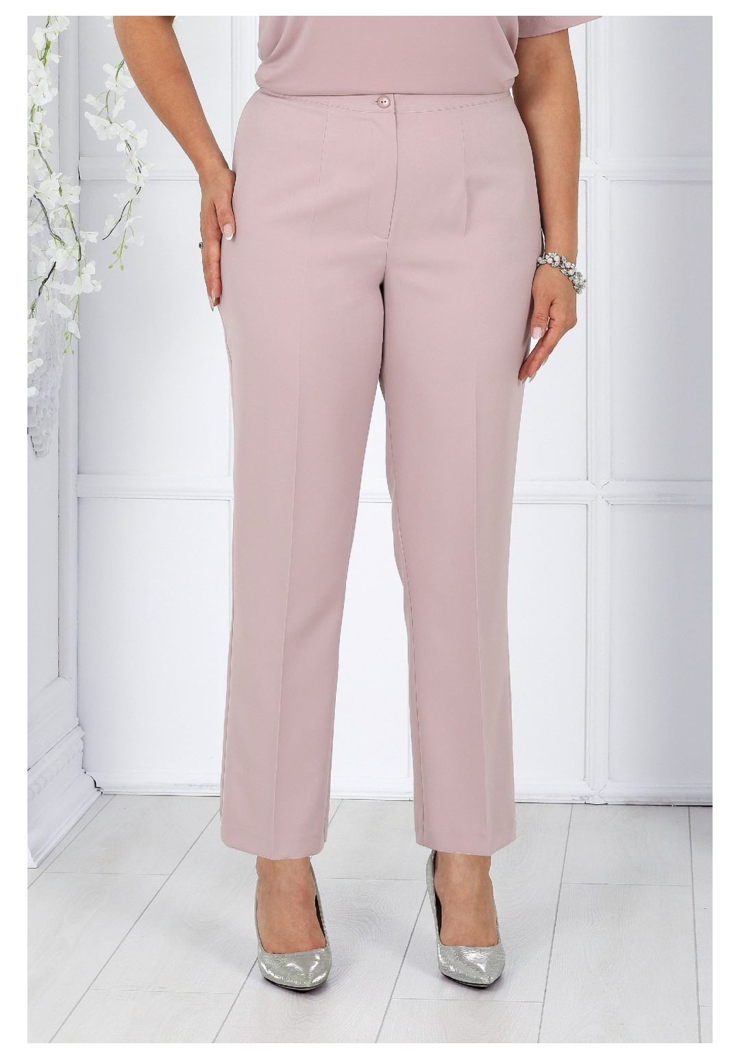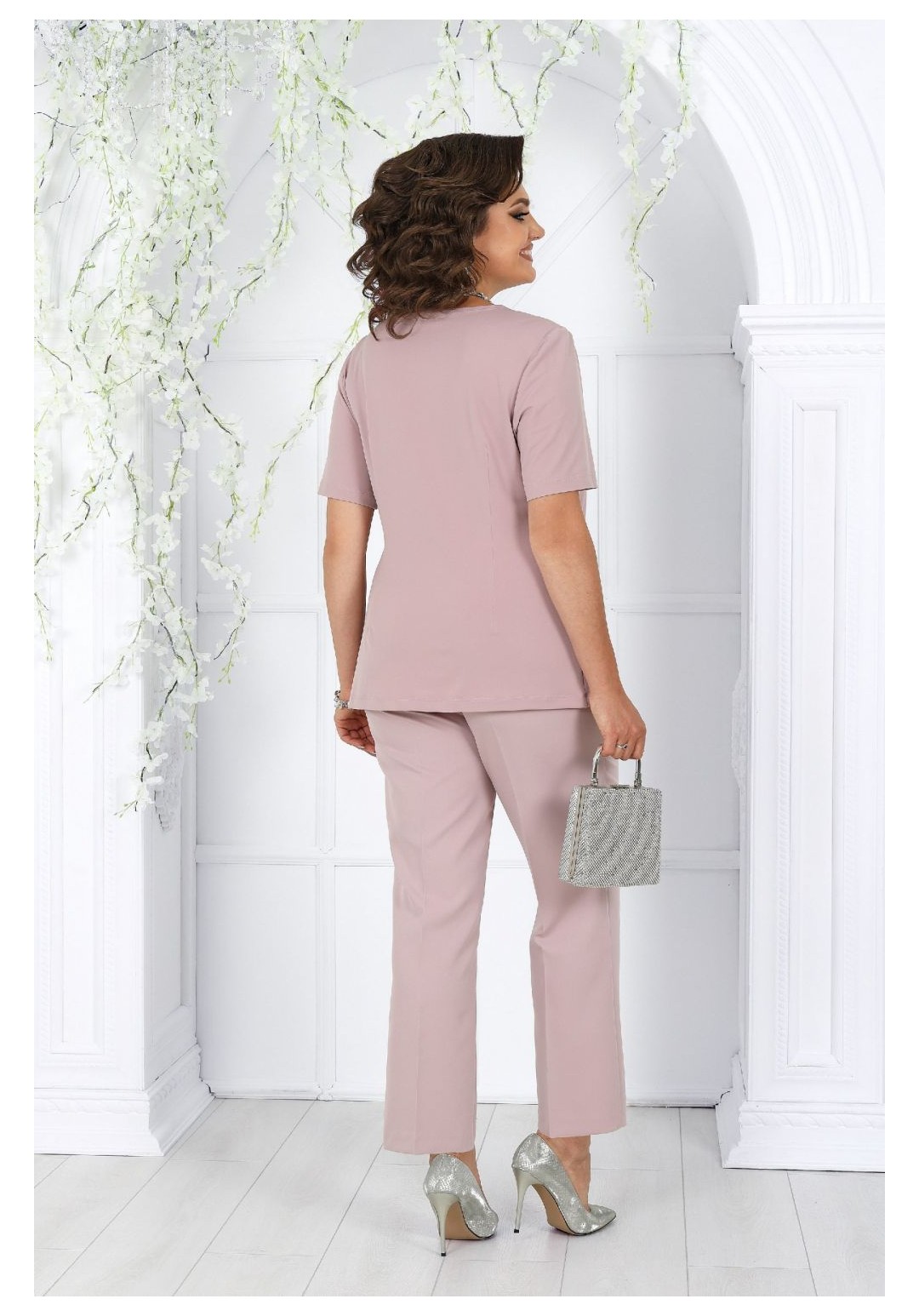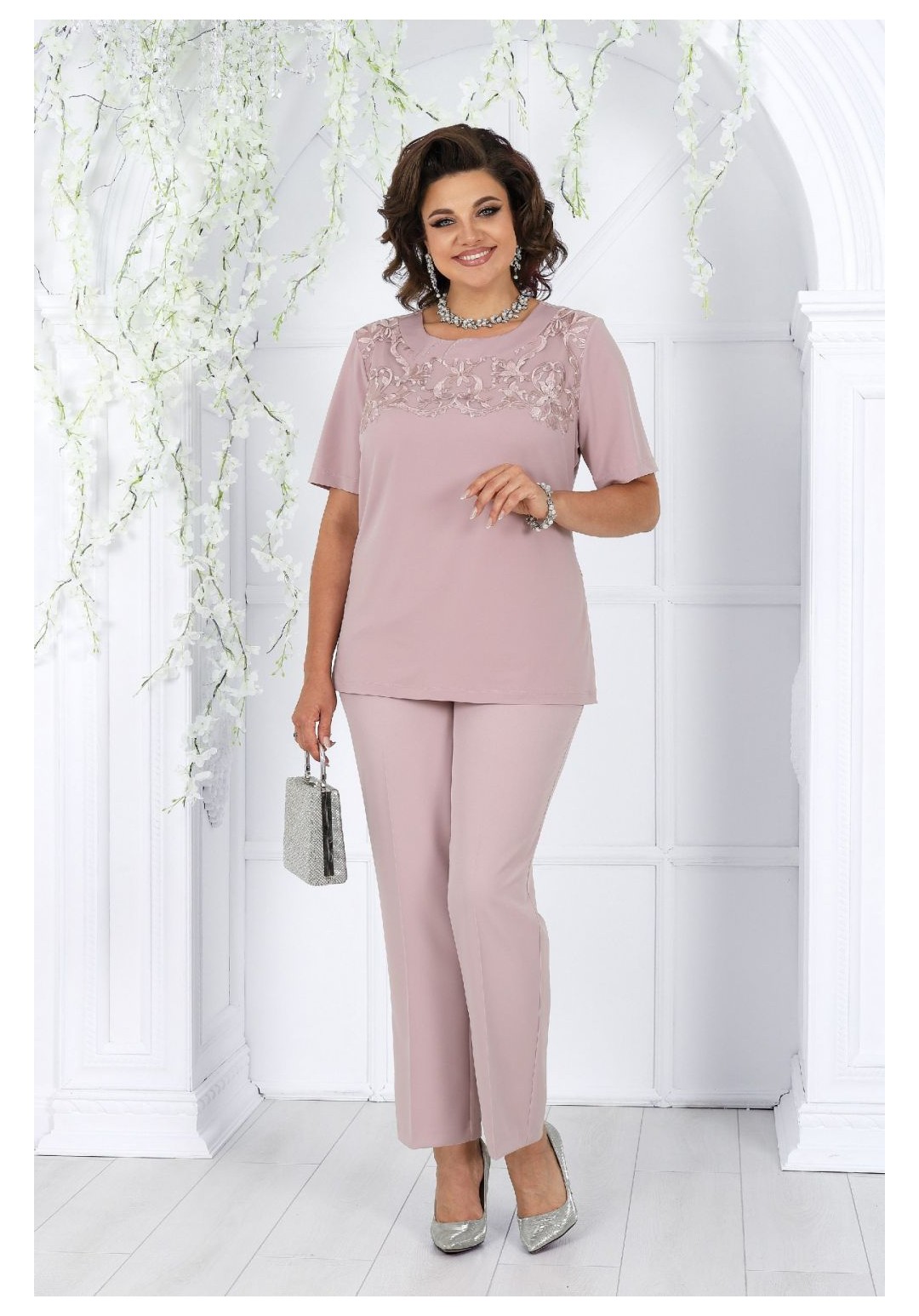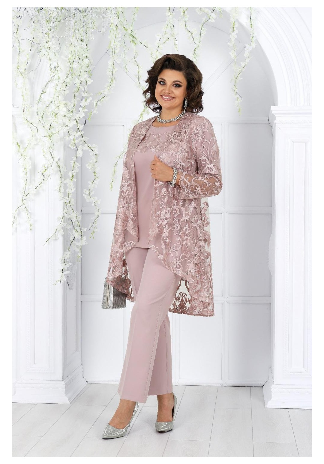 Комплект женский,3-х предметный, состоящий из кардигана, брюк и блузы. Кардиган выполнен из кружева, брюки из костюмно-плательной ткани, блуза комбинированая из шифона и кружева. Кардиган свободного силуэта, длиной по центру спинки 108 см. Перед относительно спинки с декоративным перепадом длины, т.е. короче спинки. По линии горловины и бортам отложной воротник-шаль. Рукава втачные, одношовные, длиной 59 см. Брюки классические, длиной по боковому шву: р. 52, 54 - 98,5 см., р. 56, 58, 60 - 99,5 см., р.62, 64, 66 - 101,0 см. По передним и задним половинкам обработаны талиевые вытачки и заутюжены стрелки-канты. Застёжка – молния по передним половинкам брюк. Верхняя часть изделия на поясе, который застёгивается на петлю и пуговицу. Для лучшего прилегания брюк в области талии в поясе по боковым сторонам вставлена резинка. Блуза длиной по центру спинки 73,5 см. Перед с нагрудными вытачками и с кокеткой, которая заканчивается фестонами. Нижняя часть двойная. Спинка с талиевыми вытачками. Вырез горловины овальный, по переду с подрезной планкой,декорированной стразами. Рукава втачные, одношовные, длиной 27 см. В левом боковом шве потайная застёжка-молния.