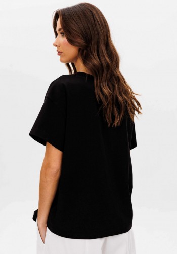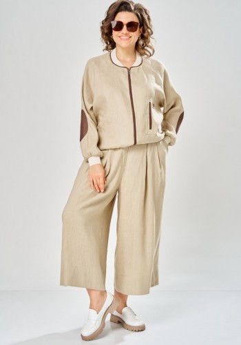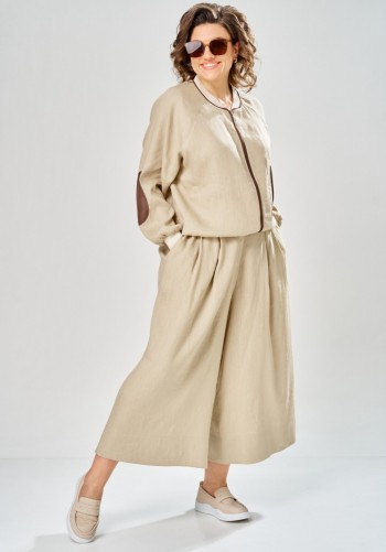 Комплект брючный 3-х предметный, состоящий из блузки, джемпера и брюк. Блузка прямого силуэта, выполнена из ткани лен-вишер. Модель со спущенной линией плеча, без плечевых накладок, с однобортной внешней застежкой с отрезными планками на 8 петель и 8 пуговиц. В верхней части переда настрочены накладные карманы с фигурным клапаном, входящим в шов притачивания кокетки и застегивающимся на петлю и пуговицу. Низ кокетки оформлен прямой бейкой. В верхней части спинки – притачная кокетка. Горловина округлой формы со стояче-отложным воротником на отрезной стойке. Рукав длиной 3/4, со сборкой вдоль притачной манжеты, застегивающейся на 1 петлю и 1 пуговицу. В нижней части боковых швов обработаны разрезы, а на уровне линии талии настрочены шлевки, для фиксации съемного пояса. Отделочные строчки по блузке - контрастного цвета. Длина блузки – 86 см (50-58 р-р); длина рукава (от горловины, с учетом манжеты) – 57 см (50-52 р-р), 58,5 см (54-58 р-р). Джемпер полуприлегающего силуэта, выполнен из хлопкового трикотажного полотна. Горловина округлой формы, углубленная спереди. Срезы горловины и пройм окантованы косой бейкой. Длина джемпера -- 61 см (50-58 р-р). Брюки классические длинные, прямого силуэта, с посадкой на талии, выполнены из ткани лен-вишер. Модель со стрелками, с центральной застёжкой на тесьму-молнию, на притачном поясе, застегивающемся на петлю и пуговицу. Передние и задние половинки брюк с талиевыми вытачками, направленными от пояса вниз. Спереди обработаны боковые наклонные карманы. Для лучшего прилегания брюк в области талии в поясе по задним половинкам вставлена эластичная лента. Длина брюк по боковому (с поясом) - 107 см (50-52 р-р), 108 см (54-58 р-р).