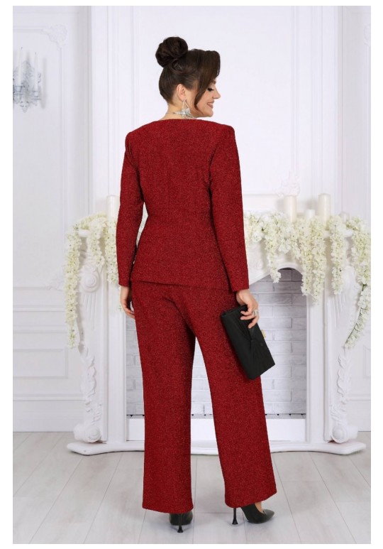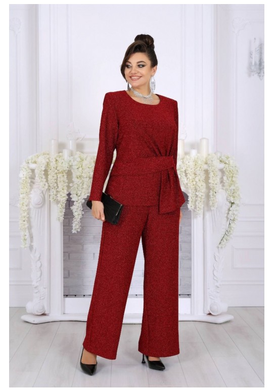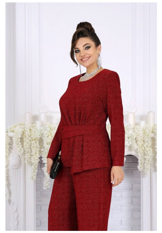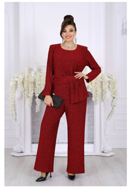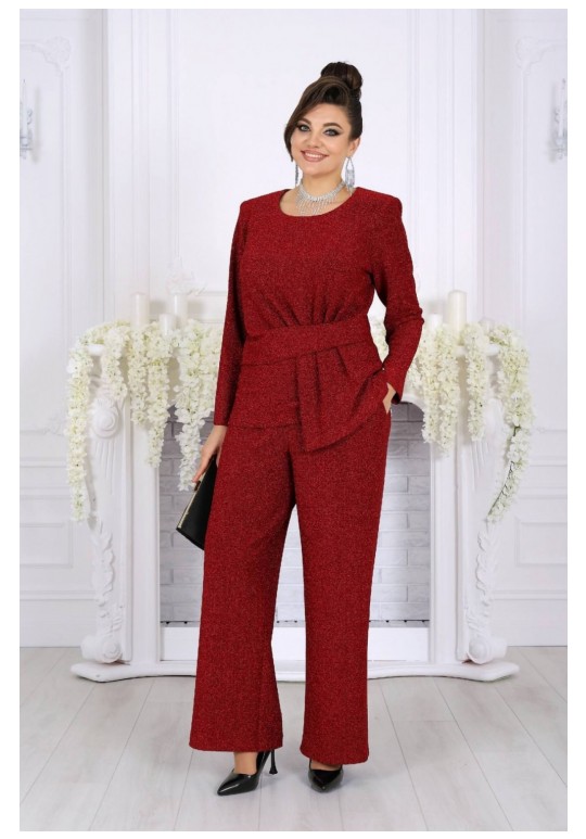 Это не просто наряд — это ваша уверенность, статус и блеск, который будет сопровождать каждый ваш шаг. В этом костюме каждая деталь продумана так, чтобы создавать ощущение безупречного стиля и лёгкой роскоши. Мягкое мерцание люрекса делает образ выразительным и дорогим, а утончённый крой подчёркивает женственность и гармонию силуэта. Блузка с асимметричной деталью по линии талии — это модный акцент, который визуально формирует стройный силуэт и придаёт образу дизайнерскую изысканность. Нежная линия декольте в обрамлении округлой горловины элегантно подчёркивает женственность. Брюки прямого силуэта с комфортной посадкой — символ утончённой простоты и свободы. Эластичный пояс обеспечивает удобство, а мерцающая фактура ткани делает их достойным элементом вечернего гардероба. Такой костюм создан для особых случаев: новогодних вечеров, корпоратива, праздничного ужина или выхода в свет, но при этом он настолько универсален, что легко впишется и в деловой стиль. Комплект брючный 2-х предметный, состоящий из блузки и брюк. Блузка полуприлегающего силуэта, выполнена из трикотажного полотна с фактурной лицевой стороной люрекс. Модель без подкладки, с плечевыми накладками. Спинка с талиевыми вытачками и средним швом. По линии талии в левой части переда – горизонтальный подрез с односторонними складками и отлетной деталью в шве. По линии талии в правой части переда обработан цельнокроеный пояс, край которого крепится в левом боковом шве. Горловина округлая, углубленная спереди. Рукав длинный, втачной. Длина блузки – 62 см. Длина рукава – 57 см. Брюки длинные, с посадкой на талии, выполнены из трикотажного полотна с фактурной лицевой стороной люрекс. Модель без стрелок, без застежки. Спереди обработаны наклонные боковые карманы. Для лучшего прилегания по линии талии в притачном поясе предусмотрена эластичная лента, вставленная по всей длине. Длина брюк по боковому (с поясом) – 106 см (50-52 р-р), 107 см (54-58 р-р).