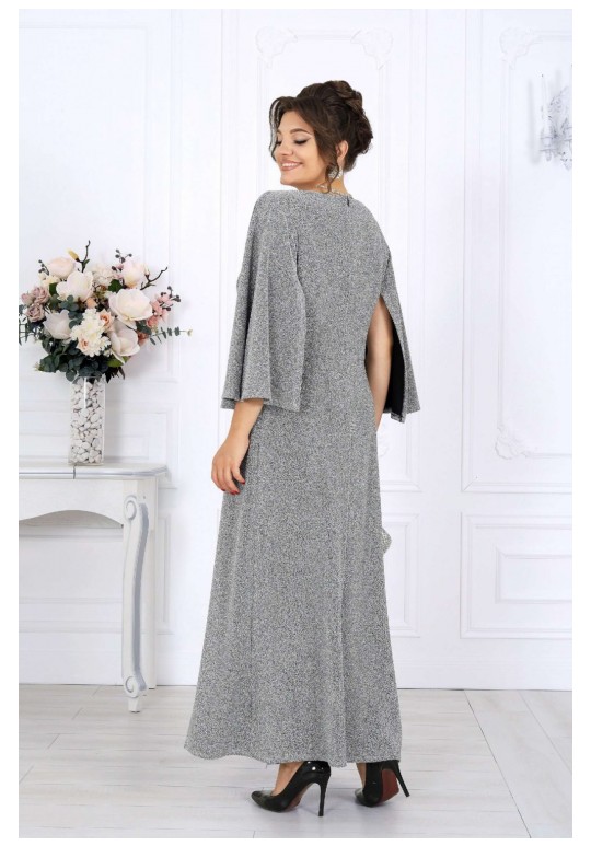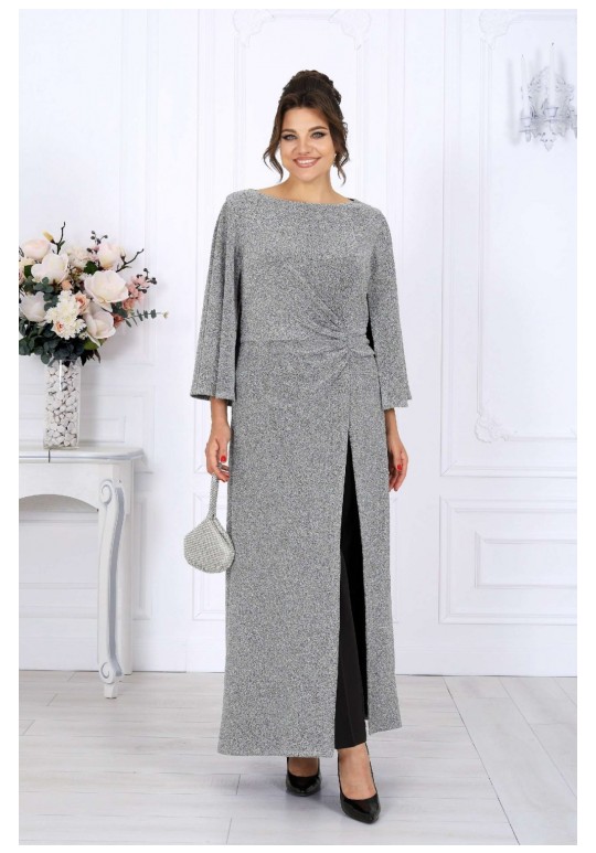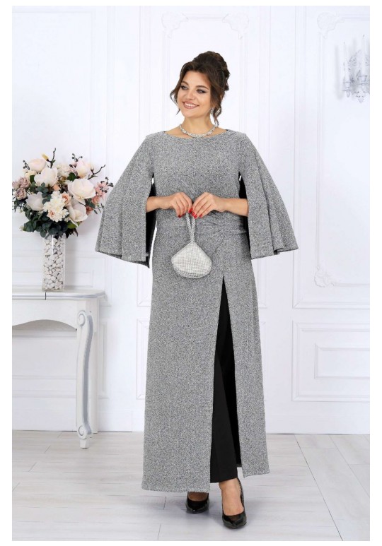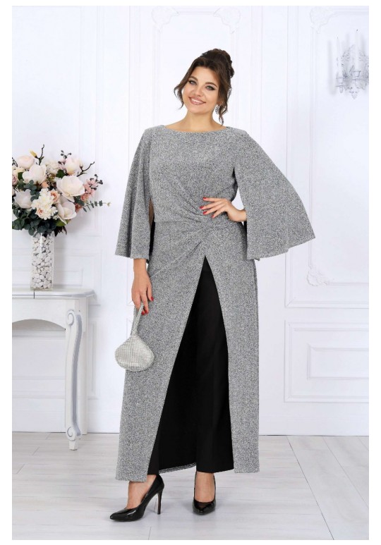 Этот элегантный костюм-двойка создан для женщин, которые ценят комфорт и изысканность в равной мере. Он словно приглашает сиять — мягкий блеск люрекса переливается в свете вечерних огней, создавая атмосферу праздника даже в обычный день. Туника свободно струится по фигуре, легко скрывая всё лишнее и подчеркивая достоинства. Драпировка по линии талии формирует красивый силуэт песочных часов, а асимметричный запах добавляет образу динамики и утончённости. Эффектные рукава придают наряду торжественность, сохраняя при этом абсолютную лёгкость движений. Каждая деталь продумана до мелочей — от мягкой подкладки, обеспечивающей комфорт, до аккуратной потайной застёжки, сохраняющей чистоту линий. Этот наряд универсален: он уместен на праздничном приёме, корпоративе или ужине в ресторане, а также станет идеальным выбором для торжественных семейных событий. В нём комфортно, уверенно и красиво — именно так выглядит настоящая женственность в современном прочтении. Комплект брючный 2-х предметный, состоящий из туники и брюк. Туника полуприлегающего силуэта с расширением к низу, выполнена из трикотажного полотна с фактурной лицевой стороной люрекс. Модель отрезная по линии талии; верхняя часть переда и спинки (лиф) на трикотажной подкладке. Лиф переда с одним рельефным швом, направленным от левой проймы; нижняя часть переда состоит из двух деталей, скрепленных на запах. По линии талии, вдоль рельефа, перед задрапирован сборкой и односторонними складками. На спинке обработаны талиевые вытачки и средний шов с застежкой на потайную тесьму-молнию (50 см). Вырез горловины спинки и переда формы лодочка. Рукав без шва, с отлетными краями; крепится к пройме только в верхней части. Длина туники – 139 см; длина рукава – 51 см. Брюки классические, длинные, с посадкой на талии, выполнены из костюмно- плательной ткани. Модель со стрелками. Передние и задние половинки брюк с талиевыми вытачками, направленными от пояса вниз. Спереди обработаны наклонные боковые карманы и центральная застёжка на тесьму-молнию. Притачной пояс застегивается на 1 петлю и 1 пуговицу; для лучшего прилегания по линии талии в притачном поясе предусмотрена эластичная лента, вставленная по спинке. Длина брюк (с поясом) – 102 см (50-52р-р); длина брюк (с поясом) – 103 см (54-58р-р).
