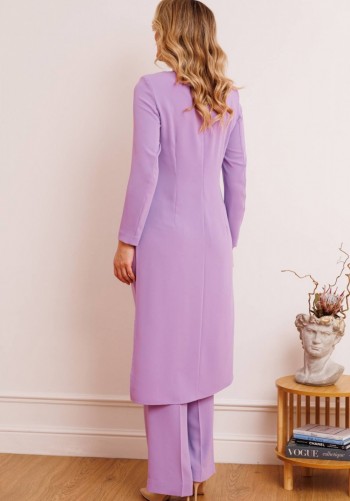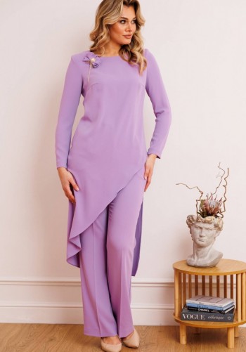 Нарядный брючный костюм — когда комфорт встречается с эффектом Этот костюм словно создан для моментов, когда хочется выглядеть особенно — уверенно, элегантно и чуть сияюще. Лаконичный силуэт, мягкий блеск люрекса и продуманная посадка делают образ выразительным без перегрузки. Блузка с имитацией запаха и изящной драпировкой перекрут деликатно подчеркивает талию, создавая красивую, женственную линию. V-образный вырез вытягивает силуэт, а мягкий трикотаж бережно повторяет движения, не сковывая и не утяжеляя образ. Брюки продолжают эту идею — свободные, струящиеся, с удобной посадкой на талии и эластичным поясом, они дарят ощущение легкости и уверенности на протяжении всего дня. Комплект брючный 2-х предметный, состоящий из блузки и брюк. Блузка полуприлегающего силуэта, выполнена из трикотажного полотна с фактурной лицевой стороной люрекс. Модель на трикотажной подкладке, с длинным втачным рукавом и плечевыми накладками. Спинка с талиевыми вытачками и средним швом. Перед блузы с имитацией запаха, отрезной по линии талии, по центру декорирован драпировкой перекрут. Внизу полочки округлой формы. Горловина округлая по спине, V – образная спереди. Длина блузки – 64 см (50-58 р-р); длина рукава – 59 см (50-58 р-р) Брюки длинные, с посадкой на талии, выполнены из трикотажного полотна с фактурной лицевой стороной люрекс. Модель без стрелок, без застежки. Спереди обработаны наклонные боковые карманы. Для лучшего прилегания по линии талии в притачном поясе предусмотрена широкая эластичная лента, вставленная по всей длине. Длина брюк по боковому (с поясом) –107 см (50-52 р-р), 108 см (54-58 р-р).