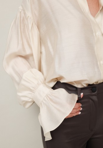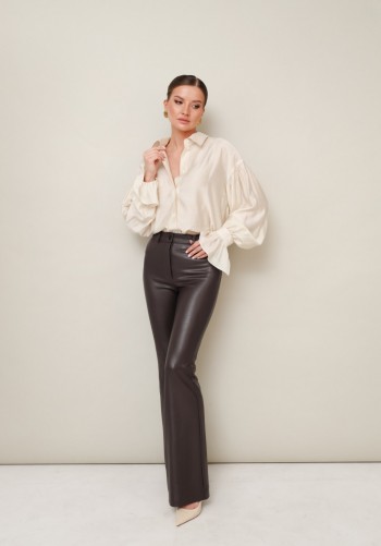 Жакет женский из мягкой костюмно-плательной ткани с креш-эффектом, свободного силуэта, длиной ниже линии бедер, со спущенной линией плеча, с втачными рукавами, в боковых швах обработаны разрезы, со съемным поясом. Детали переда жакета с отрезными бочками. Деталь спинки жакета с втачной стойкой, переходящей на перед. Рукава втачные одношовные, широкие. По боковым швам на уровне линии талии прикреплены шлевки для протяжки съемного пояса. Брюки на бедрах, облегающие вверху и прямые к низу, с притачным поясом, в который вставлена эластичная тесьма. На передних половинках брюк в боковых швах обработаны наклонные карманы. Жакет: длина рукава – 51,5см, ширина рукава – 26см, длина спинки – 75,5см. Брюки: длина по боковому шву – 106см.