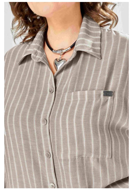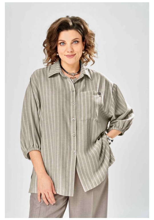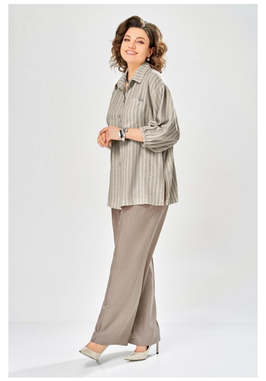 Интересный комплект, состоящий из блузы свободного силуэта и брюк прямого кроя. Блуза с центральной застежкой на петли и пуговицы, воротником рубашечного типа. Рукав спущенный, по низу резинка, длина 3/4. Слева накладной карман, разрезы в боковых швах. Брюки со стрелками, карманы в боковых швах, пояс частично на резинке. Длина блузы 72см, длина брюк 109см.