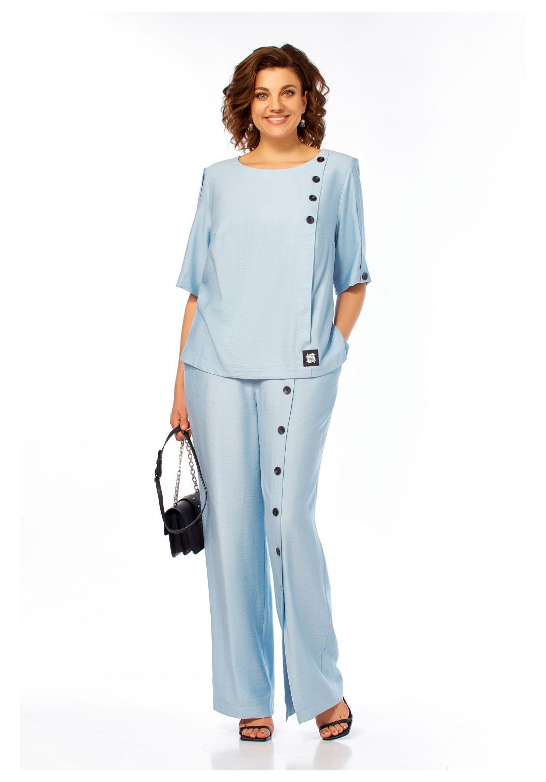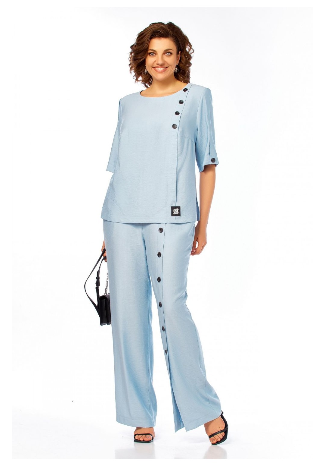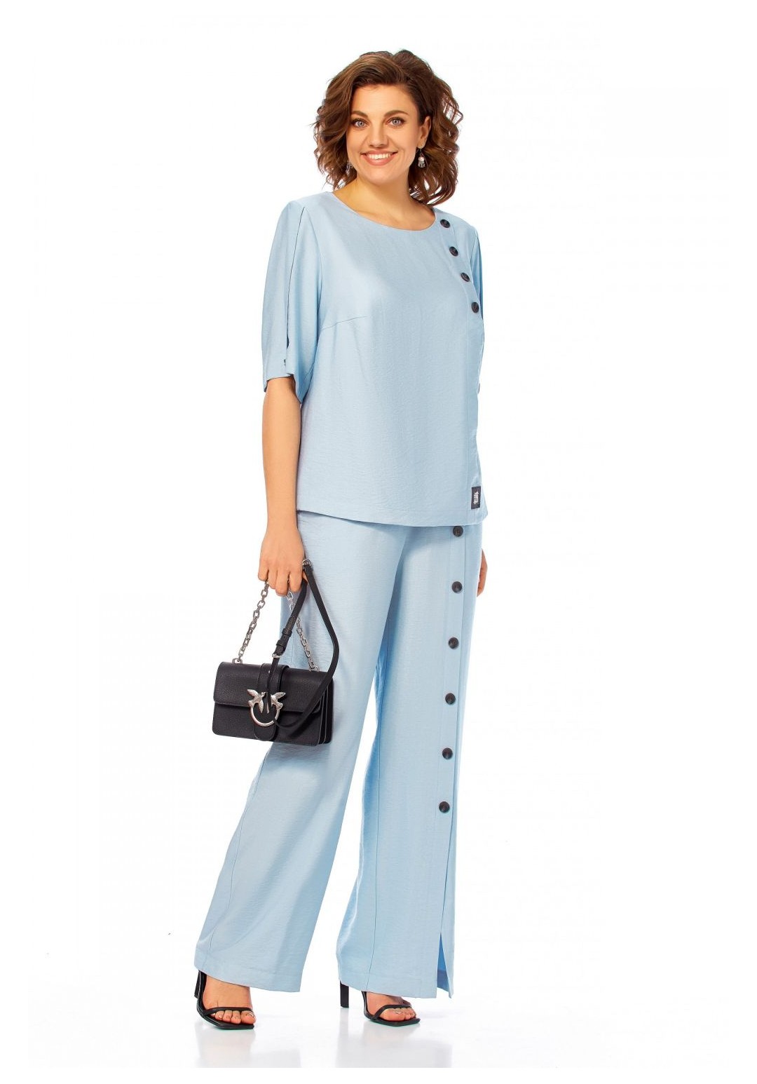 Интересный легкий костюм, состоит из блузы и брюк. Блуза полуприлегающего силуэта, с округлым вырезом горловины. Нагрудные вытачки, слева заложена декоративная складка с пришитыми пуговицами и отделочной нашивкой. Спинка со средним швом и застежкой на петлю и пуговицу. Разрезы в боковых швах. Рукав короткий, по центру со складкой и пуговицей. Брюки прямого силуэта, с карманами в боковых швах. Пояс притачной, частично на резинке. На левом полотнище обносторонняя складка от пояса до низа с пришивными декоративными пуговицами. Длина блузы 58см, длина рукава 33,5см, длина брюк 110см.