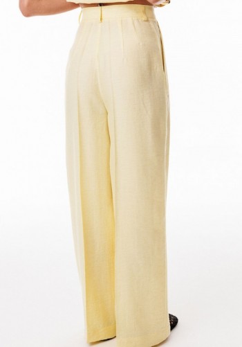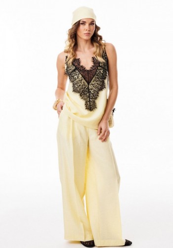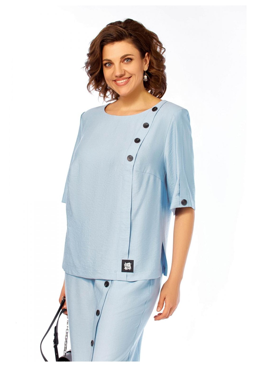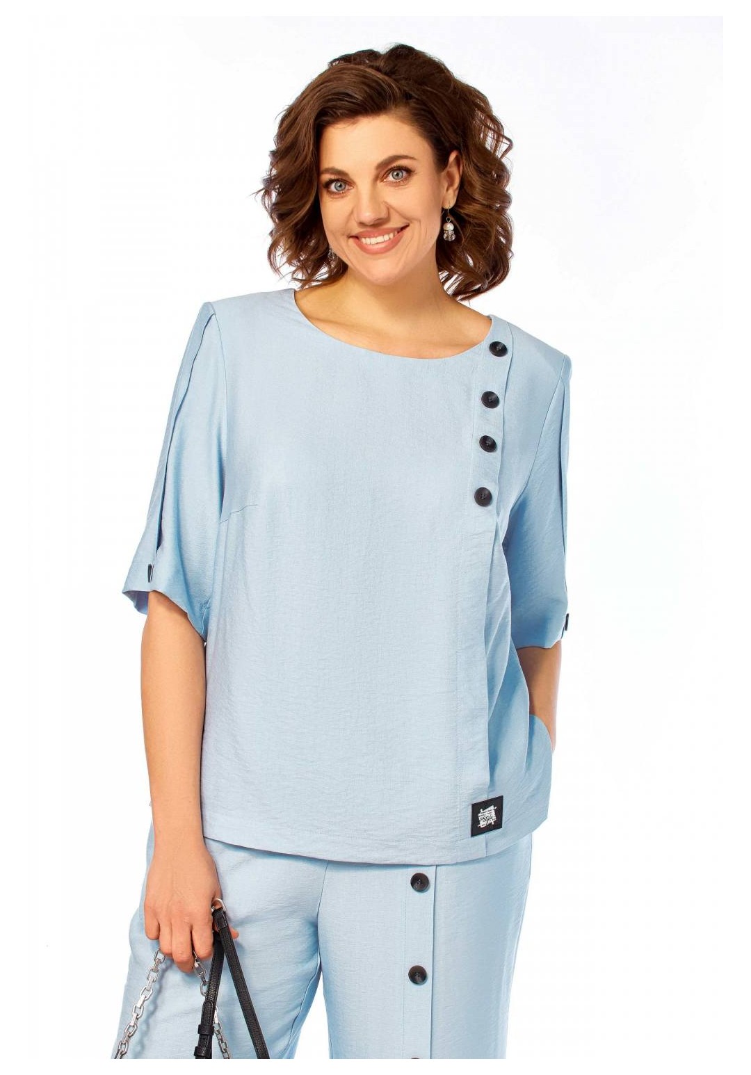 Интересный легкий костюм, состоит из блузы и брюк. Блуза полуприлегающего силуэта, с округлым вырезом горловины. Нагрудные вытачки, слева заложена декоративная складка с пришитыми пуговицами и отделочной нашивкой. Спинка со средним швом и застежкой на петлю и пуговицу. Разрезы в боковых швах. Рукав короткий, по центру со складкой и пуговицей. Брюки прямого силуэта, с карманами в боковых швах. Пояс притачной, частично на резинке. На левом полотнище обносторонняя складка от пояса до низа с пришивными декоративными пуговицами. Длина блузы 58см, длина рукава 33,5см, длина брюк 110см.